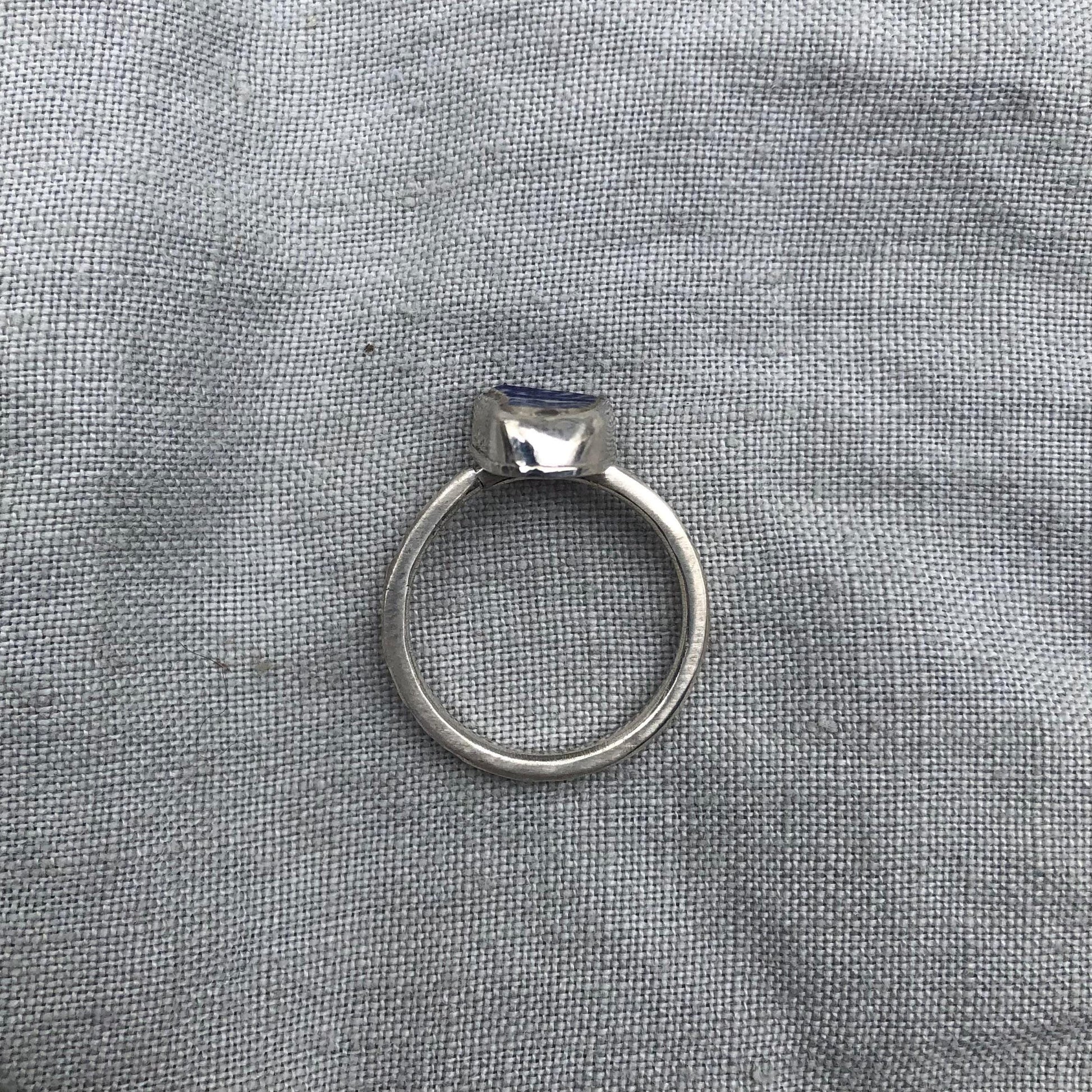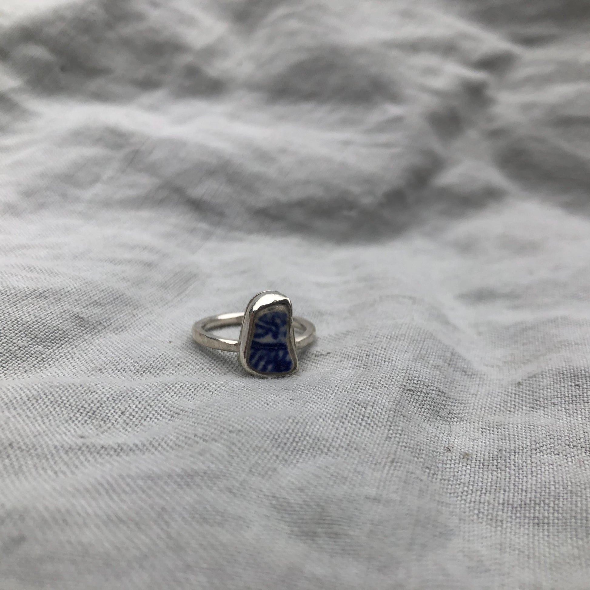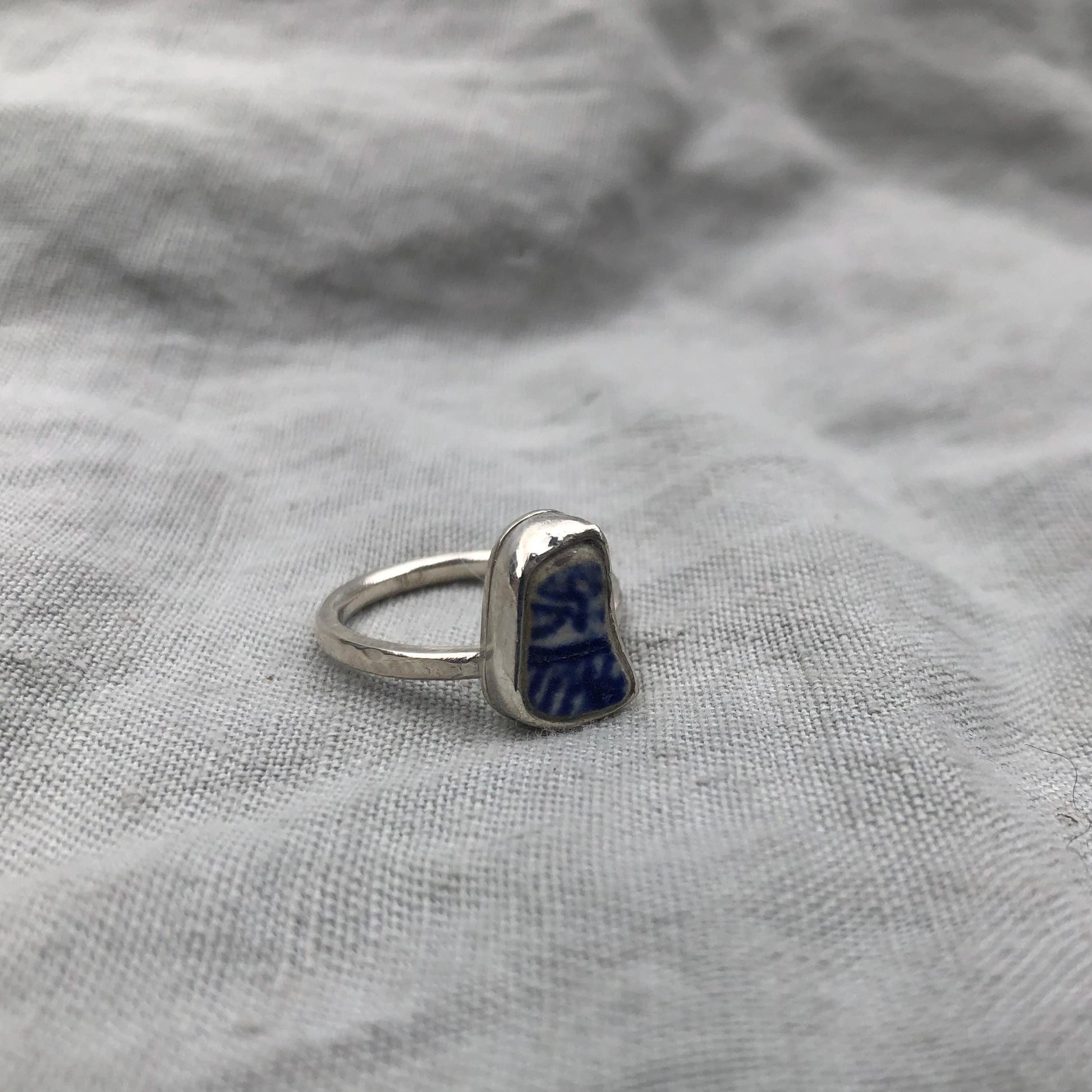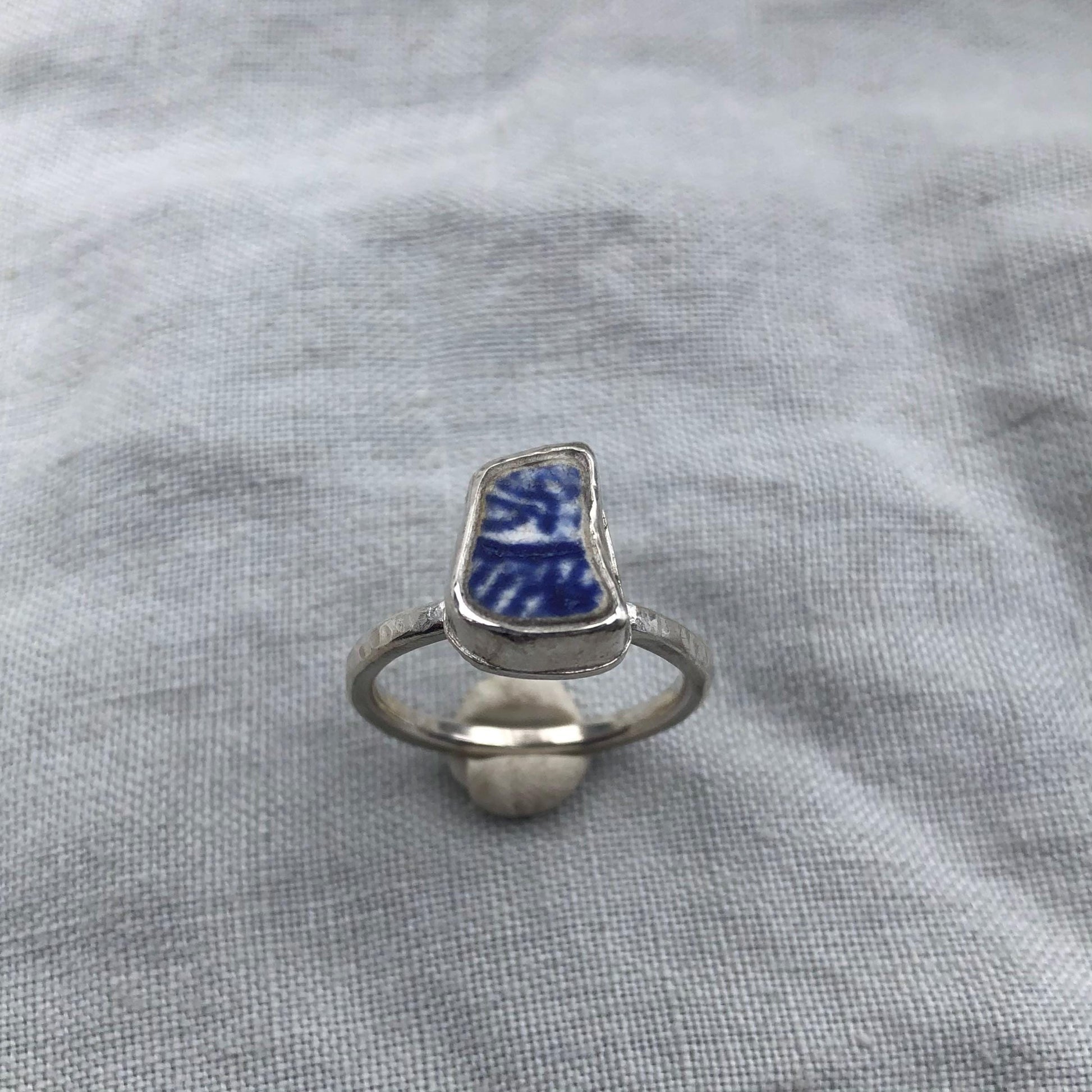 Blue and white sea pottery ring in argentium sterling silver // Beach found ceramic ring // U.S. size 6 1/4