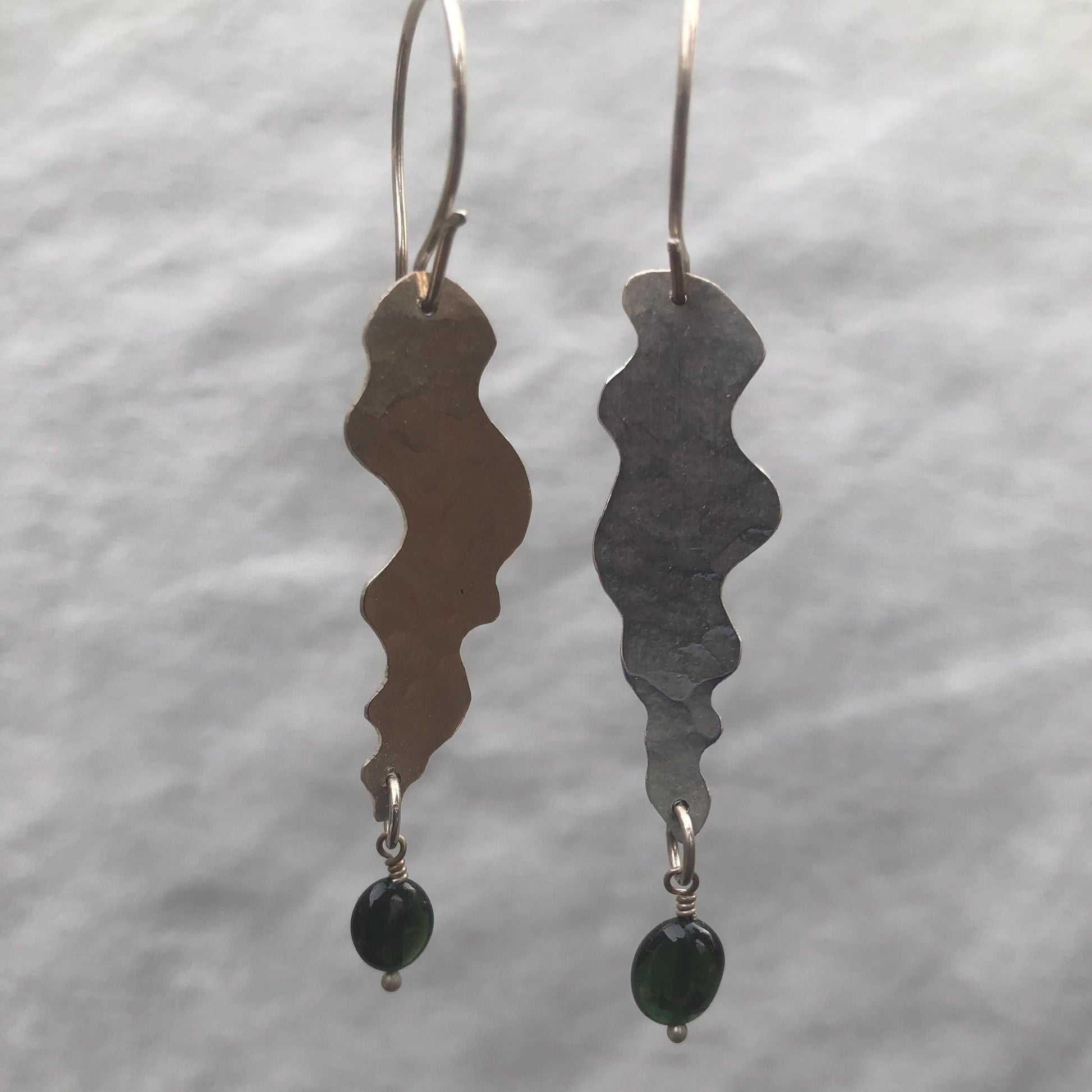Handmade by me in my Connecticut studio. The green of these vintage old-mine beads is hard to capture in the light box. They are a deep but very transparent forest green, not a blue-green, not a yellow- or brownish-green. They are *green*. Featuring wavy squiggles of hammered argentium sterling silver, these earrings make a statement whether worn for everyday or a special occasion.