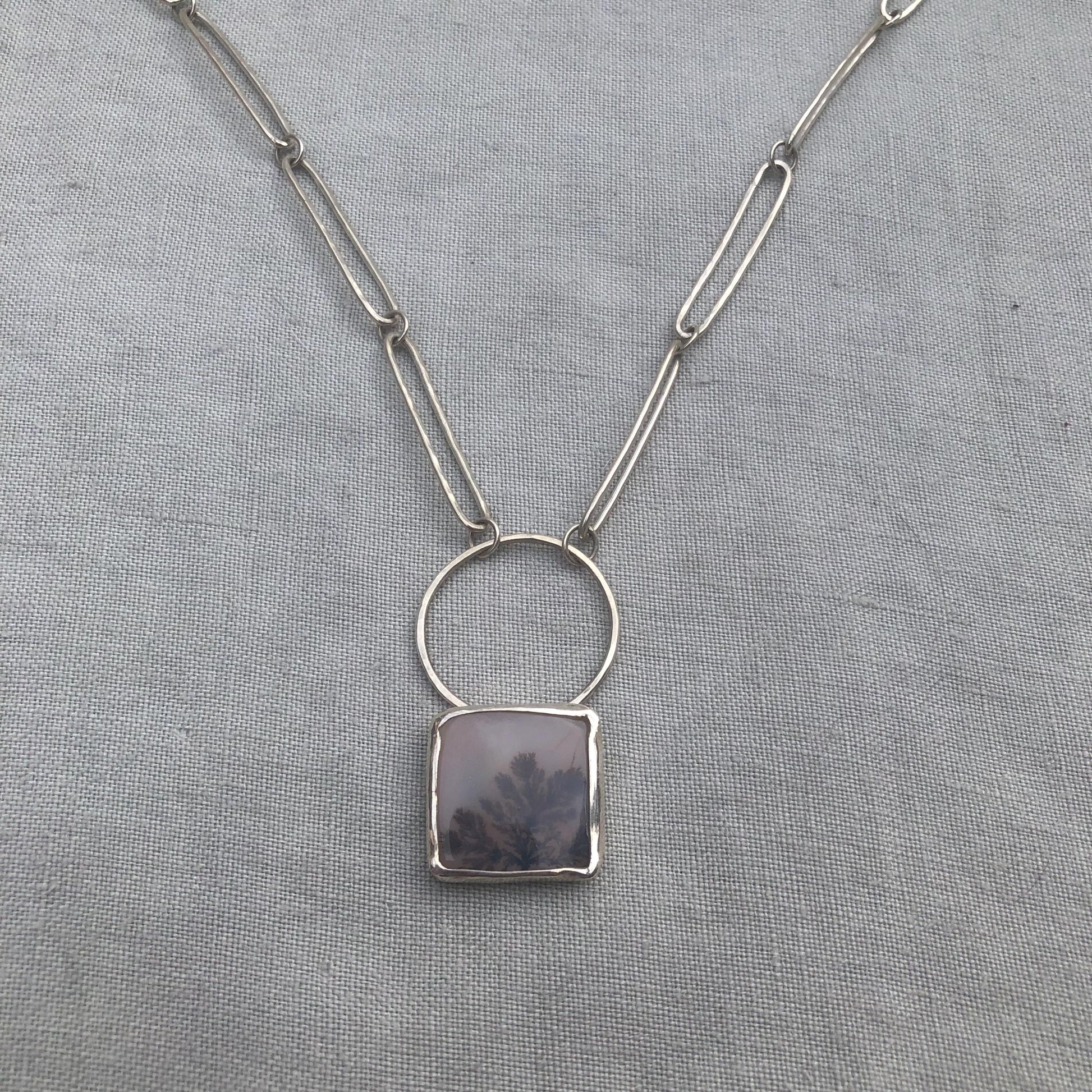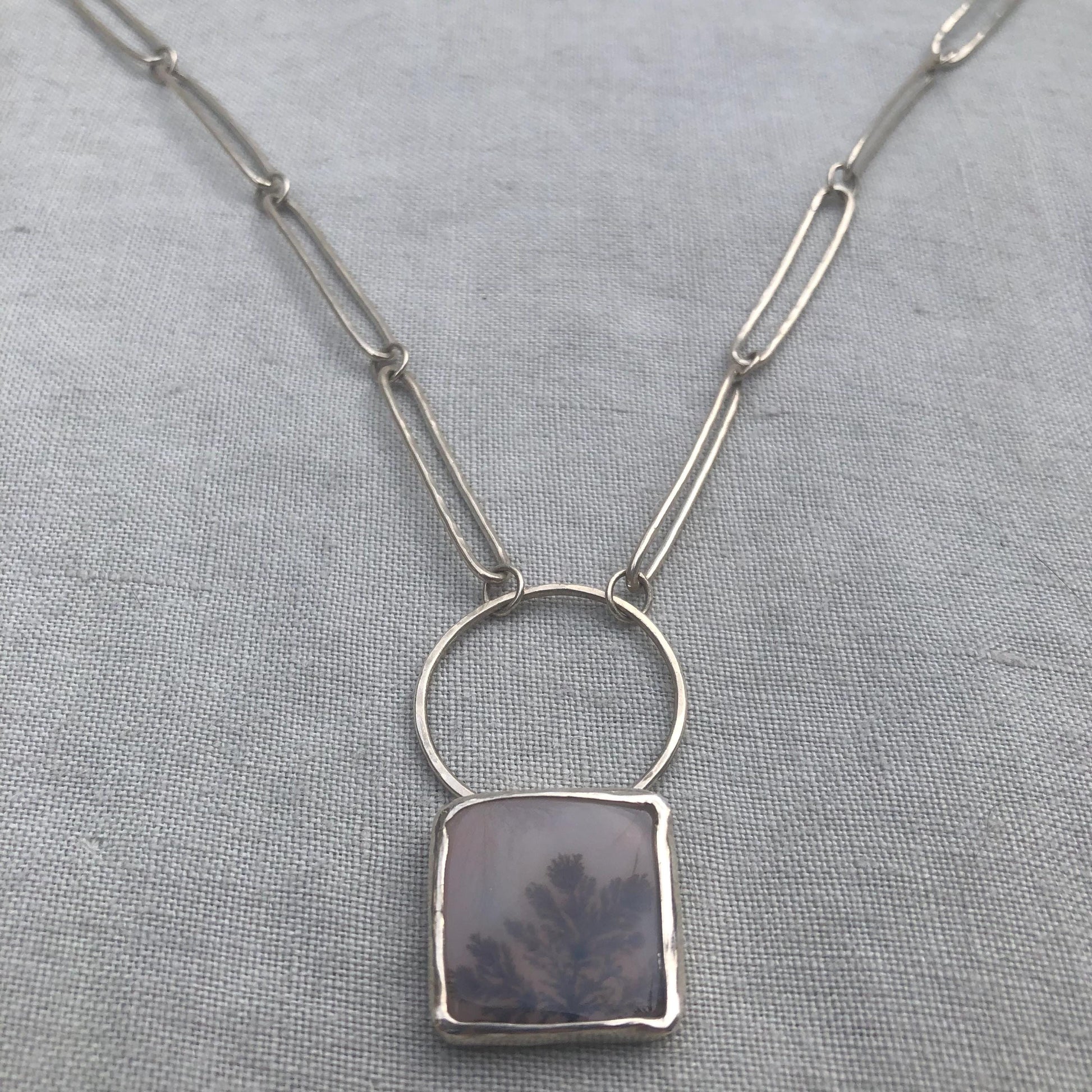 Designed and handmade by me in my Connecticut, USA studio. A purplish, misty-looking dendritic agate is the center and inspiration for this piece. The back of the pendant features a crescent moon cutout. It can only be seen with light behind it--a little secret for the wearer. Like a tree at moonrise. Handmade paperclip chain in hypoallergenic argentium sterling silver. Whimsical, romantic, and one of a kind.
