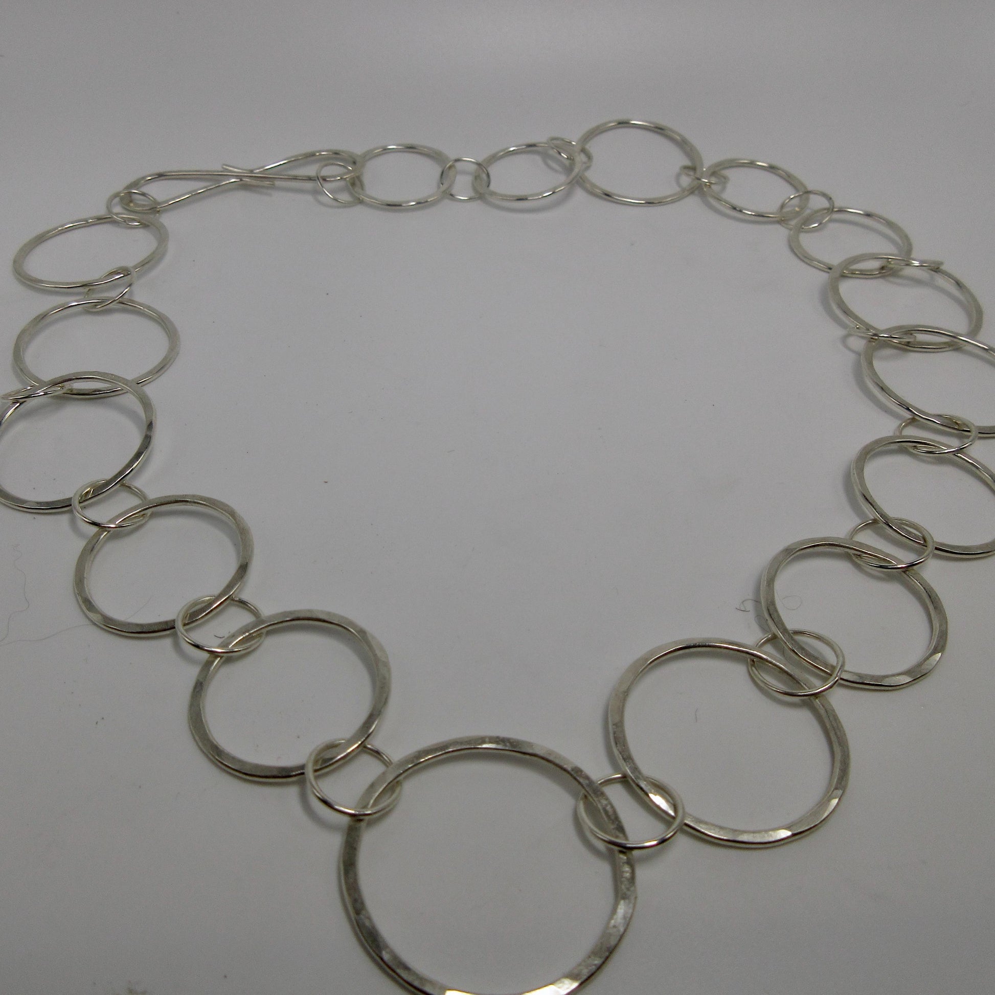 The chain for this necklace is handmade and consists of circular hammered links of different sizes in argentium sterling silver. The chain can be worn with or without the pendant, and the pendant can be moved to any link on the chain, so the decorative handmade clasp can be worn at the back or featured in the front or on one side.