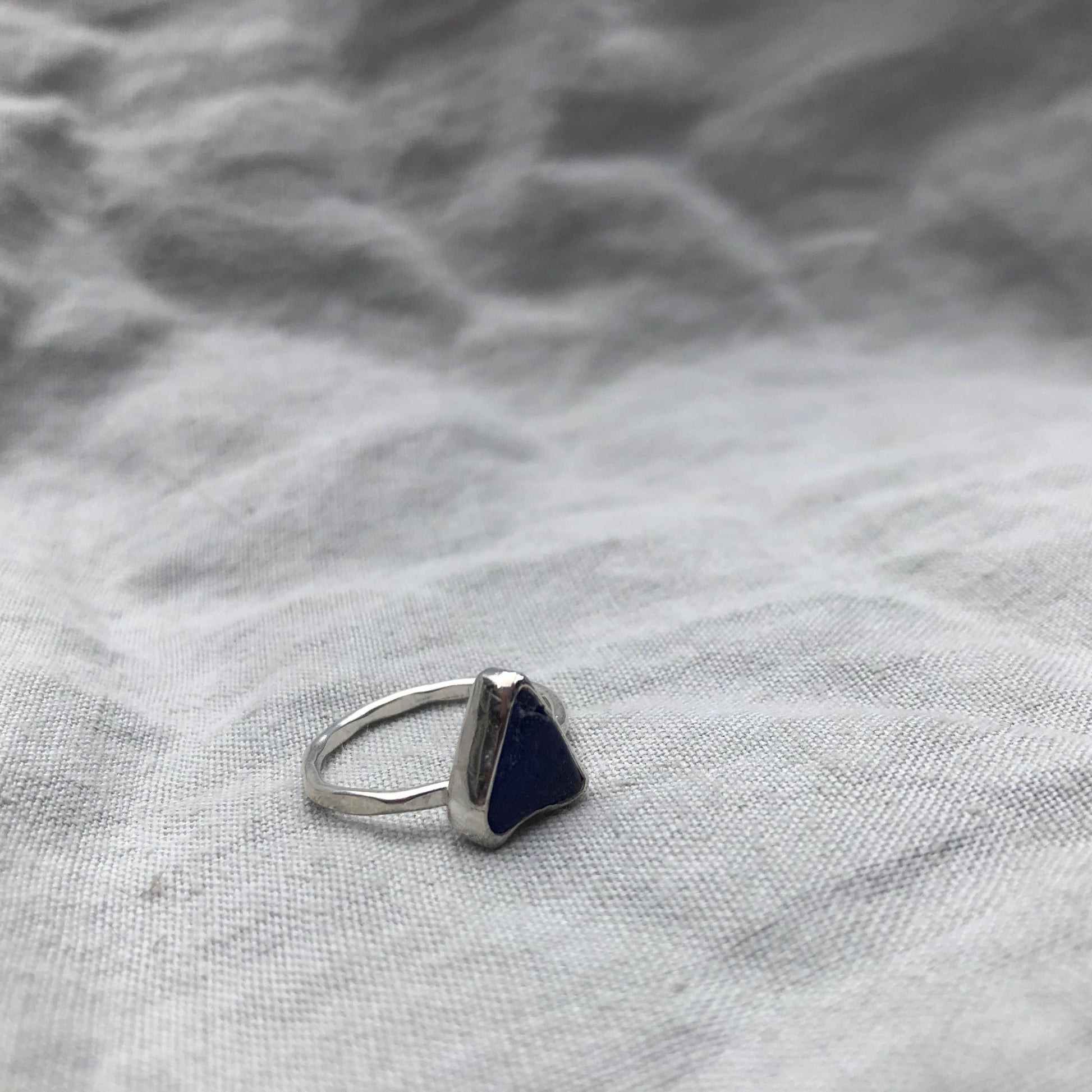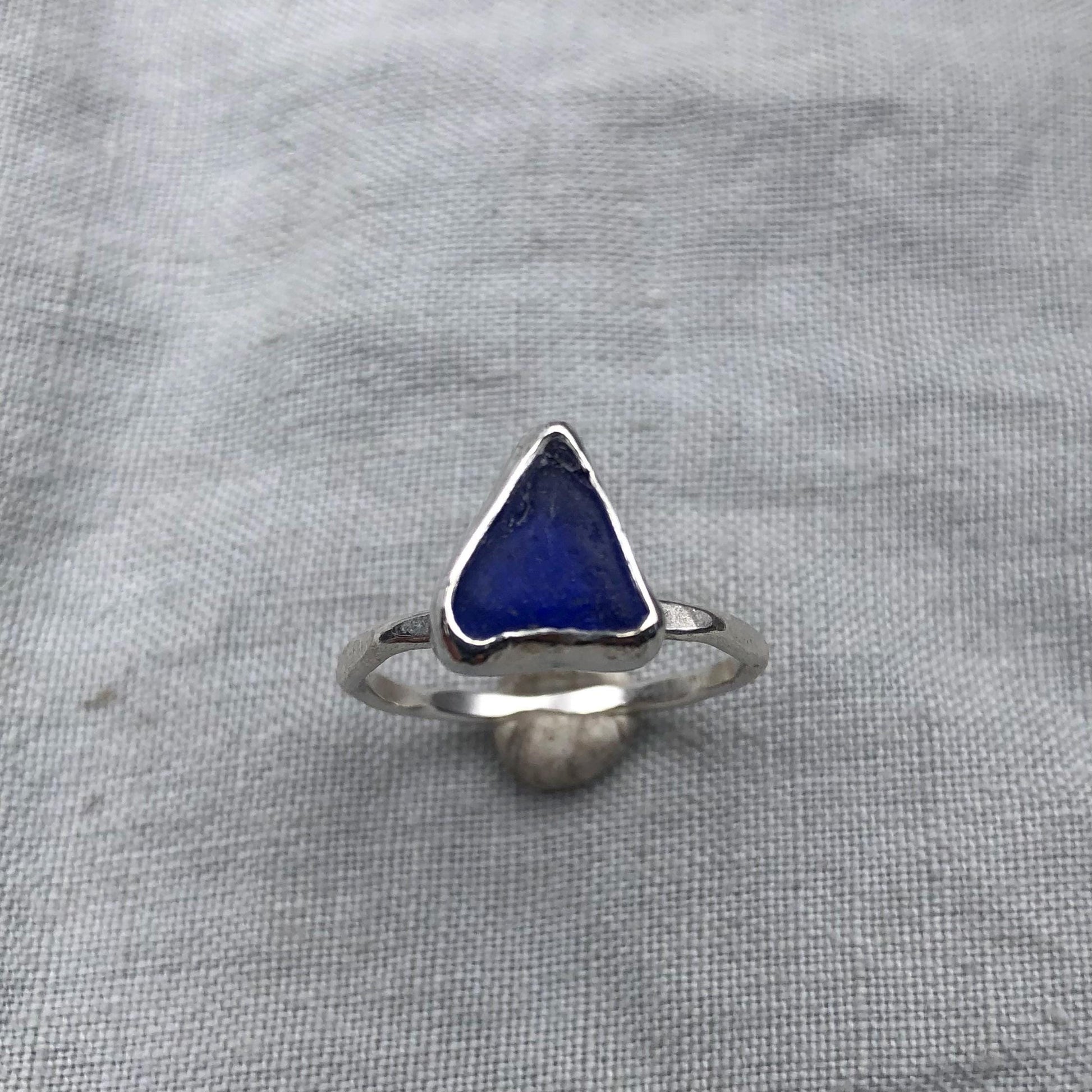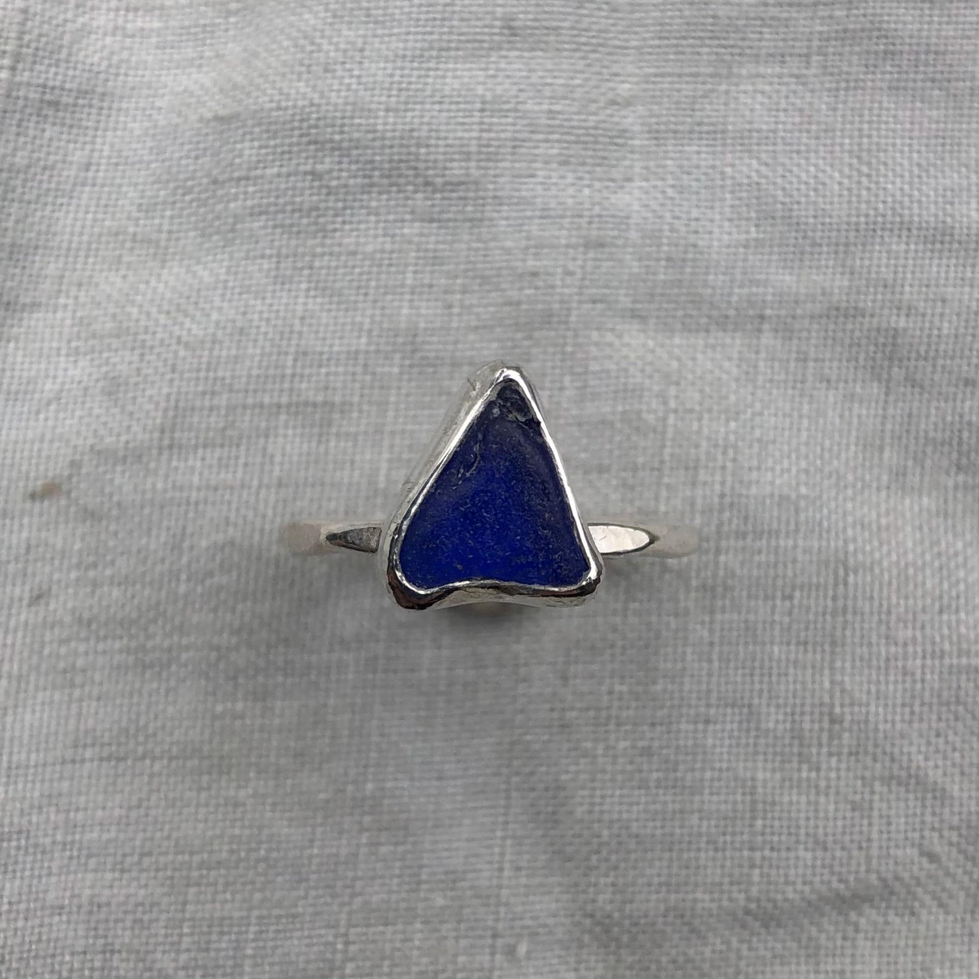 Entirely handmade by me in my Connecticut studio, this ring takes its shape from the shape of the sea glass as it was found. Other than flattening the back slightly, I did not alter the glass in any way. The sea glass featured in the ring is a brilliant electric blue.