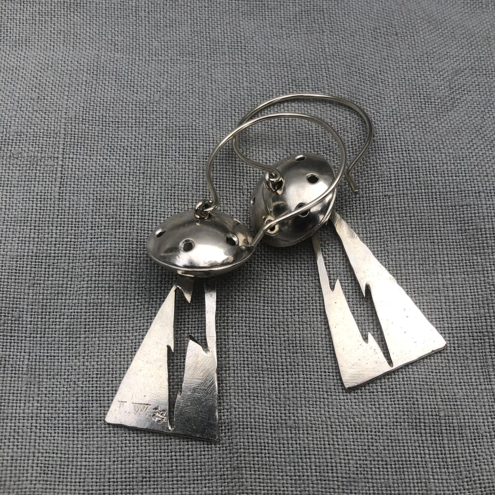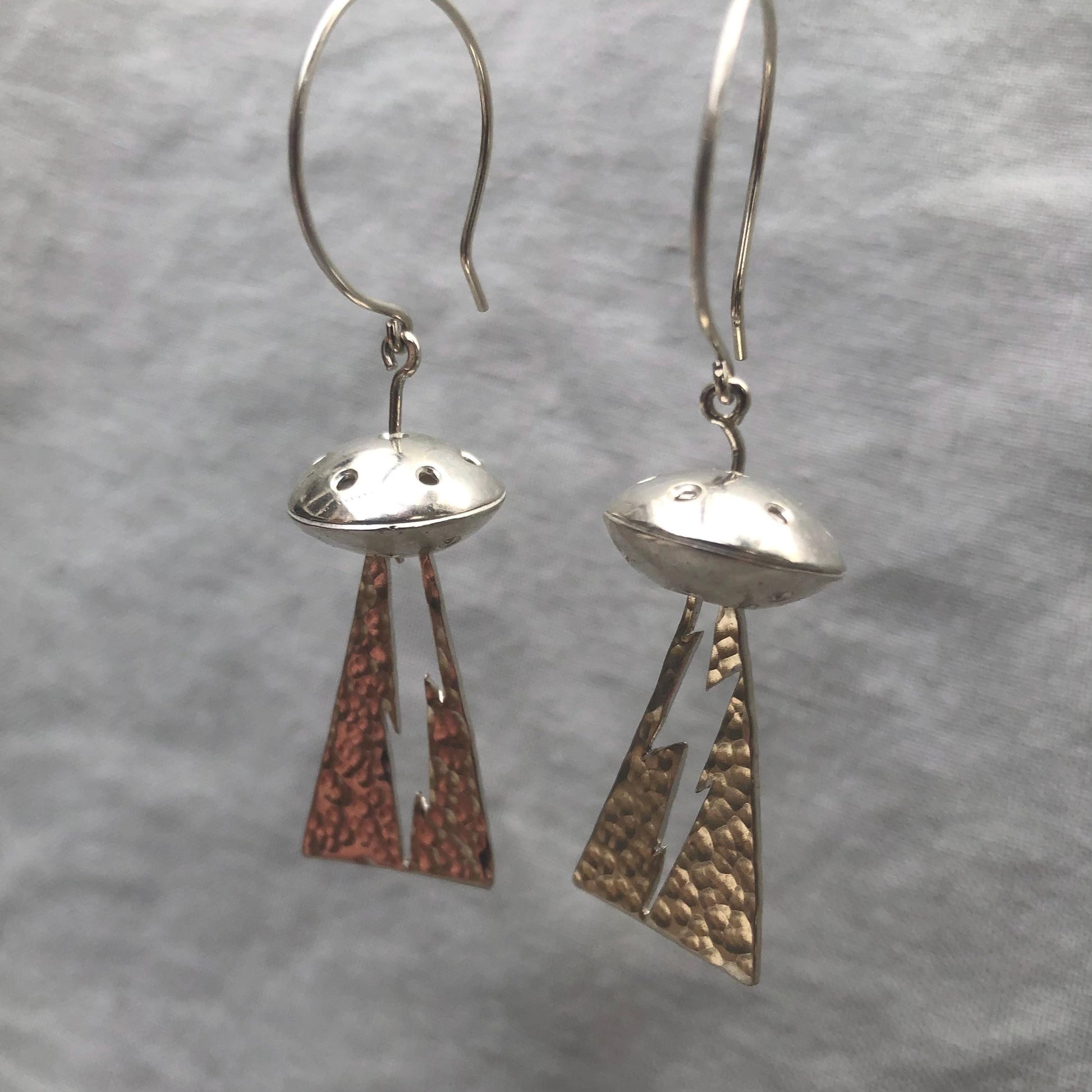 Designed, cut, drilled, and hammered entirely by me in my Connecticut studio, these flying saucer earrings were inspired by my love of the X-Files. Zap! Careful, they're attacking--but they are very small, so we should be okay. The truth is out there.