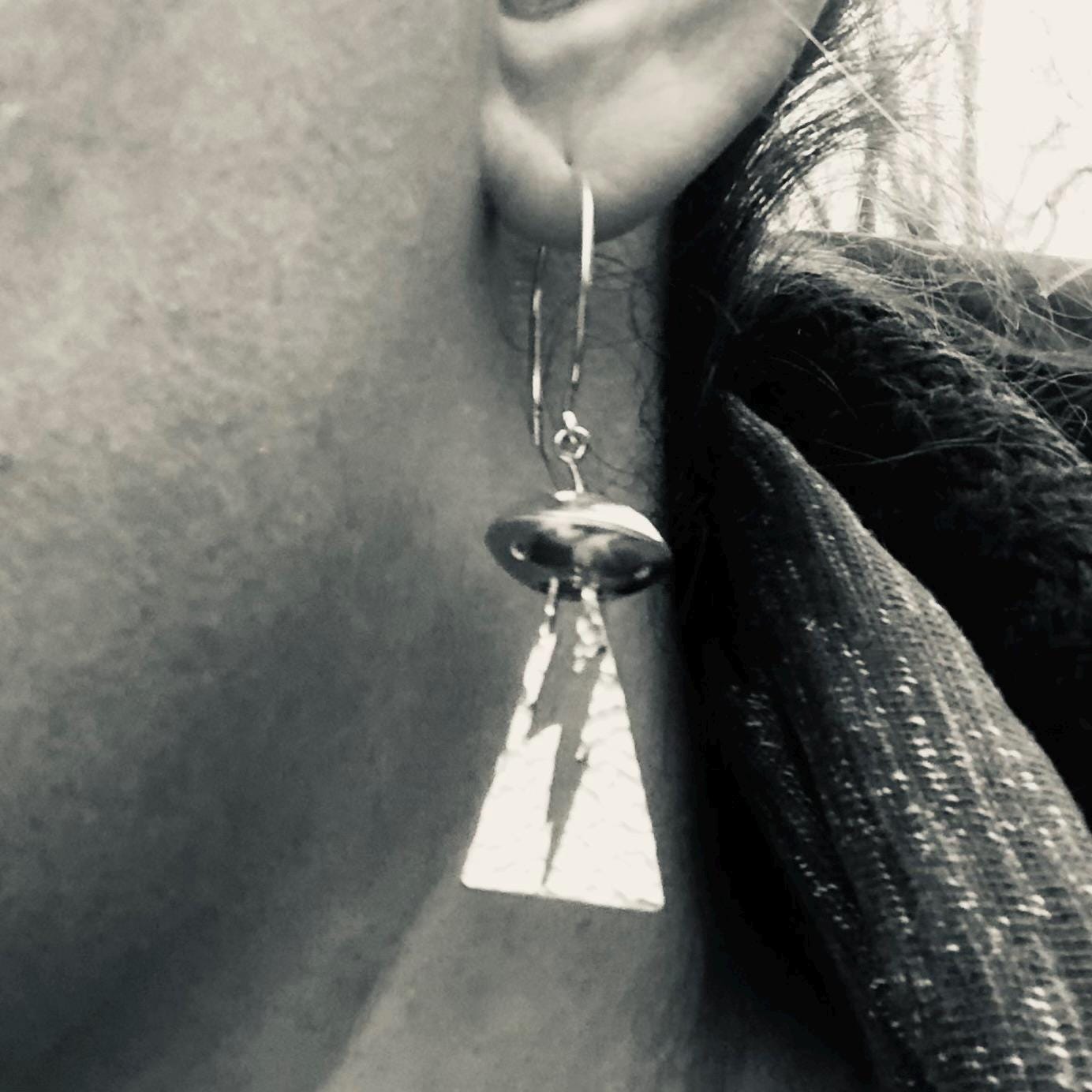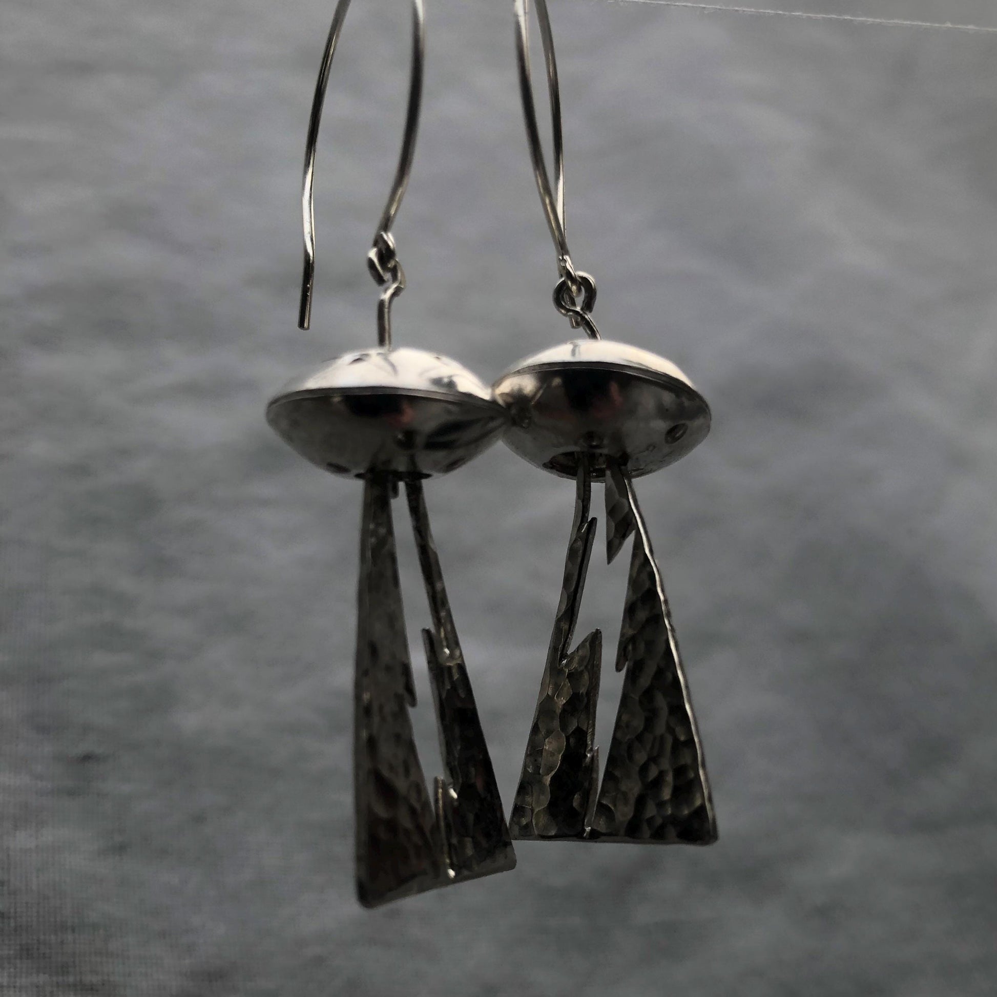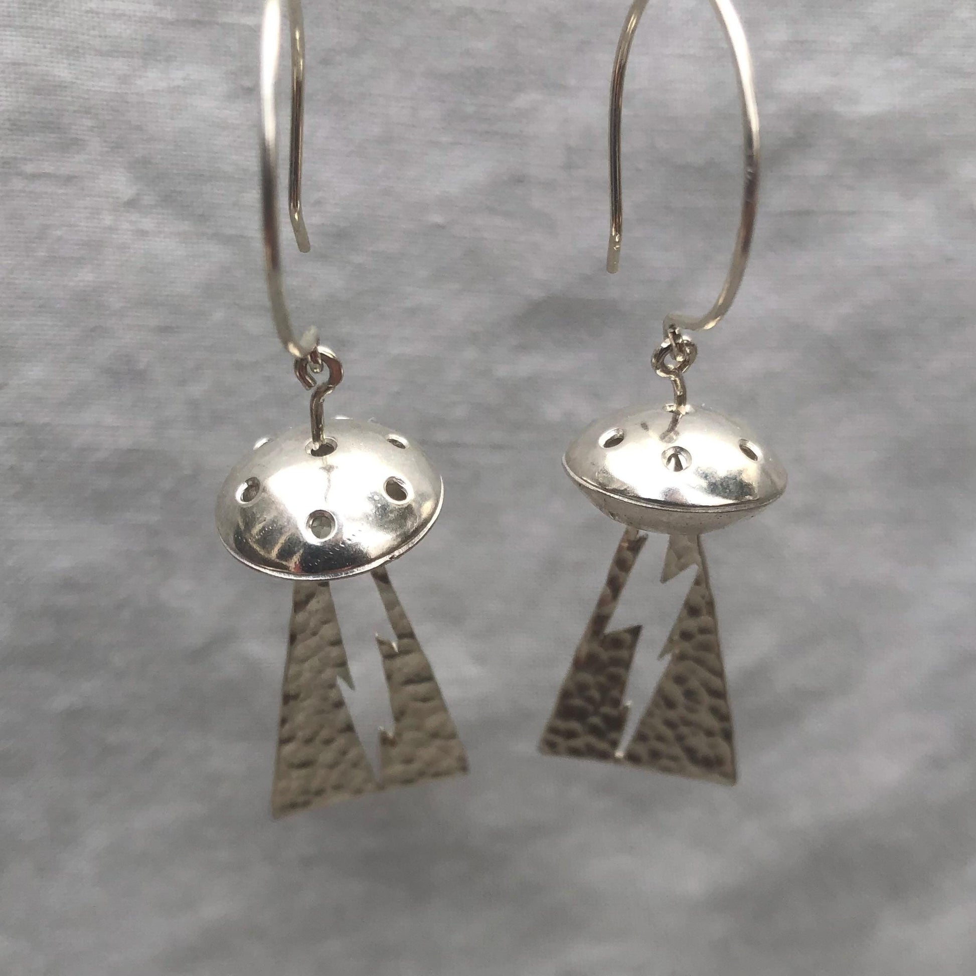 Independently moving tractor beams with cut-out lightning bolts dangle from an invisible spot inside the flying saucers, which also move independently. Large open hoops. Made in the USA in argentium sterling silver.