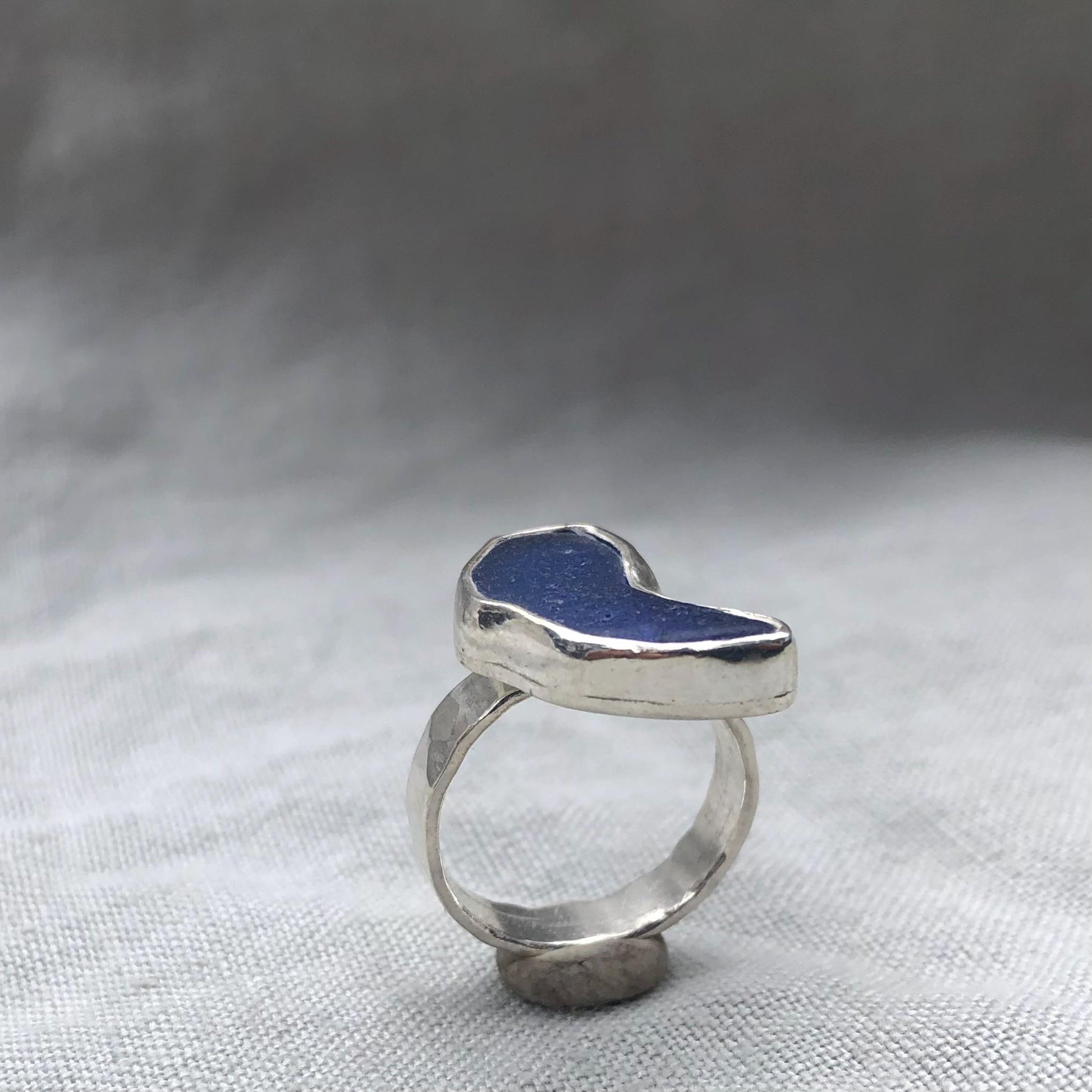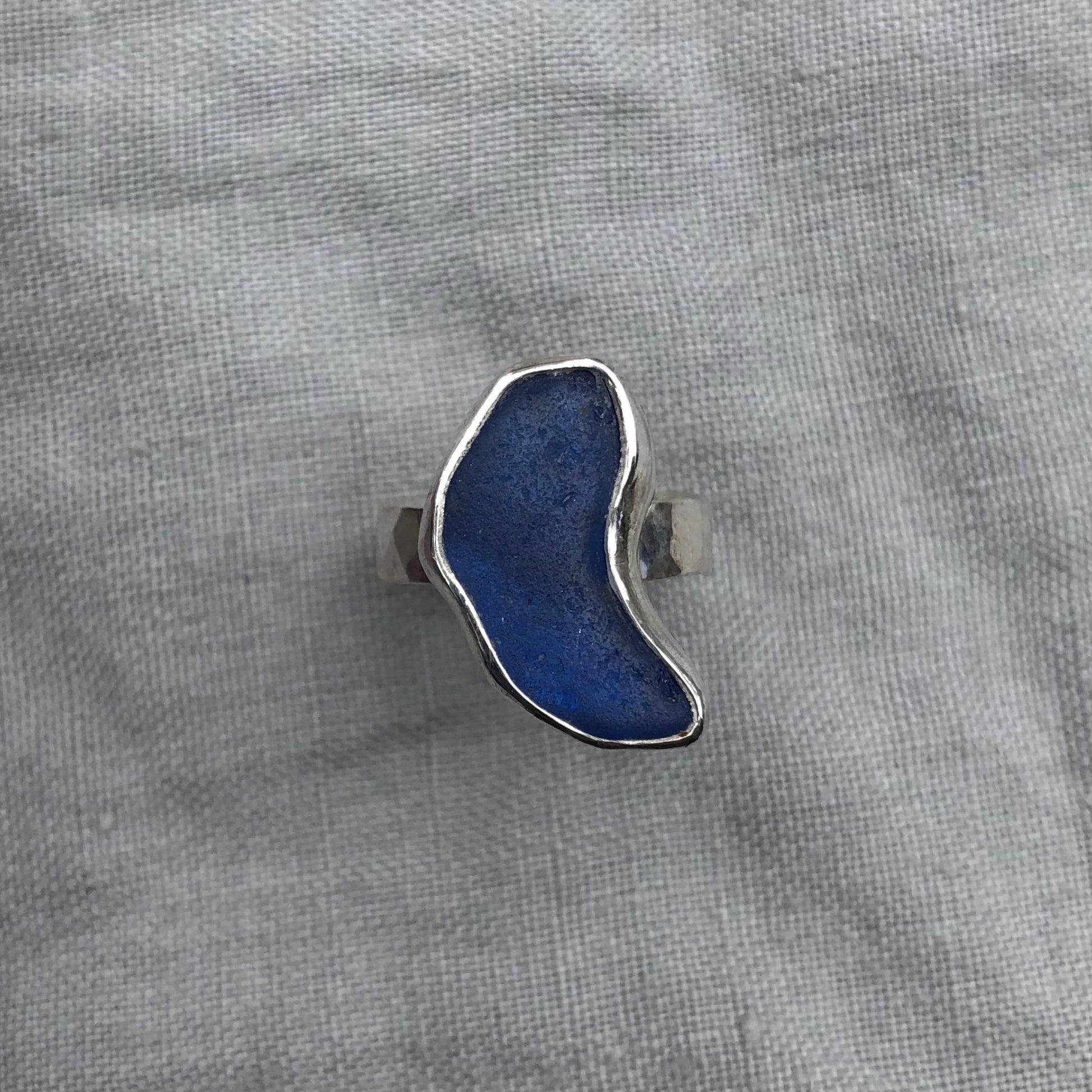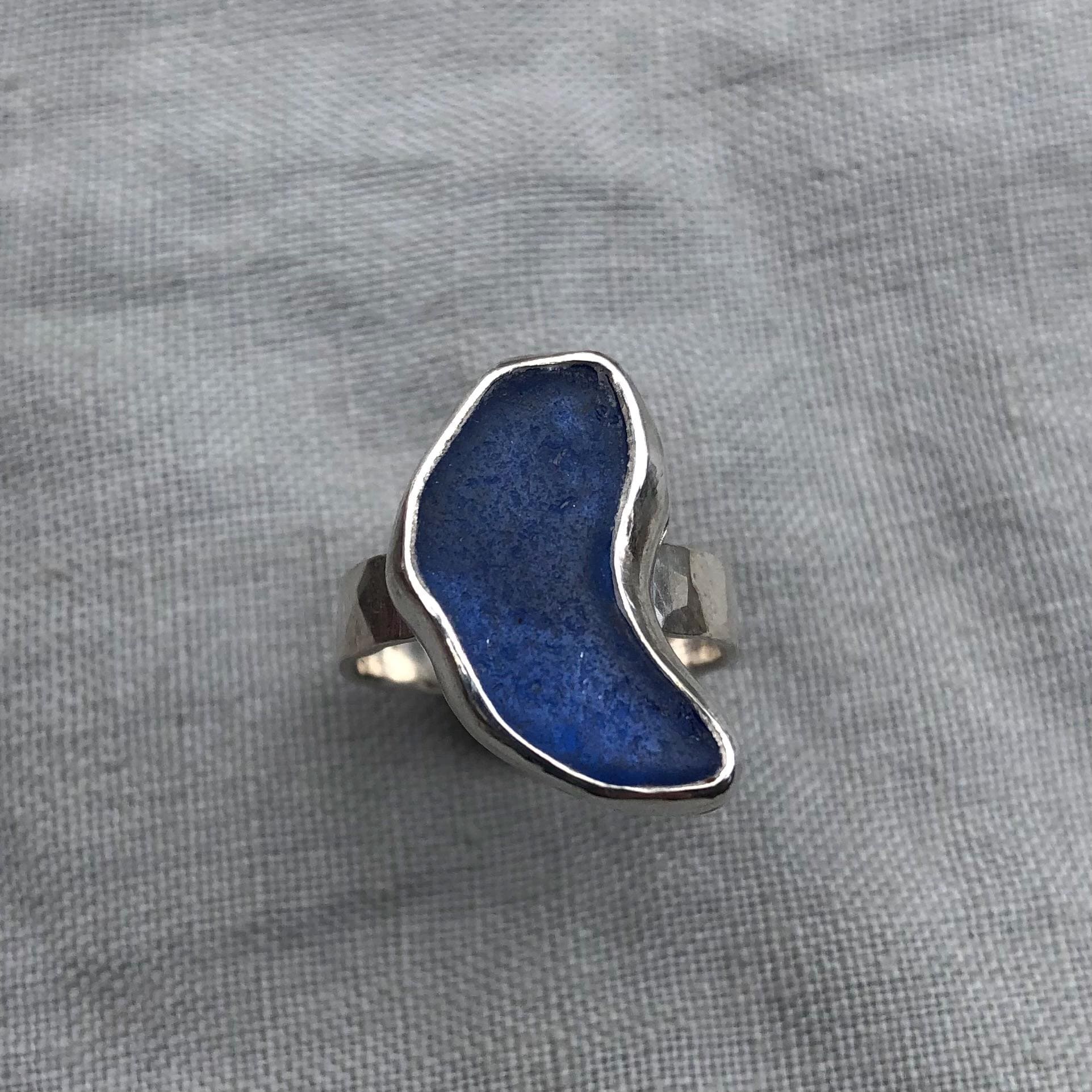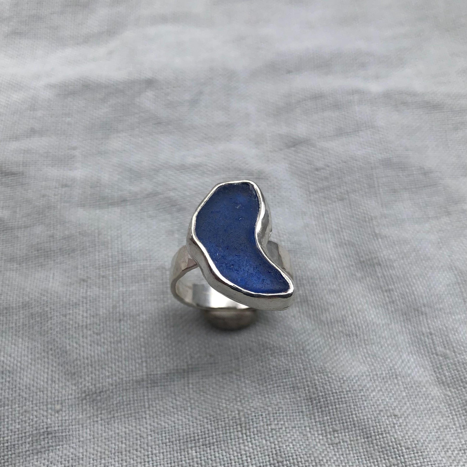Entirely handmade by me in my Connecticut studio, this ring takes its shape from the shape of the sea glass as it was found. Other than flattening the back slightly, I did not alter the glass in any way. The sea glass featured in the ring is a bright cobalt blue.