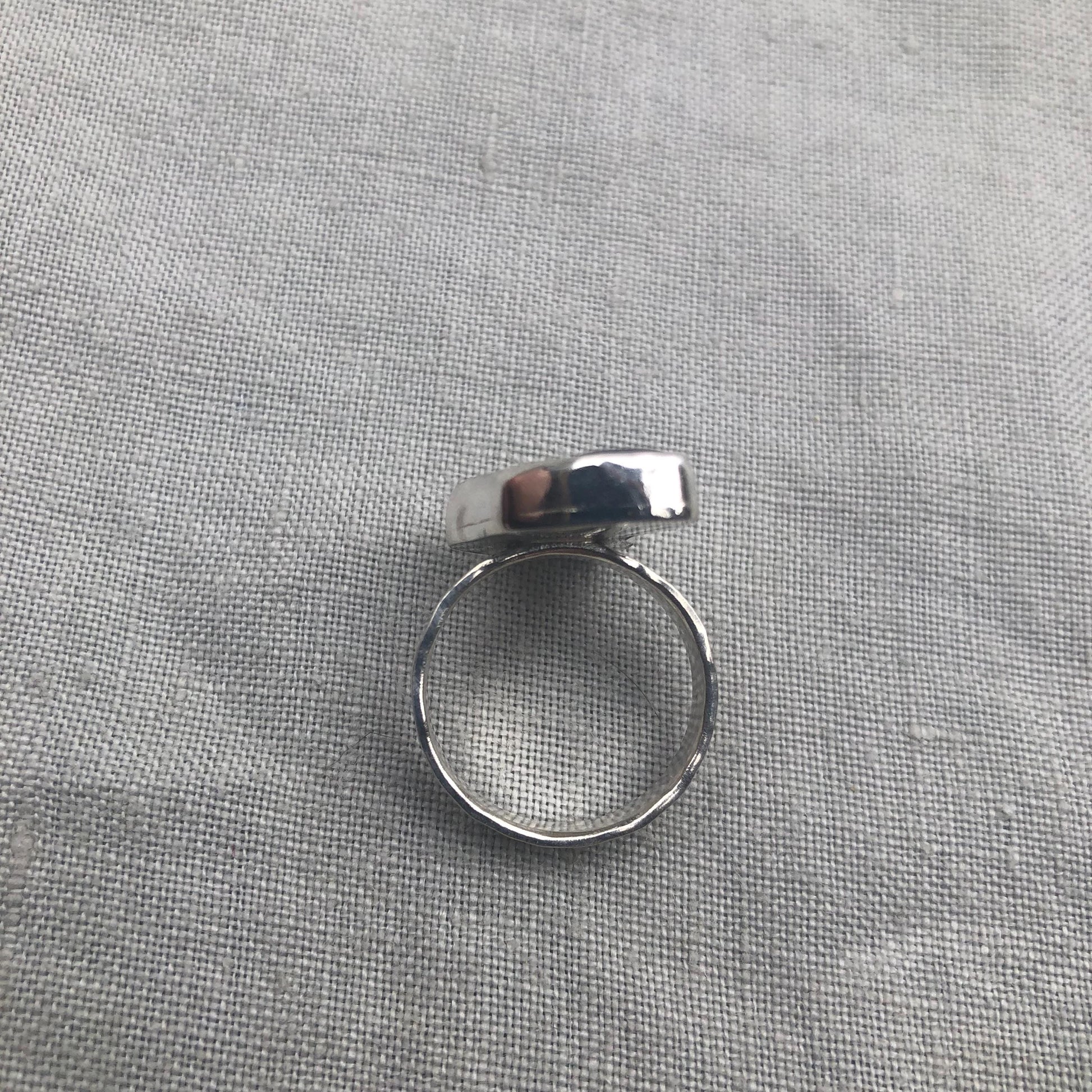 The setting and band of this ring are made from argentium sterling silver and fine silver. Argentium sterling silver is a patented type of sterling with more pure silver than regular sterling silver (94% vs. 92.5%). It resists tarnish, finishes hard, and exhibits a bright silver color. It is hypoallergenic and contains no nickel.