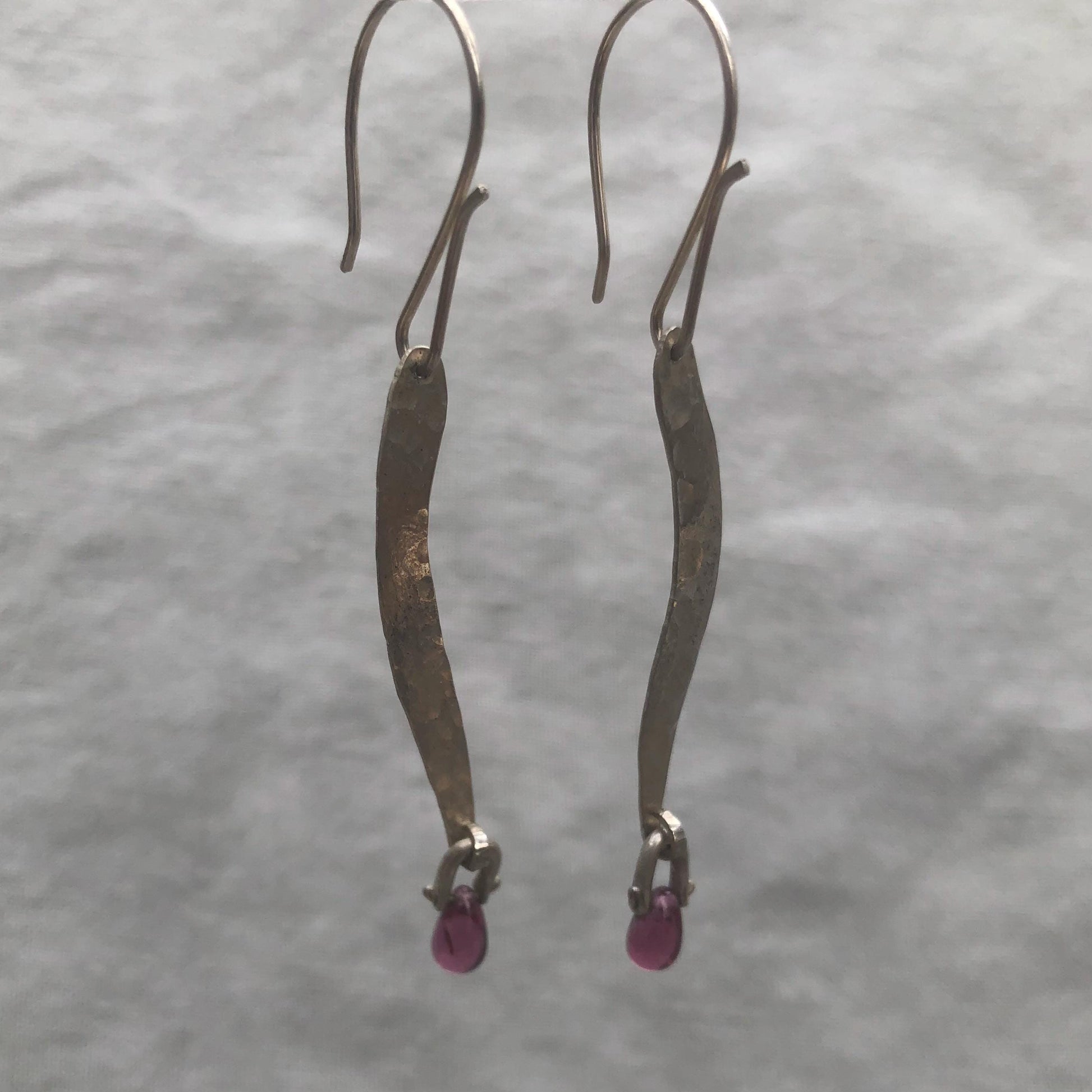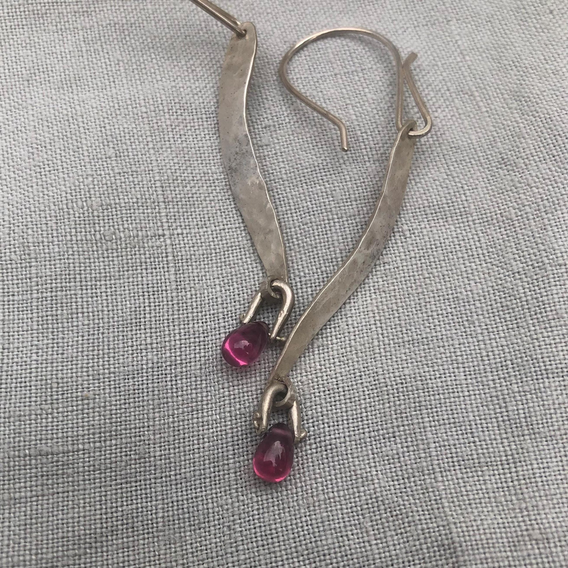 Handmade, hand-hammered, and the little stirrups for the garnets were handmade as well. All work was done by me in my Connecticut studio. I was lucky enough to get my hands on some of the most beautiful rhodolite garnet beads I have ever seen. They look like pomegranate seeds. They are a remarkably clear, slightly purplish red. Dangling from long curves of hammered argentium sterling silver, they combine subtlety with panache.
