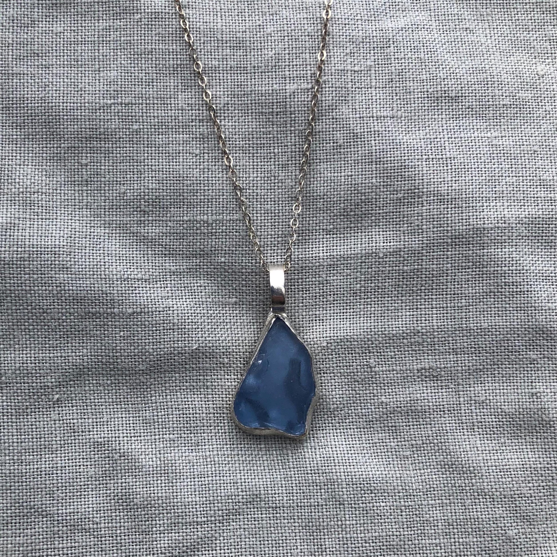 The sea glass featured in this necklace comes from my mother's curated lifetime collection. She found most of the glass on the beaches of Washington state, with some pieces from Oregon and California.