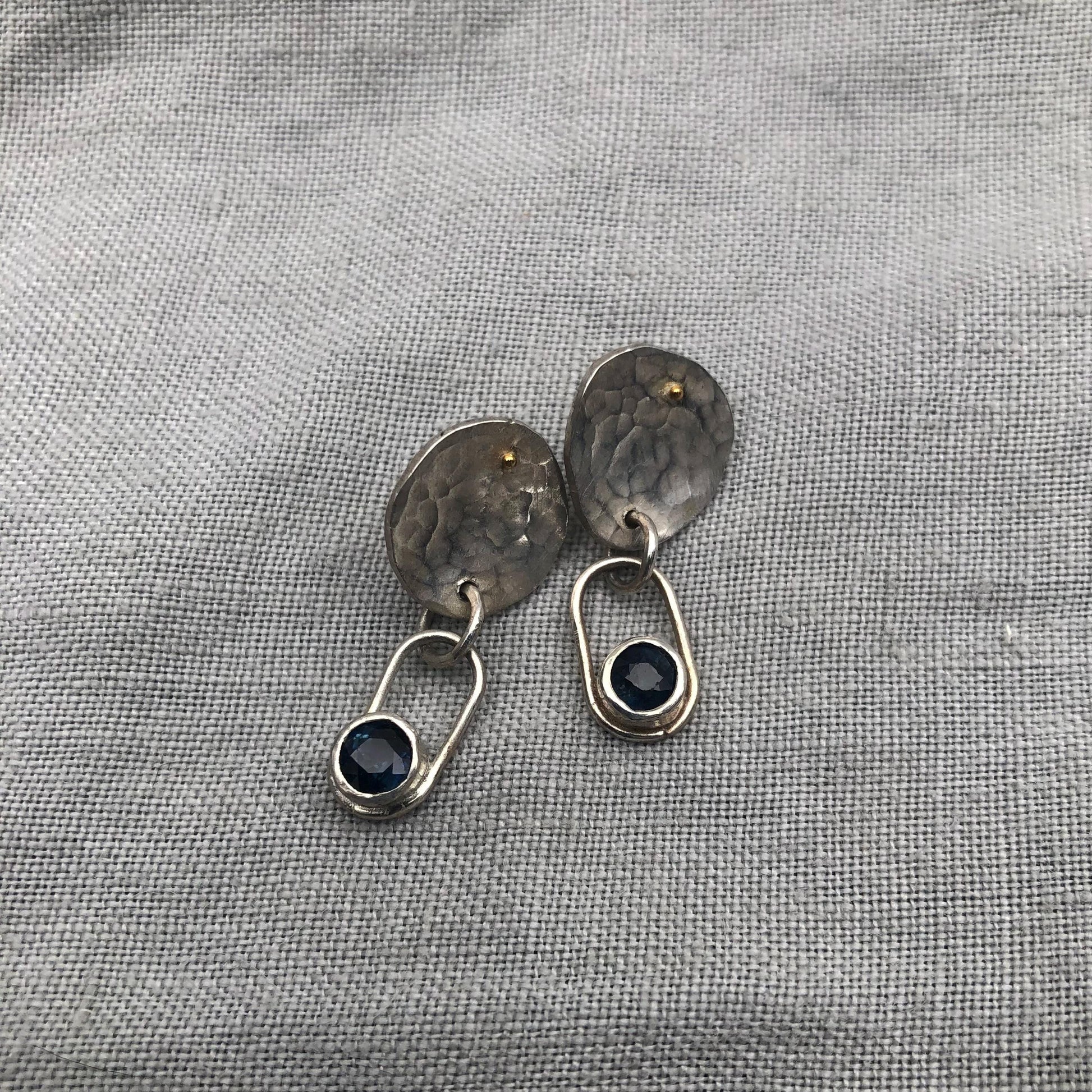 Handmade by me in my Connecticut studio. These post earrings feature dark blue sapphires dangling from hammered discs of argentium sterling silver. Tiny spheres of 24 karat gold sit at the top of the silver discs. The sapphires are heat-treated, but no other treatments were used.