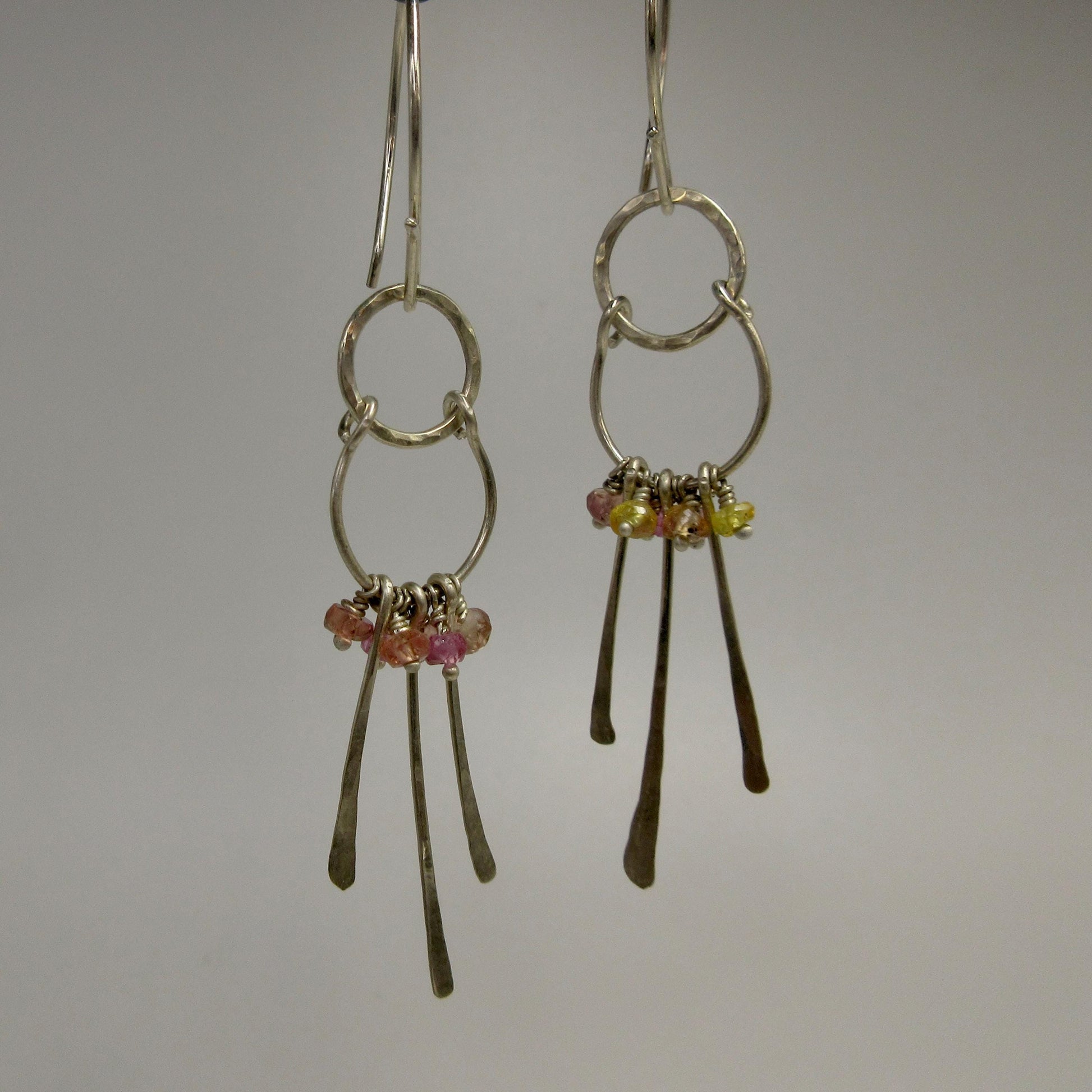Entirely handmade by me in my Connecticut studio and one of a kind. Sparkling purple, pink, peach, and yellow sapphire beads cluster on these geometric yet fluid earrings. Simple hooks. Hammered dangling fringe interspersed with multicolored sapphires. Each of the components moves independently. Sapphire is the birthstone for September.