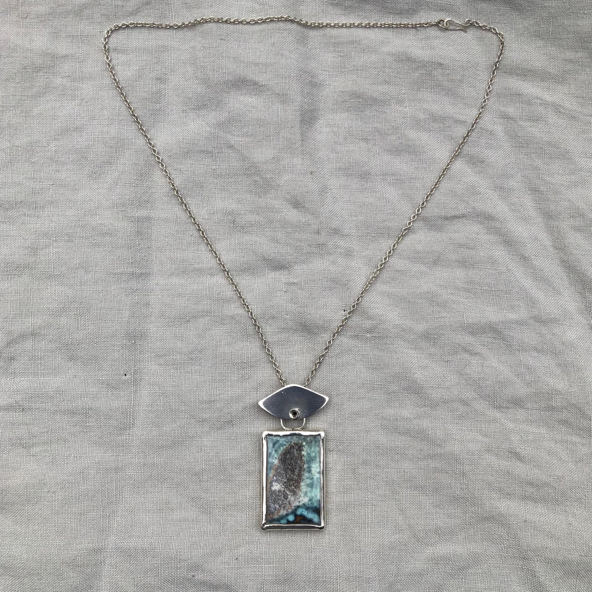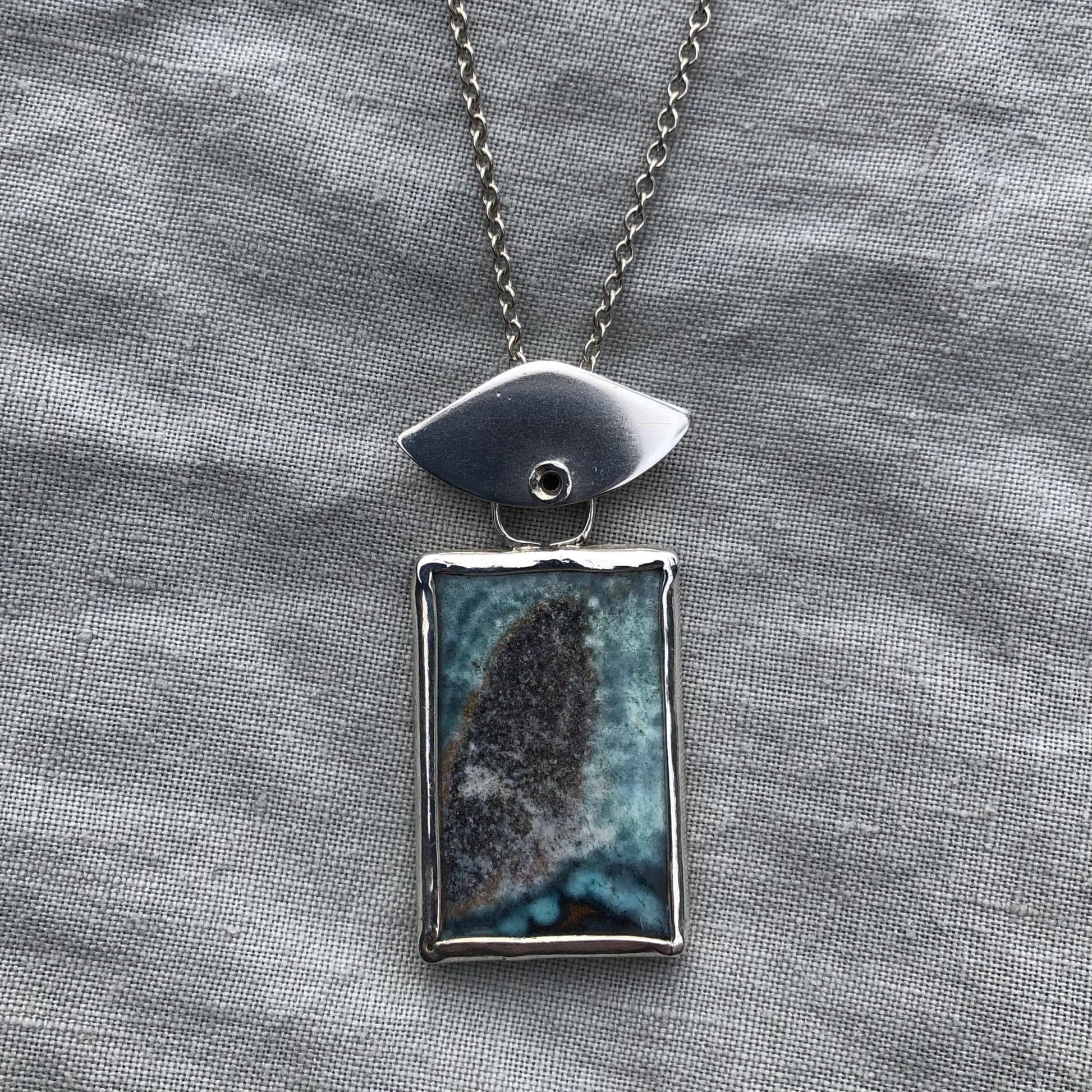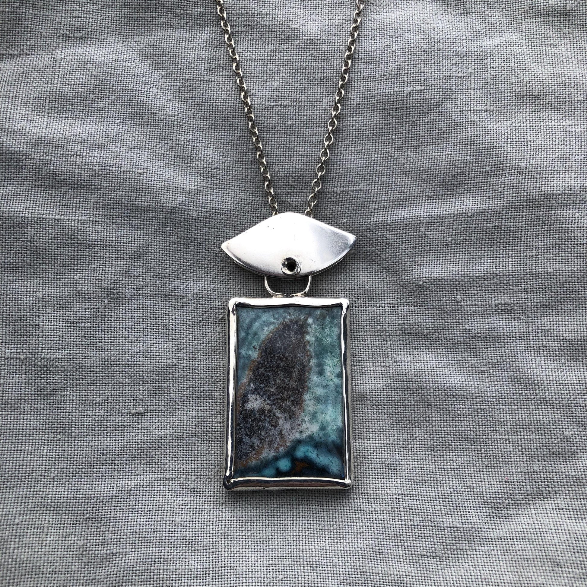 I don't know what you see in the natural opalized petrified wood cabochon featured in this pendant, but I see a humpback whale's flipper about to smack the surface of the ocean. Both sides of the pendant are open so you can see as much of the stone as possible. Entirely handmade by me in my Connecticut studio, the pendant is equal parts natural and geometric, which a touch of Asian influence in the innovative bail.