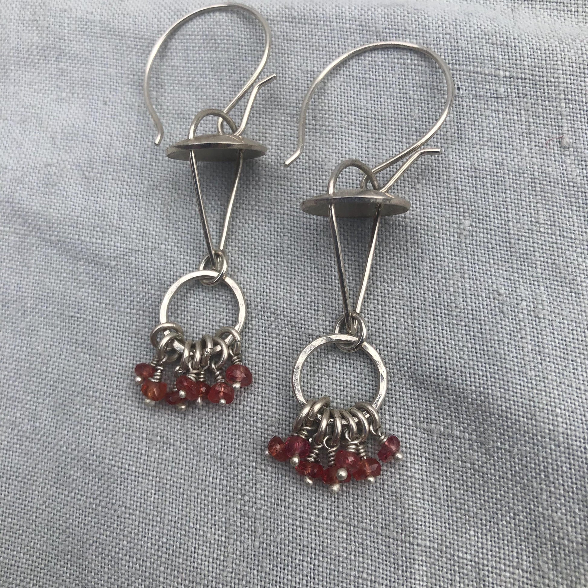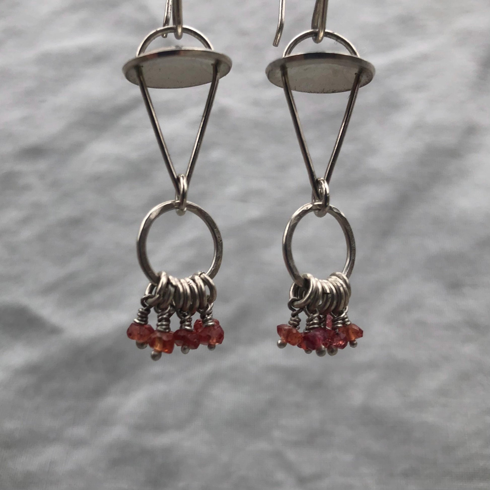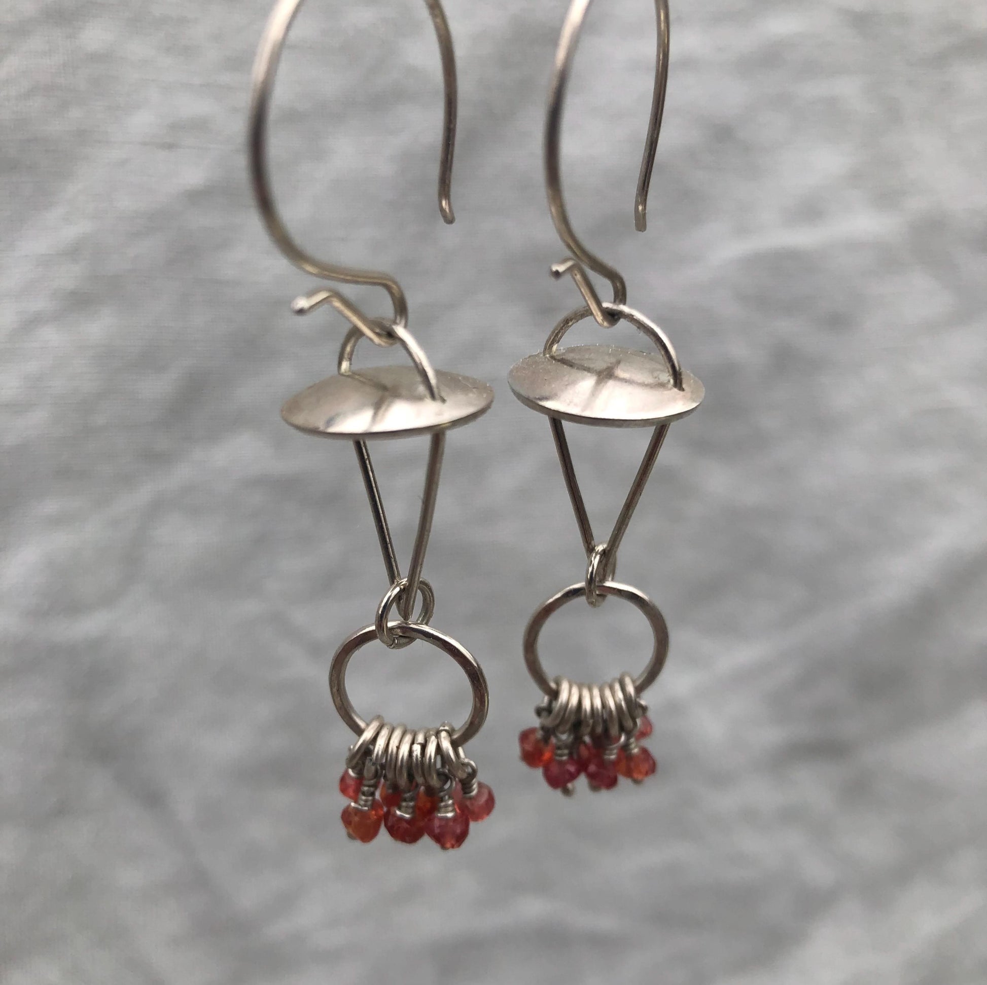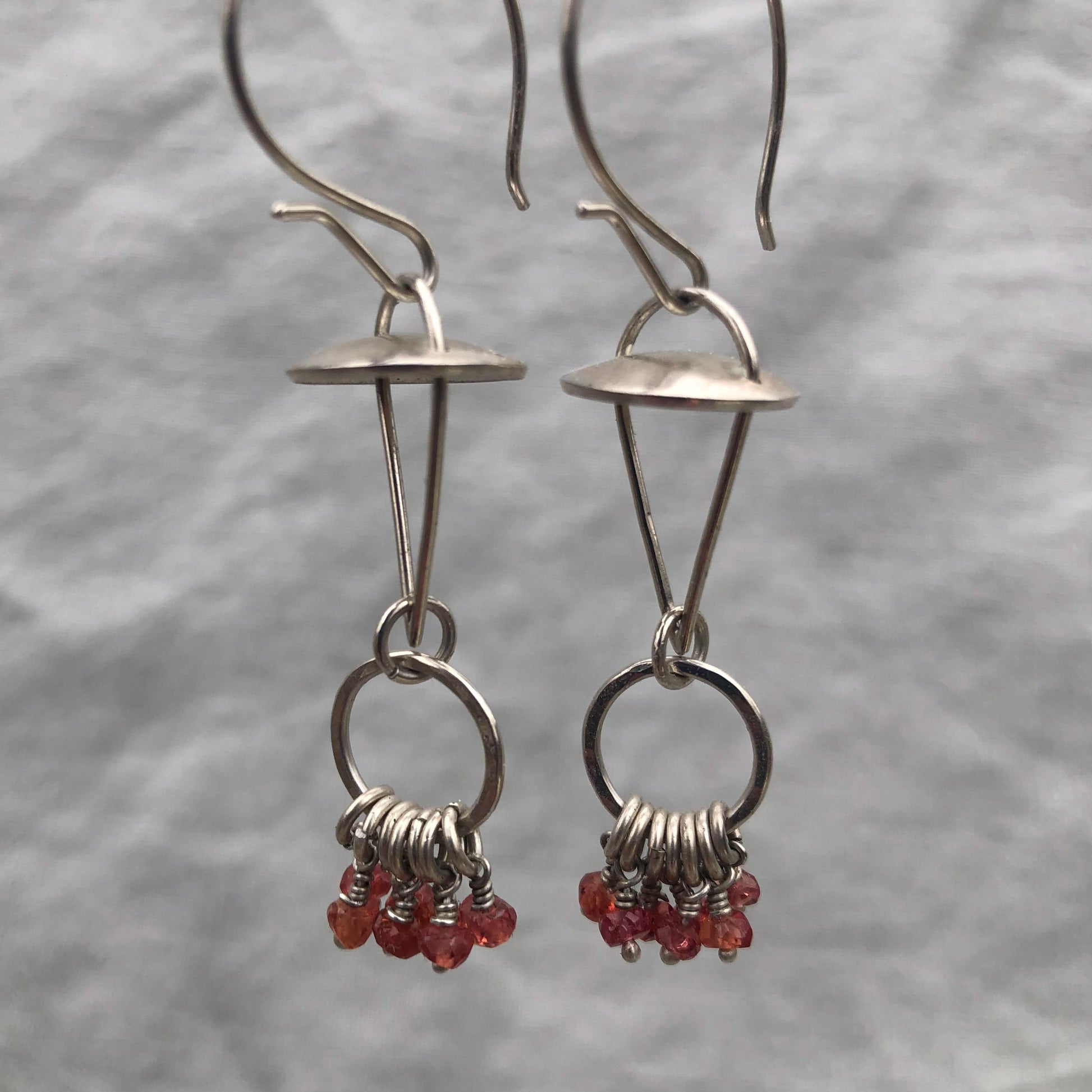 Entirely handmade by me in my Connecticut studio. Do you see parachutes? Hot air balloons? Geometric figures? Making earrings is playing with gravity. Each of the elements in these geometric yet fluid earrings moves independently, culminating in clusters of dark peach, pink, and orange sapphires. Sapphire is the birthstone for September.