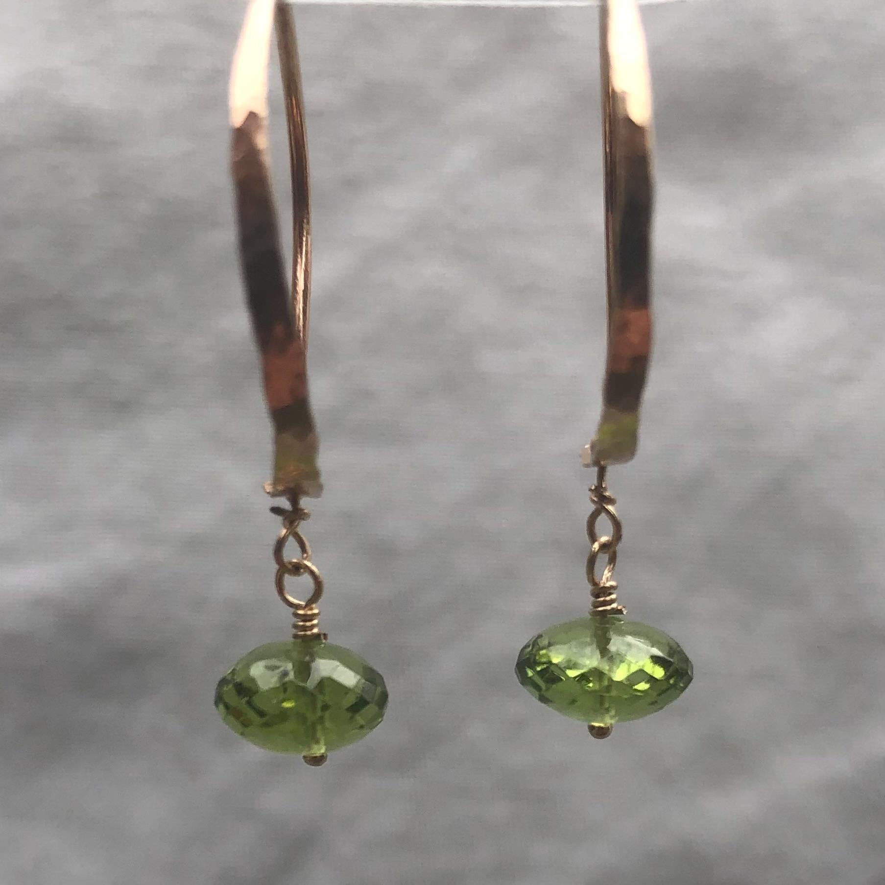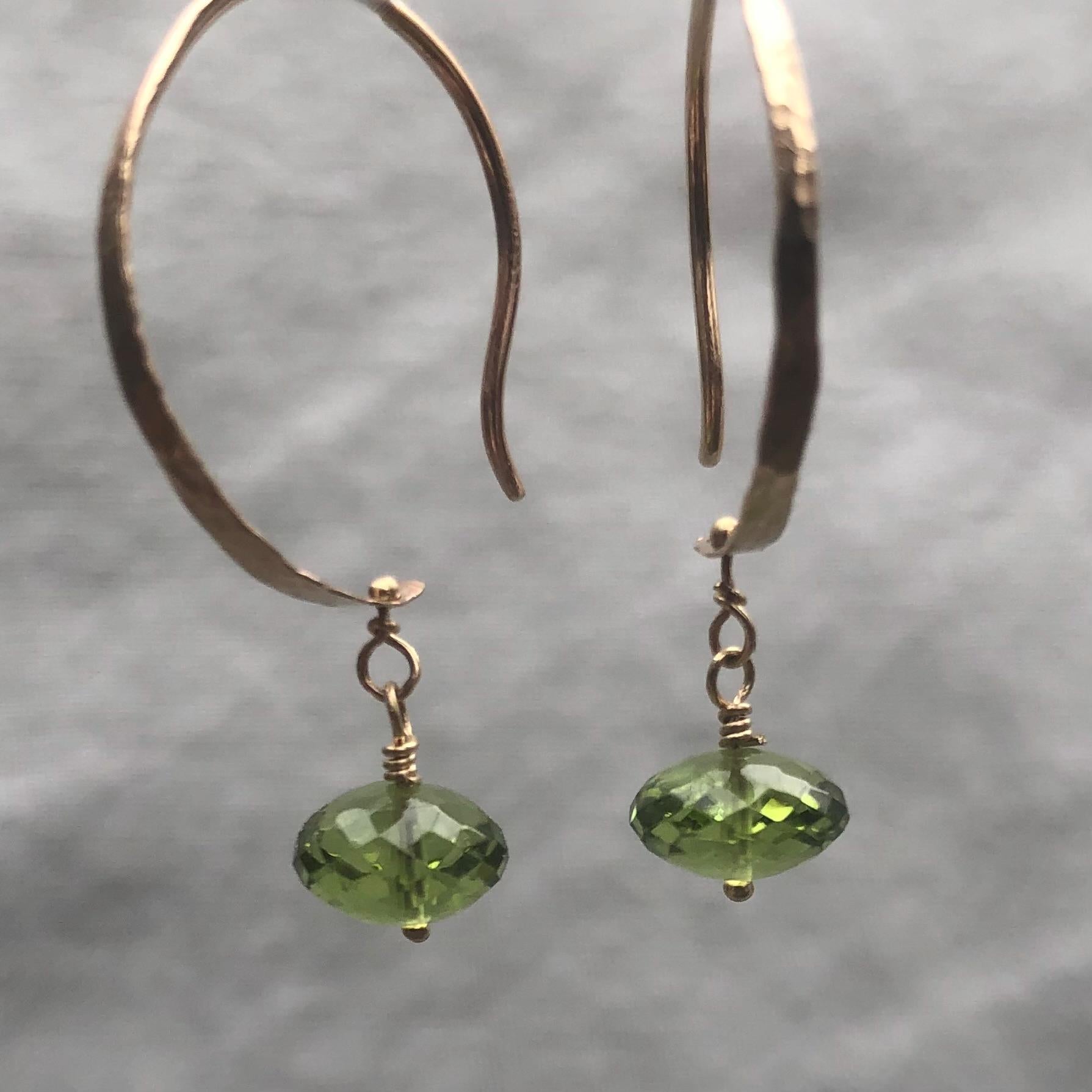 Solid gold earrings, actually handmade by me in my Connecticut studio. Delicate 14 karat yellow gold hoops with shimmering microfaceted peridot gemstones in a luscious apple green color. All solid 14 karat gold, no fill, no plate. Hand-hammered and shaped. So much sparkle and movement! These are everyday earrings that make a statement. Peridot is the birthstone for the month of August.