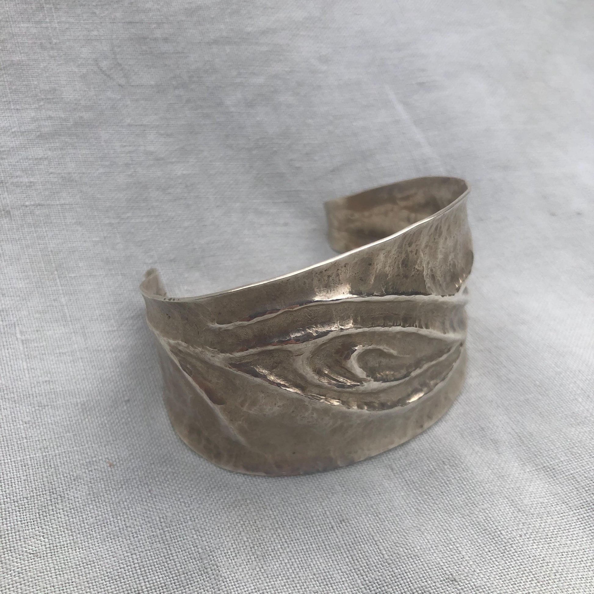 A cuff bracelet like no other, entirely handmade by me using traditional techniques. The ancient metal-sculpting method of chasing and repoussé was used to make artwork around the globe, from the mask of Tutankhamun to the Statue of Liberty. This argentium sterling silver cuff bracelet features a sinuous wave-like raised design, comfortable curved edges, and a contoured fit.