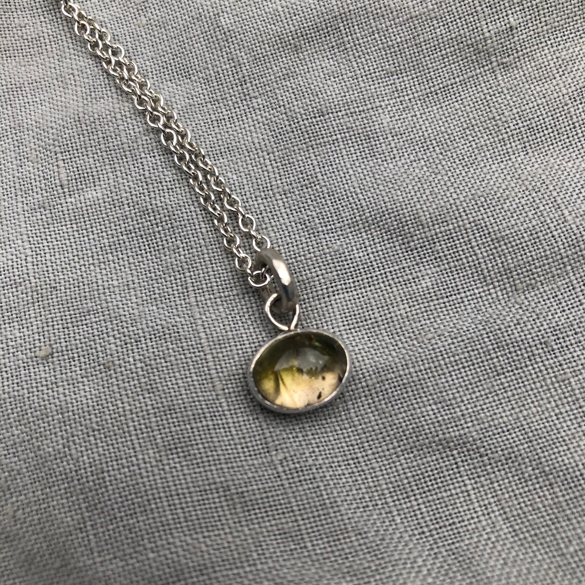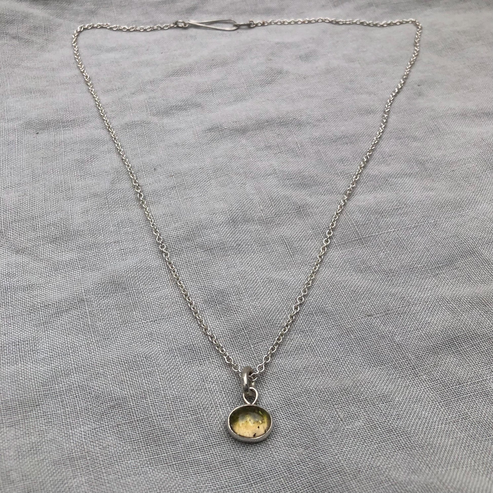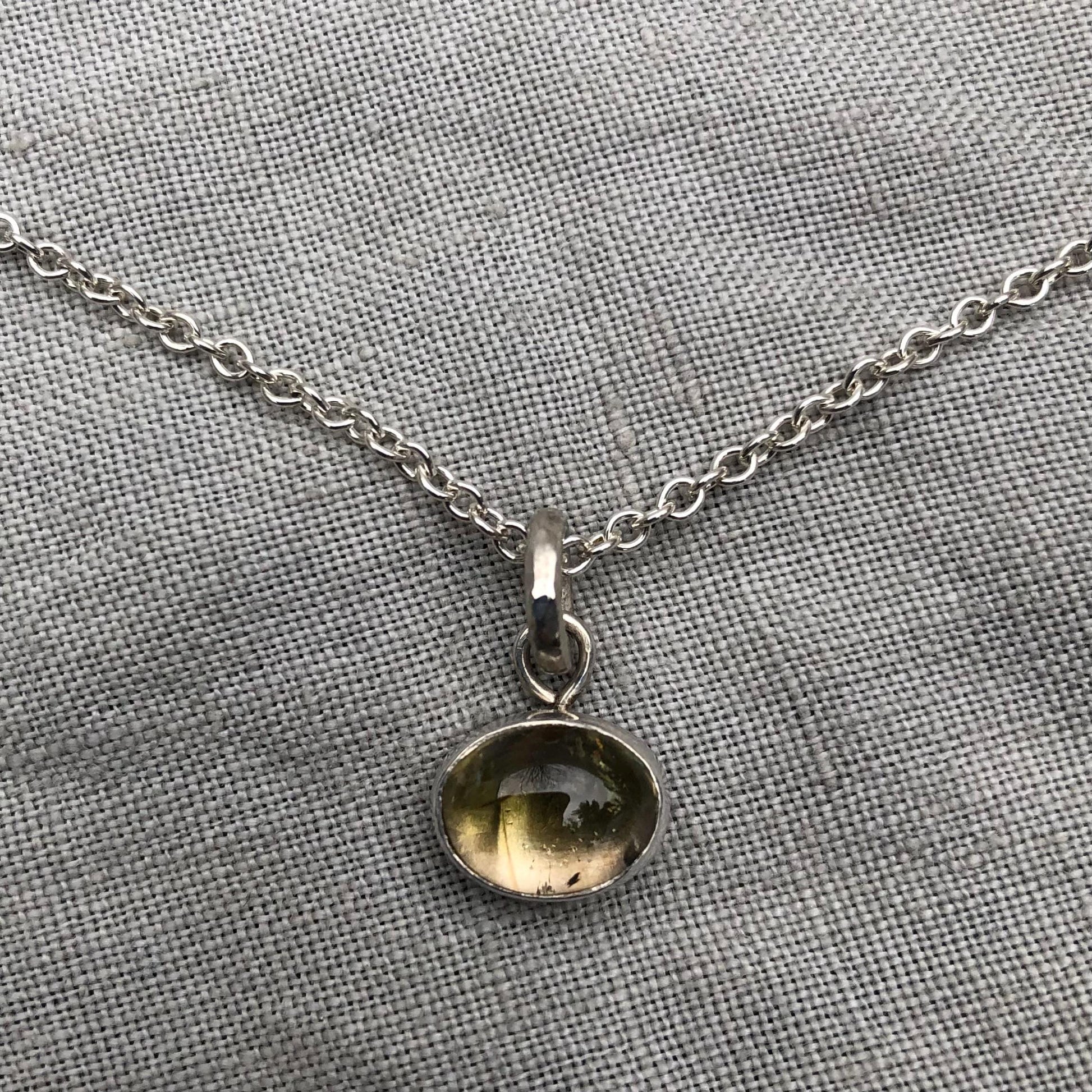 This necklace features a beautifully clear watermelon tourmaline cabochon. The stone is yellow-green at the top and shades to pink at the bottom. (Because the stone is so transparent and the backing is so reflective, it's difficult to photograph the color accurately. What looks like dark patches in the stone are actually reflections of the camera.) Set simply in argentium sterling silver with a fine silver bezel and a little squiggle on the back. Handmade clasp. Tourmaline is one of the birthstones for October.