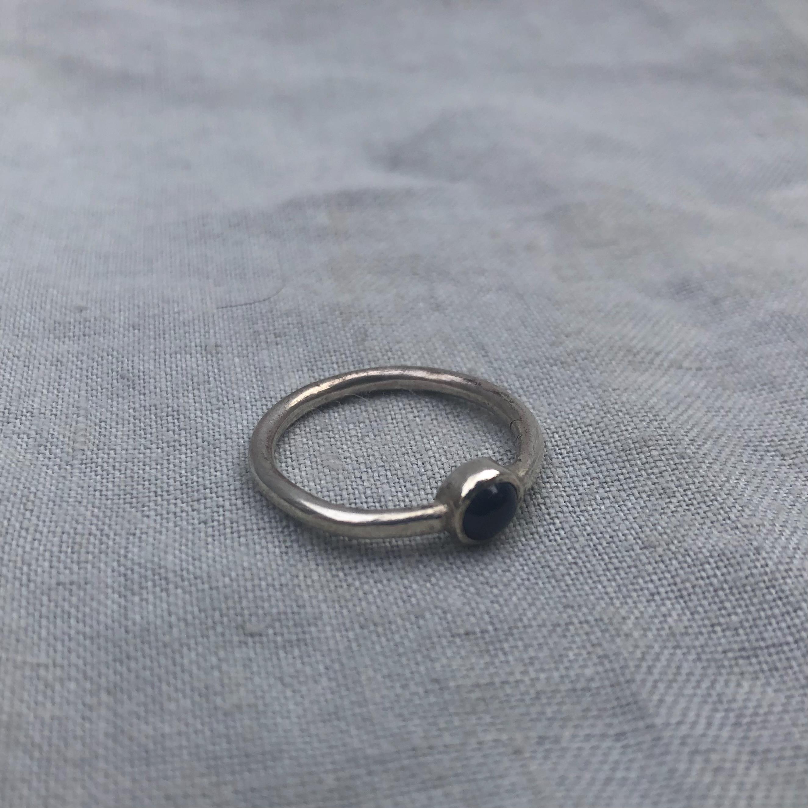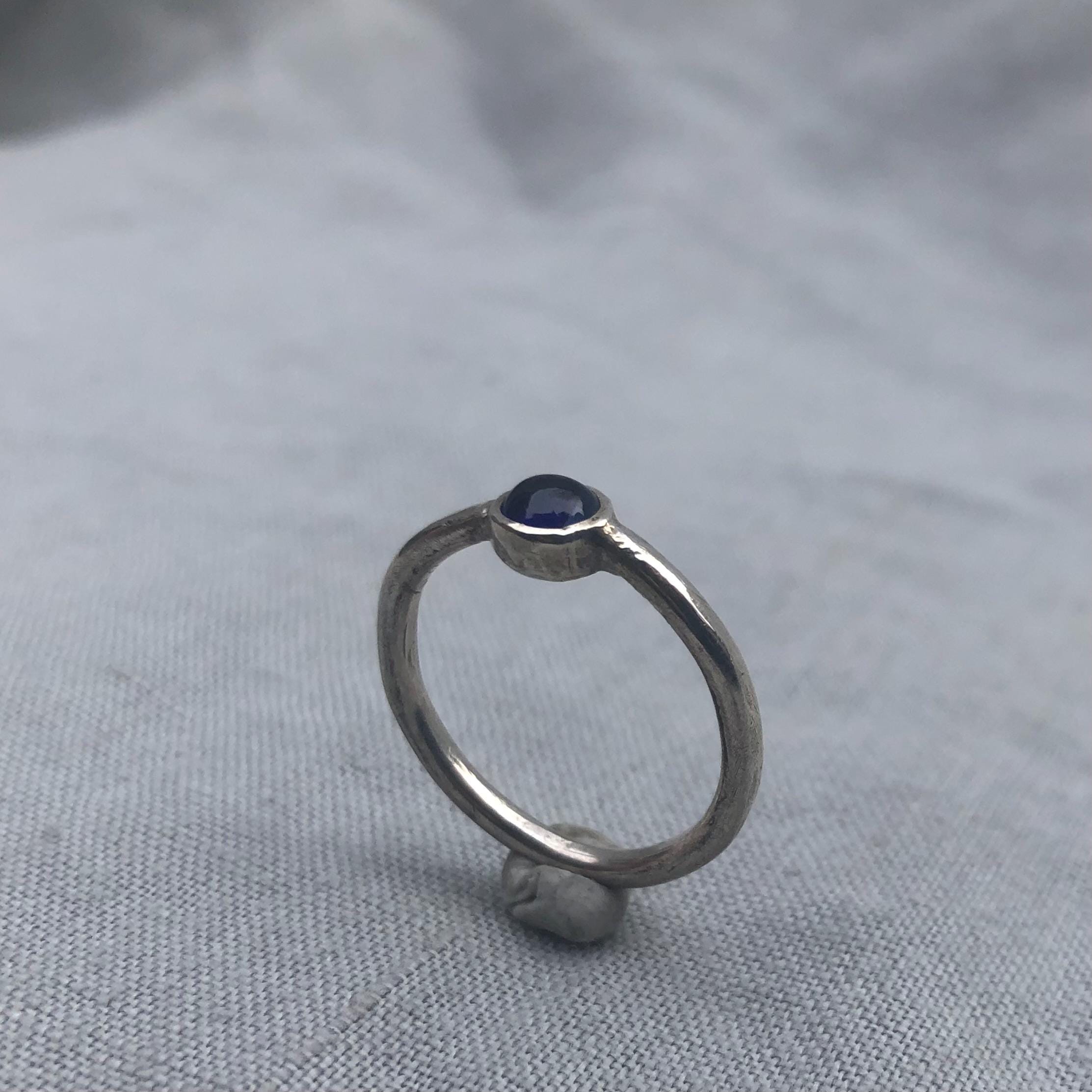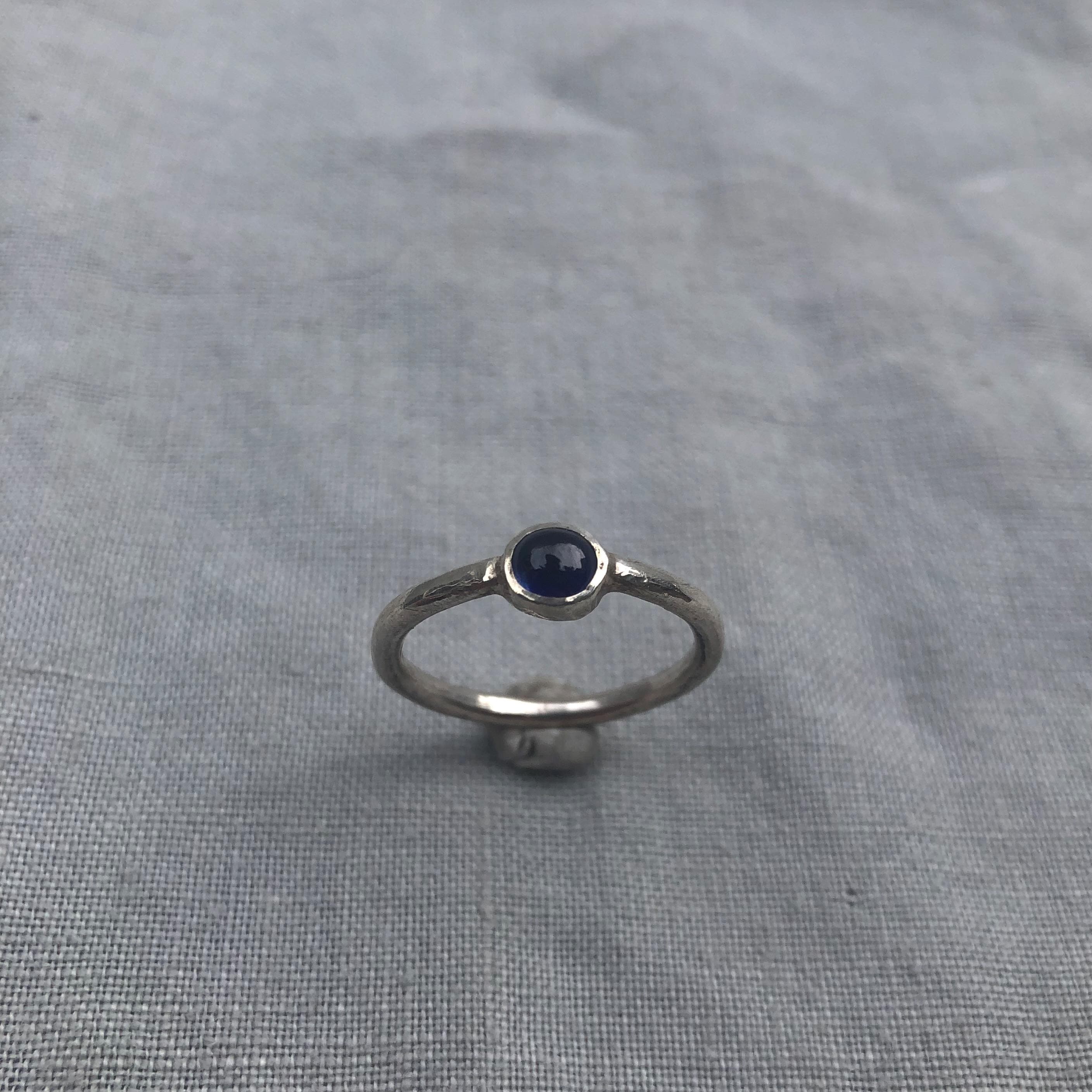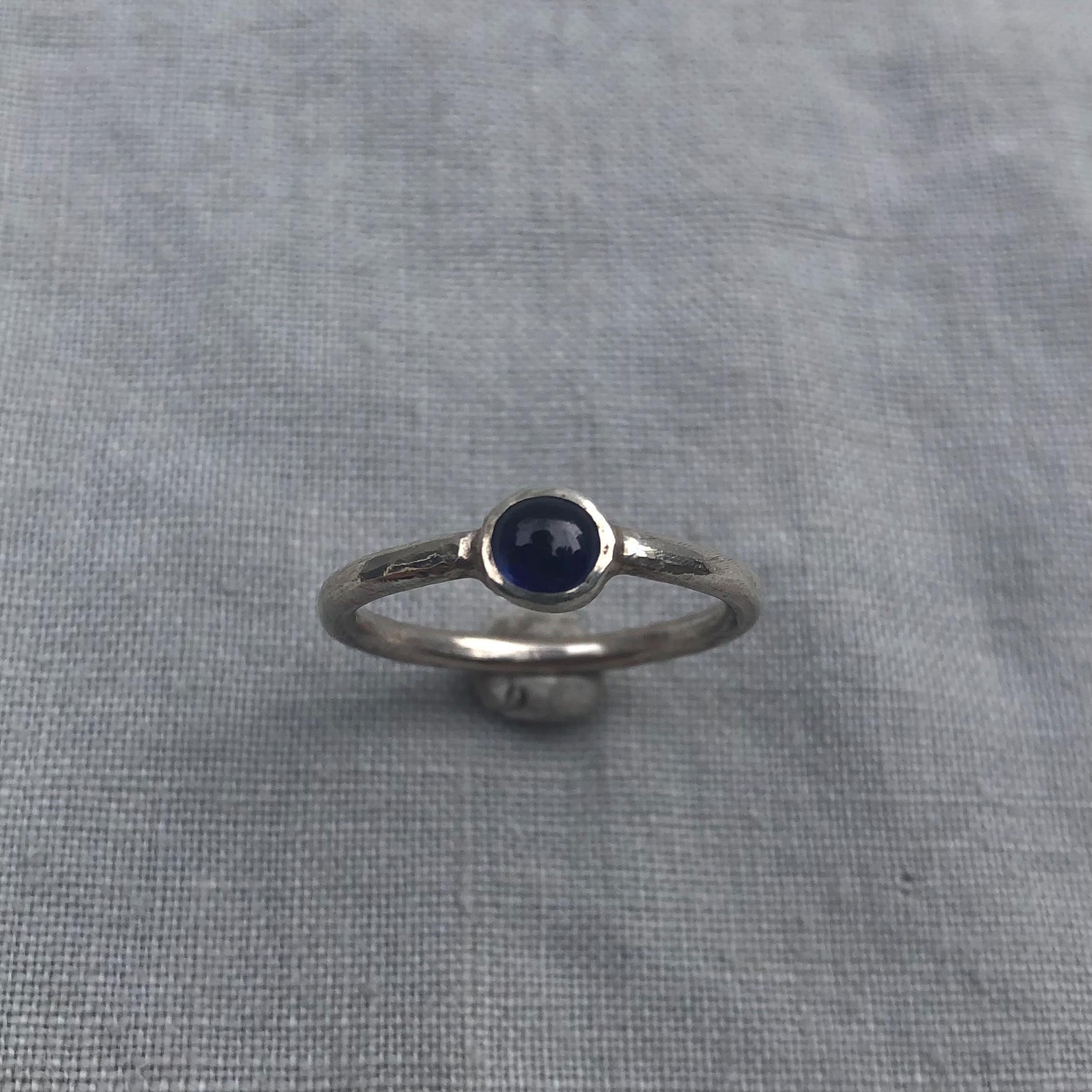 Entirely handmade by me in my Connecticut studio, this little ring features a little sapphire cabochon (5mm). Perfect, subtle, and luxurious. The natural sapphire is a lovely, classic blue color. It is heat treated with no other treatments. The ring is U.S. size 7 1/4. A similar ring in size 5 1/2 is also listed in my shop.