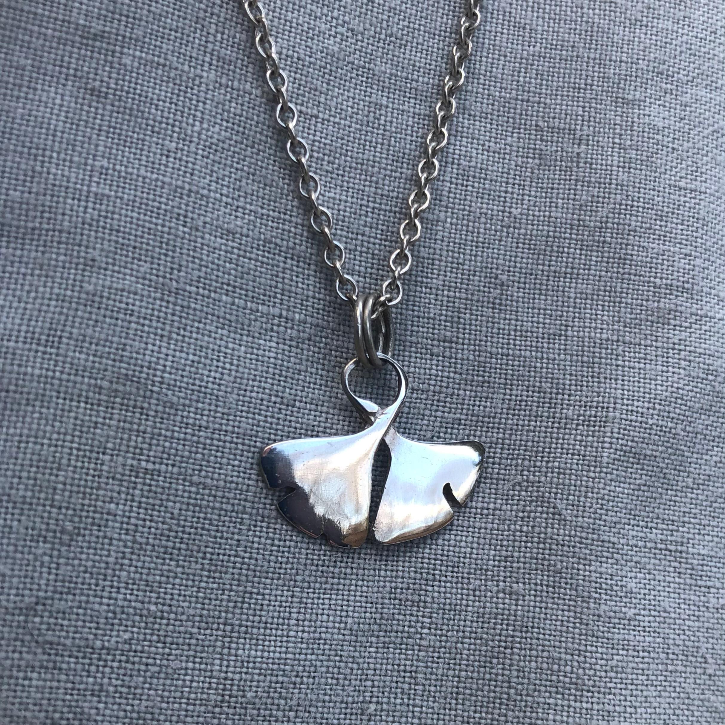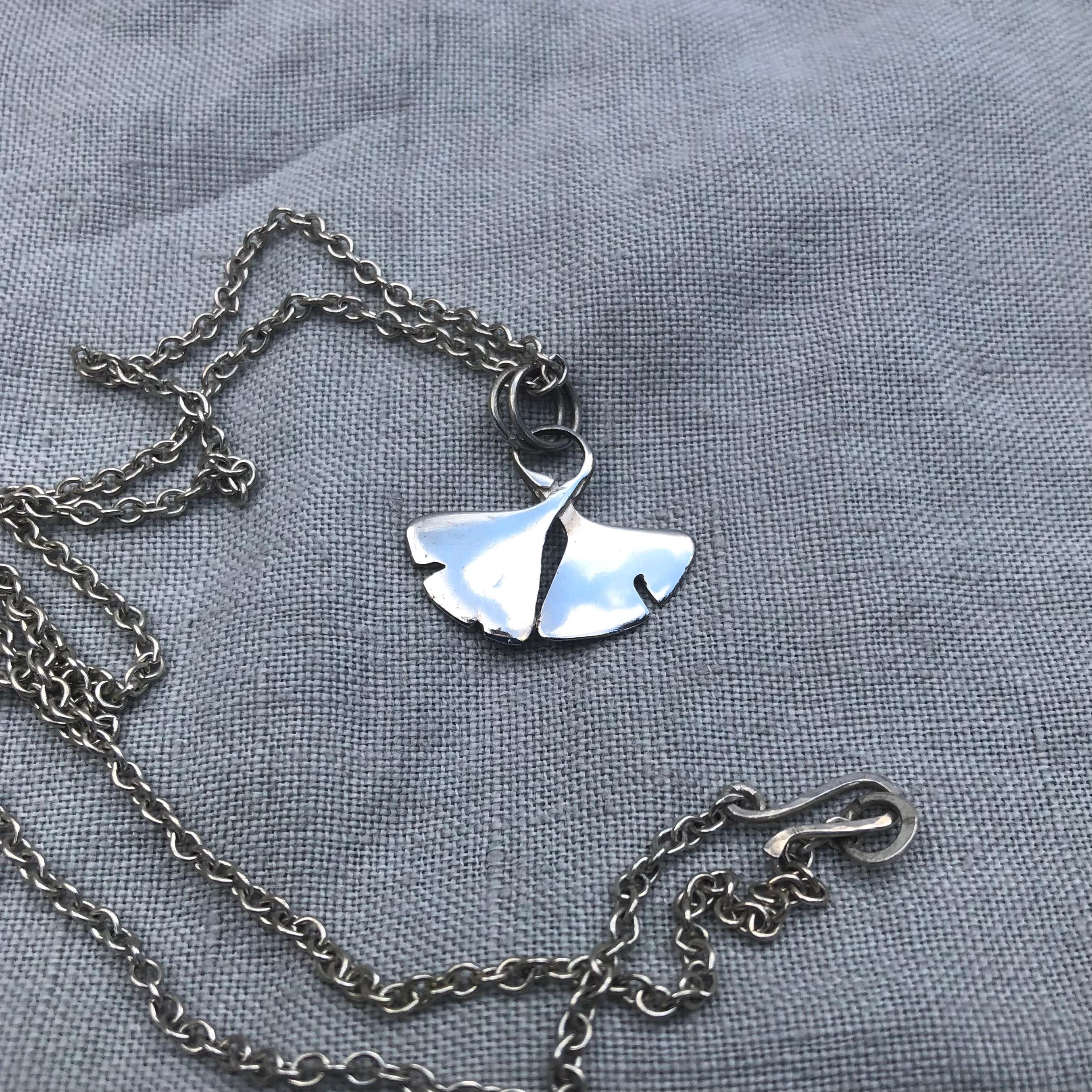 Entirely one of a kind, designed and handmade by me in my Connecticut studio. Symmetrical and natural at the same time, this pendant combines the balance of an abstract design with the evocativeness of a design based on a living thing. The ancient ginkgo is one of my favorite trees, traditionally signifying health, resilience, and long life. I've always loved the nature-inspired jewelry of the art nouveau and arts and crafts movements. This pendant reminds me of an art nouveau design, but in a minimal key. Polished to a mirror finish and perfect for everyday.