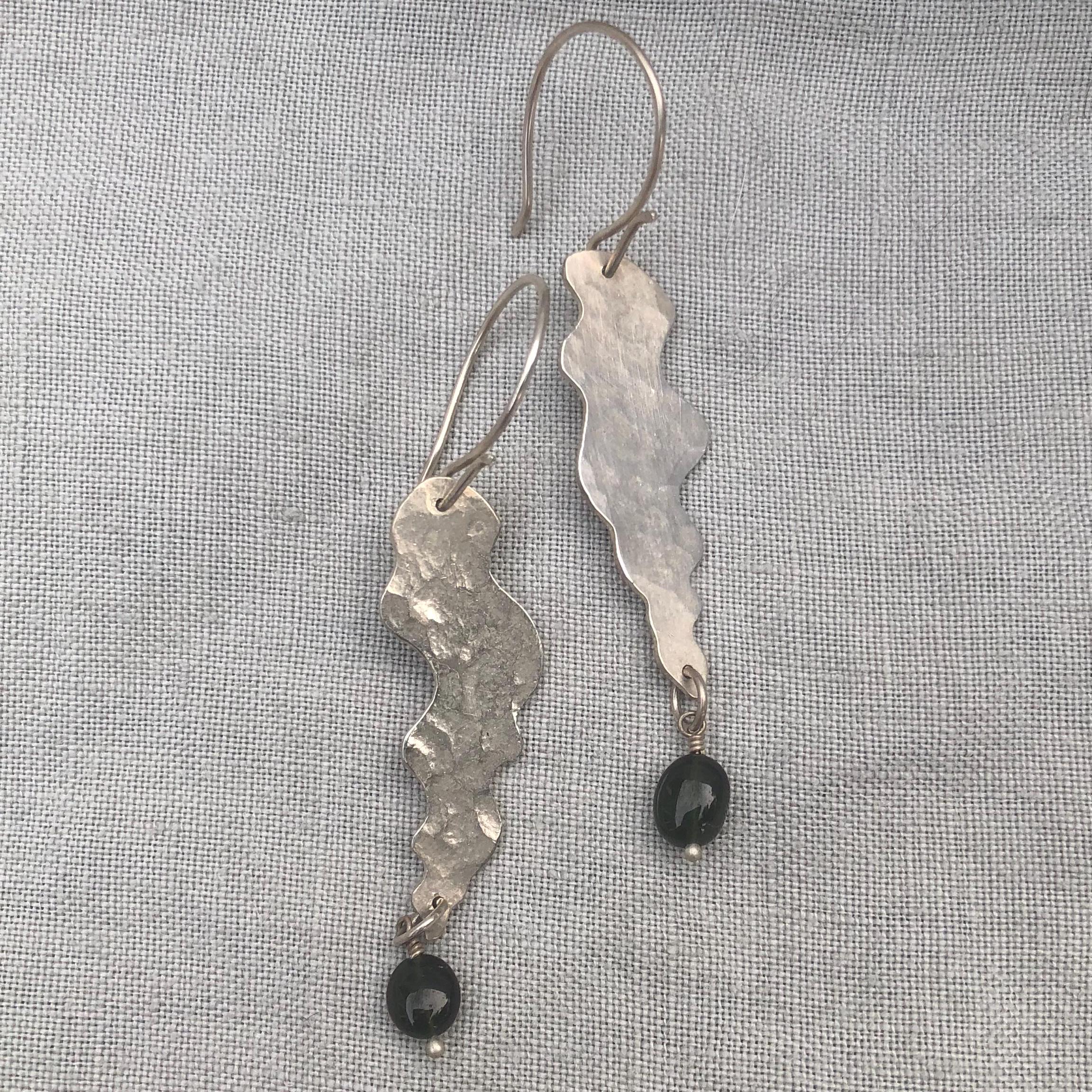 Handmade by me in my Connecticut studio. The green of these vintage old-mine beads is hard to capture in the light box. They are a deep but very transparent forest green, not a blue-green, not a yellow- or brownish-green. They are *green*. Featuring wavy squiggles of hammered argentium sterling silver, these earrings make a statement whether worn for everyday or a special occasion.