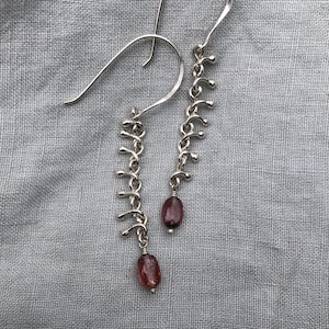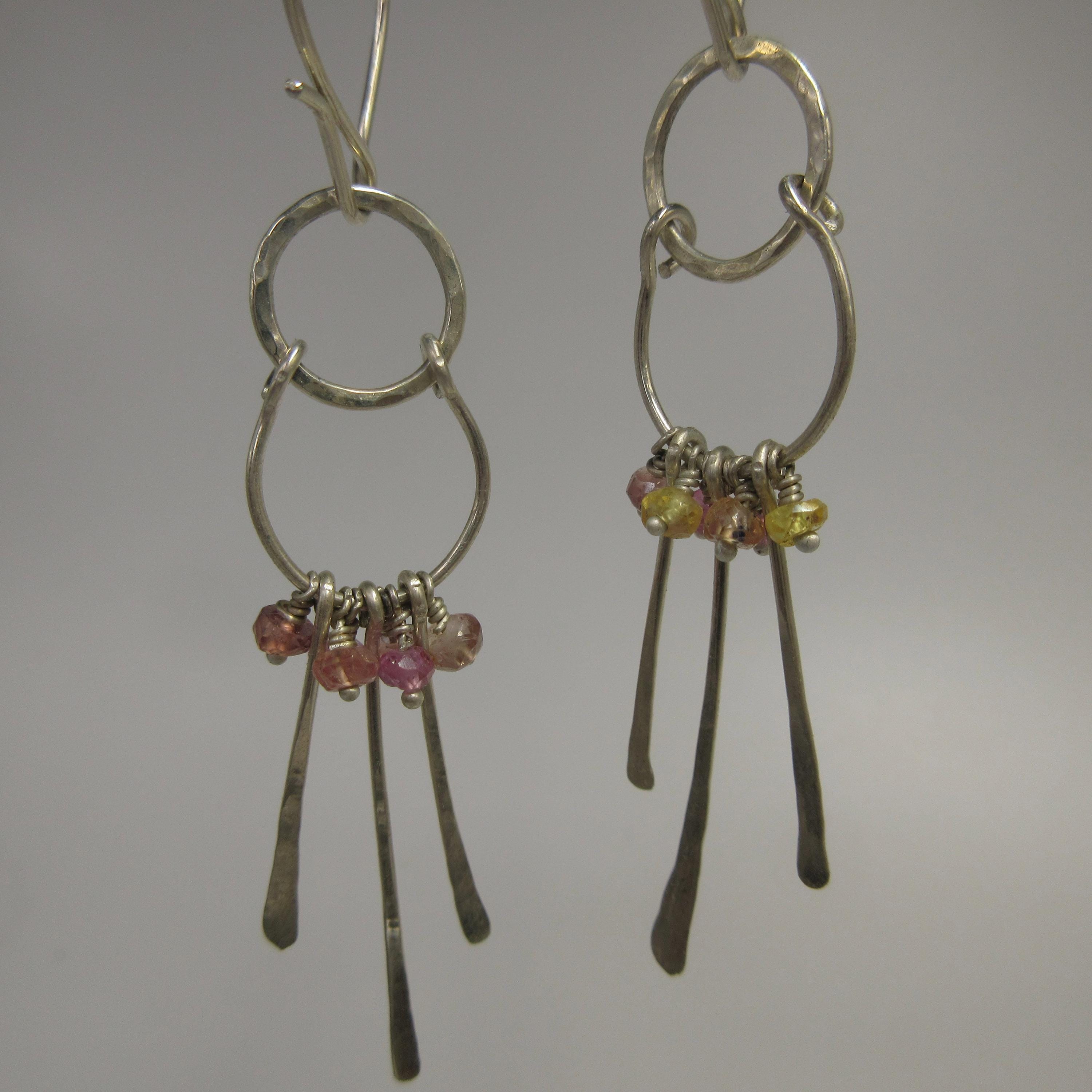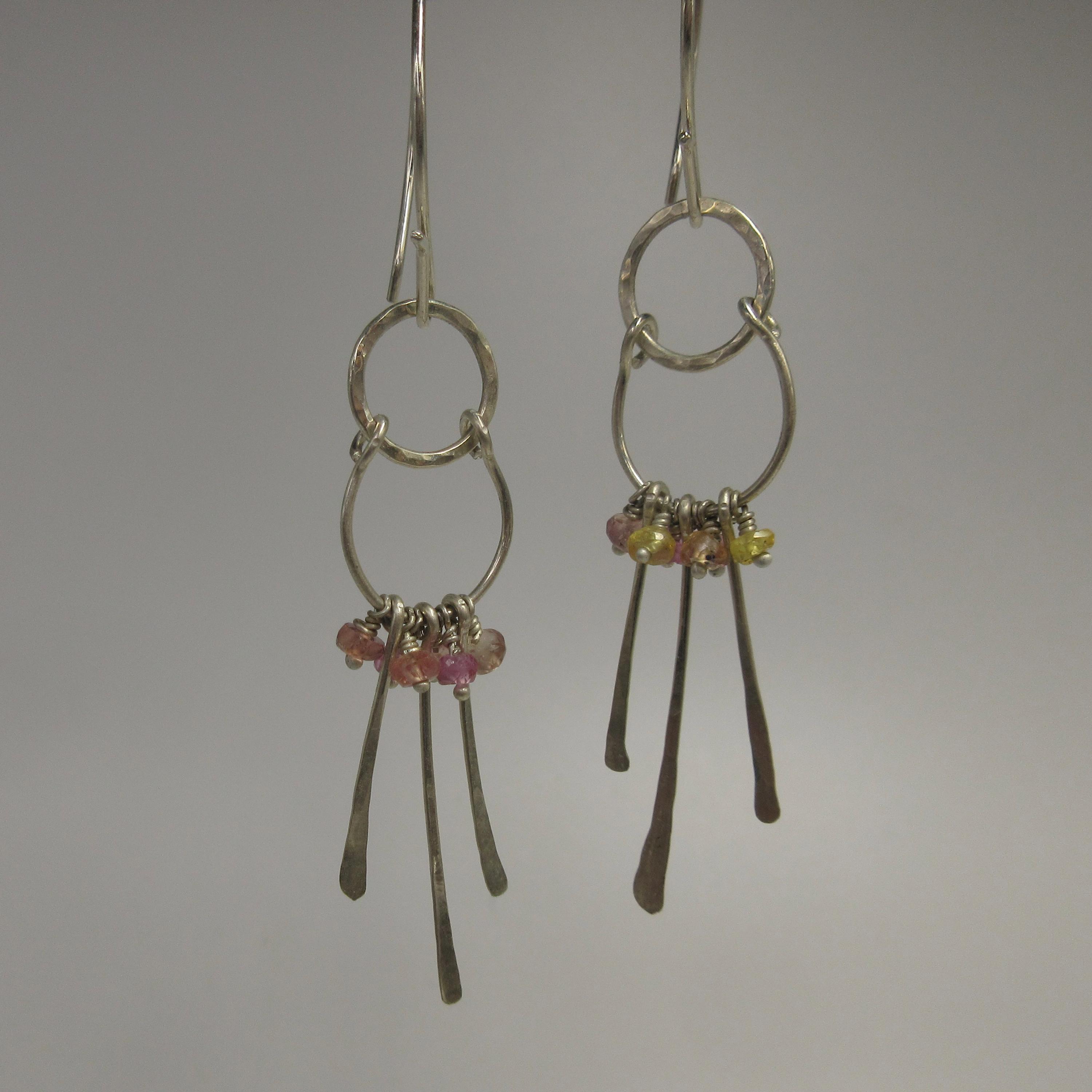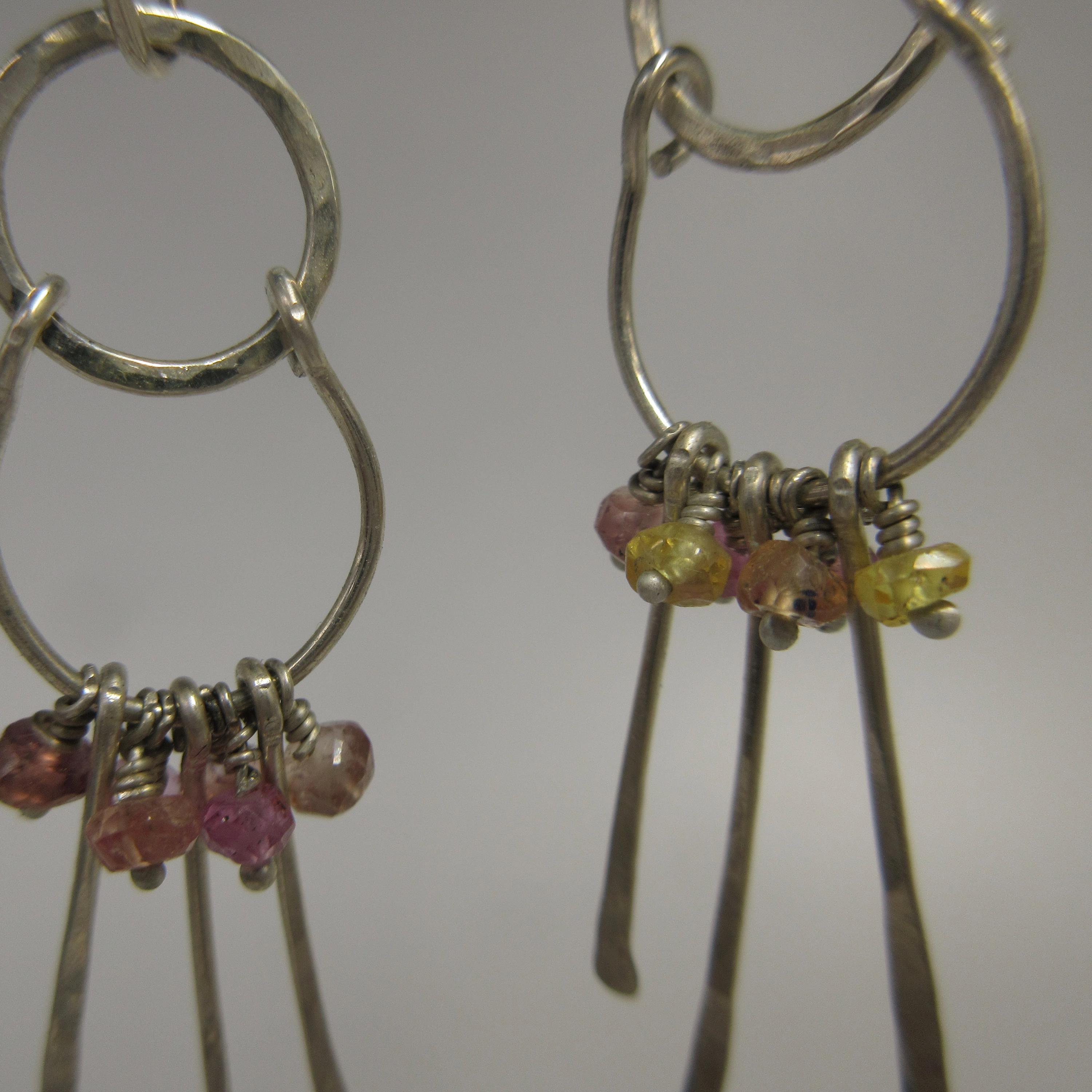 Entirely handmade by me in my Connecticut studio and one of a kind. Sparkling purple, pink, peach, and yellow sapphire beads cluster on these geometric yet fluid earrings. Simple hooks. Hammered dangling fringe interspersed with multicolored sapphires. Each of the components moves independently. Sapphire is the birthstone for September.