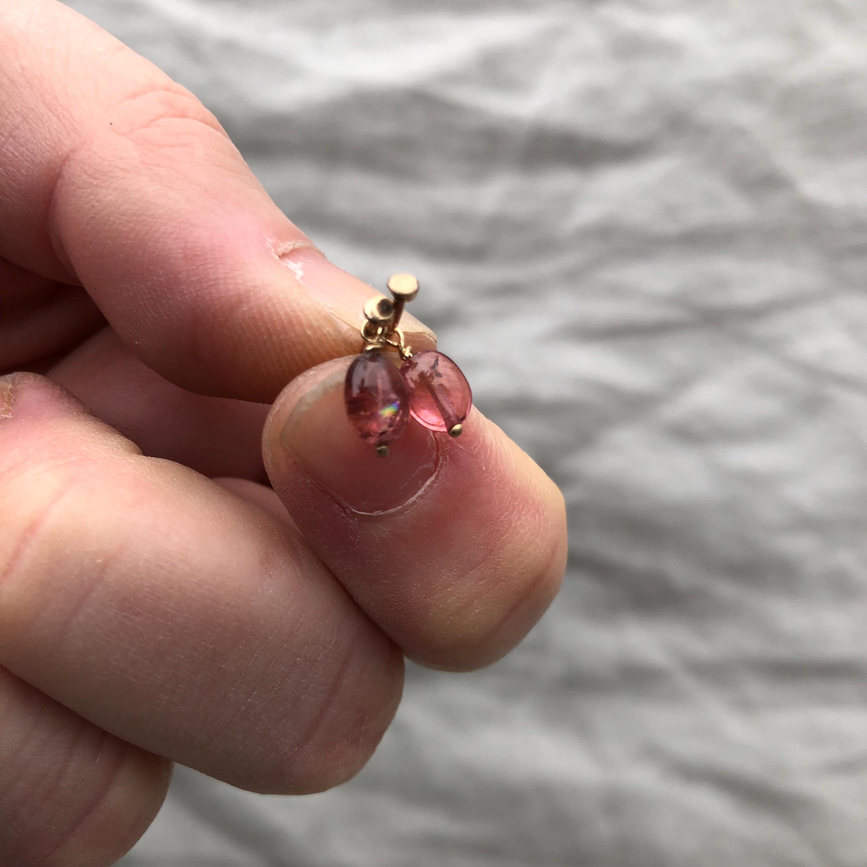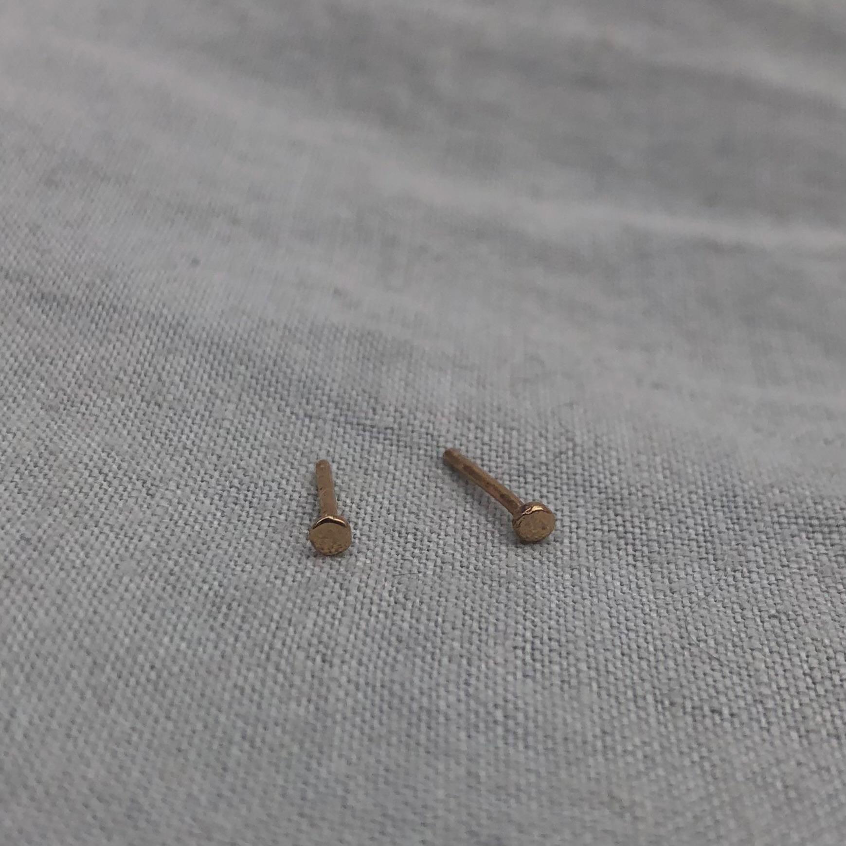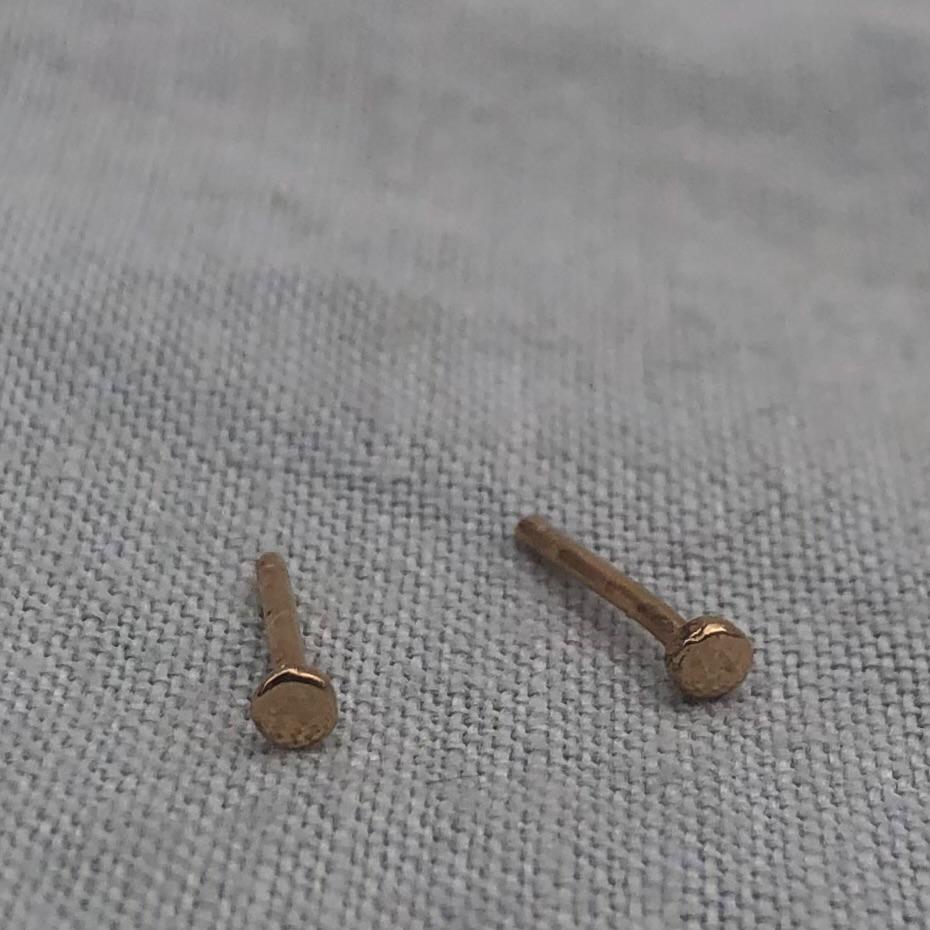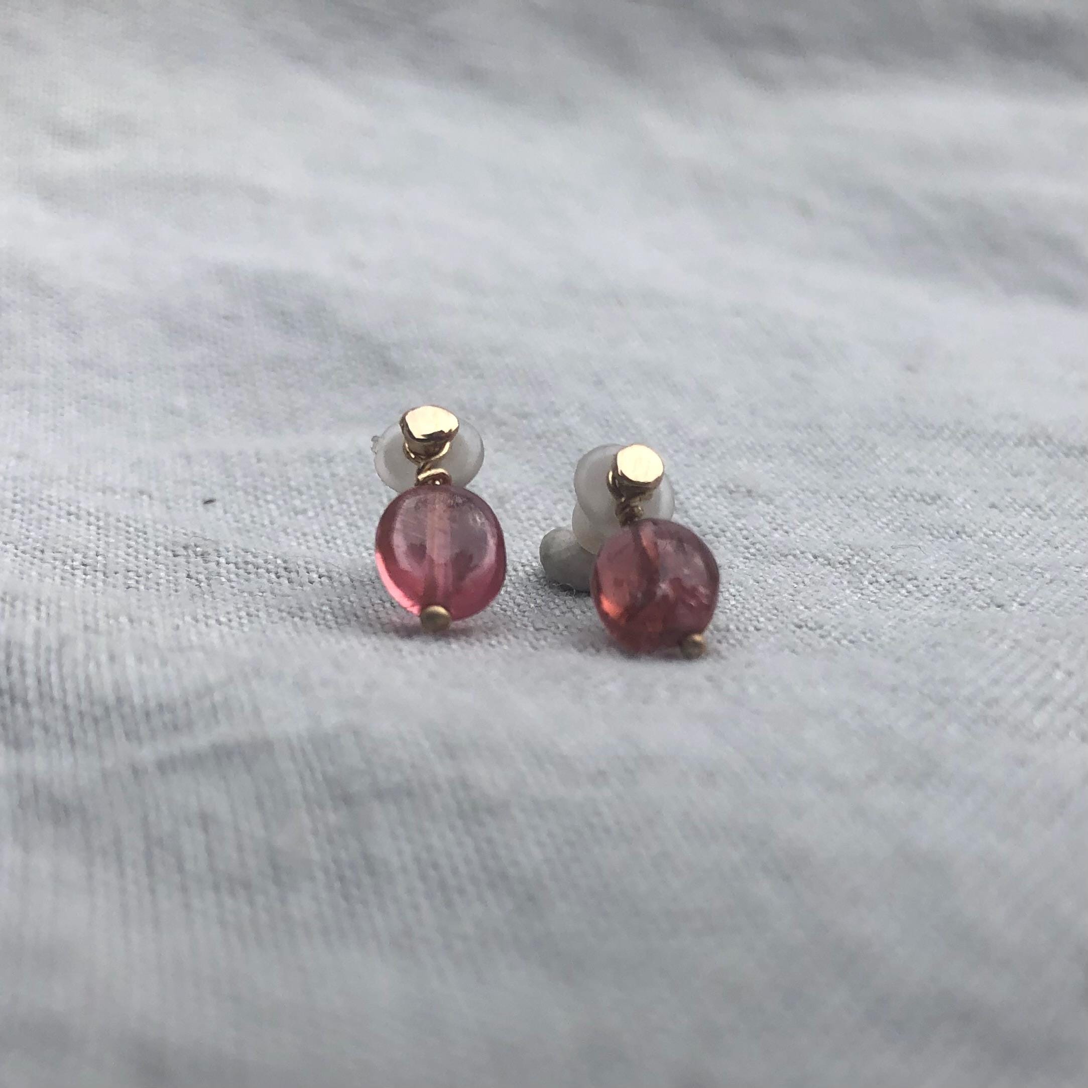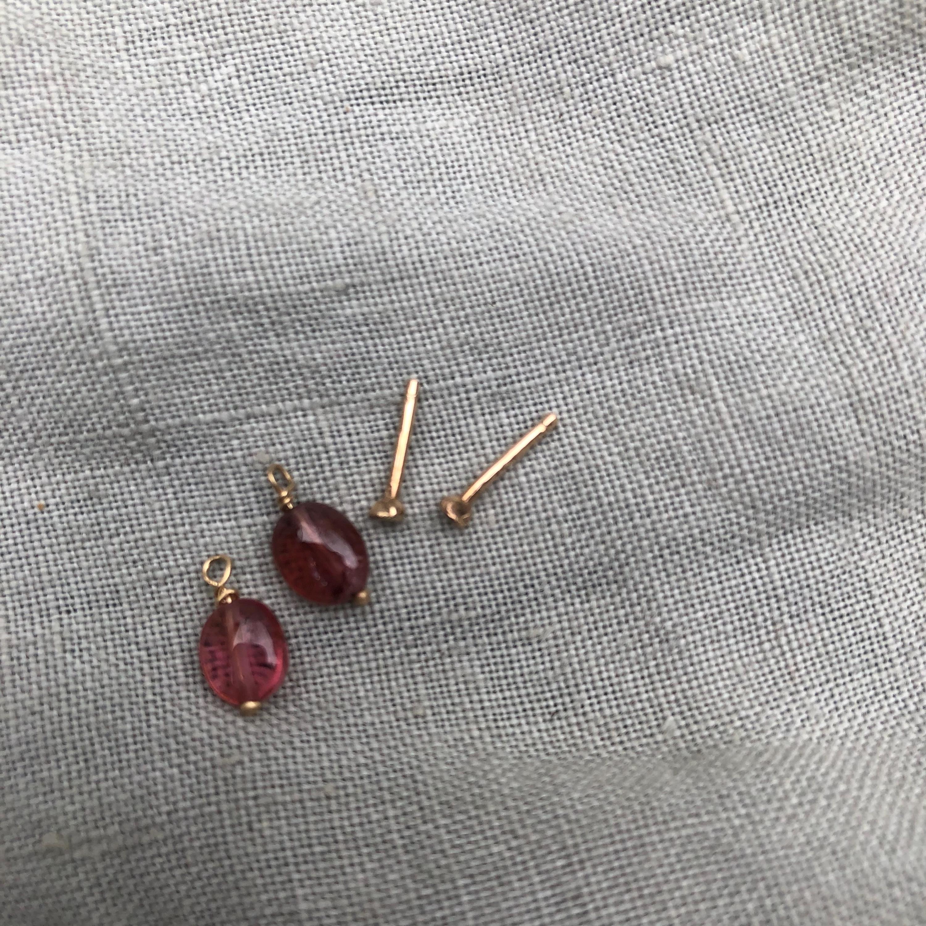Sold gold, artisan-made earrings with a gemstone for under a hundred dollars? You've found them. Simple 14 karat yellow gold stud earrings with a hand-hammered finish. The pink tourmaline drops are removable for two separate looks. Old-stock tourmalines with remarkable clarity and depth of color. Utterly simple and affordable.