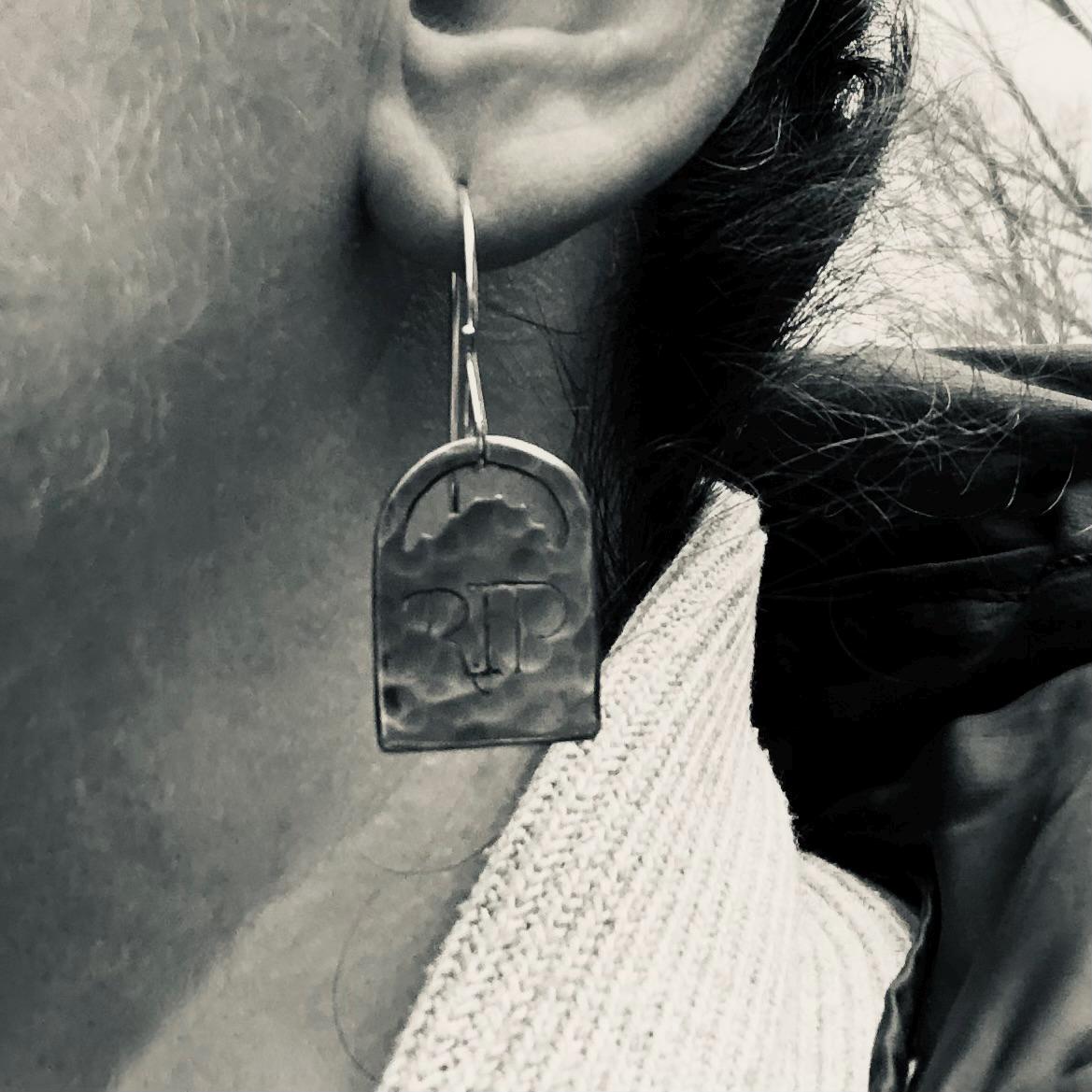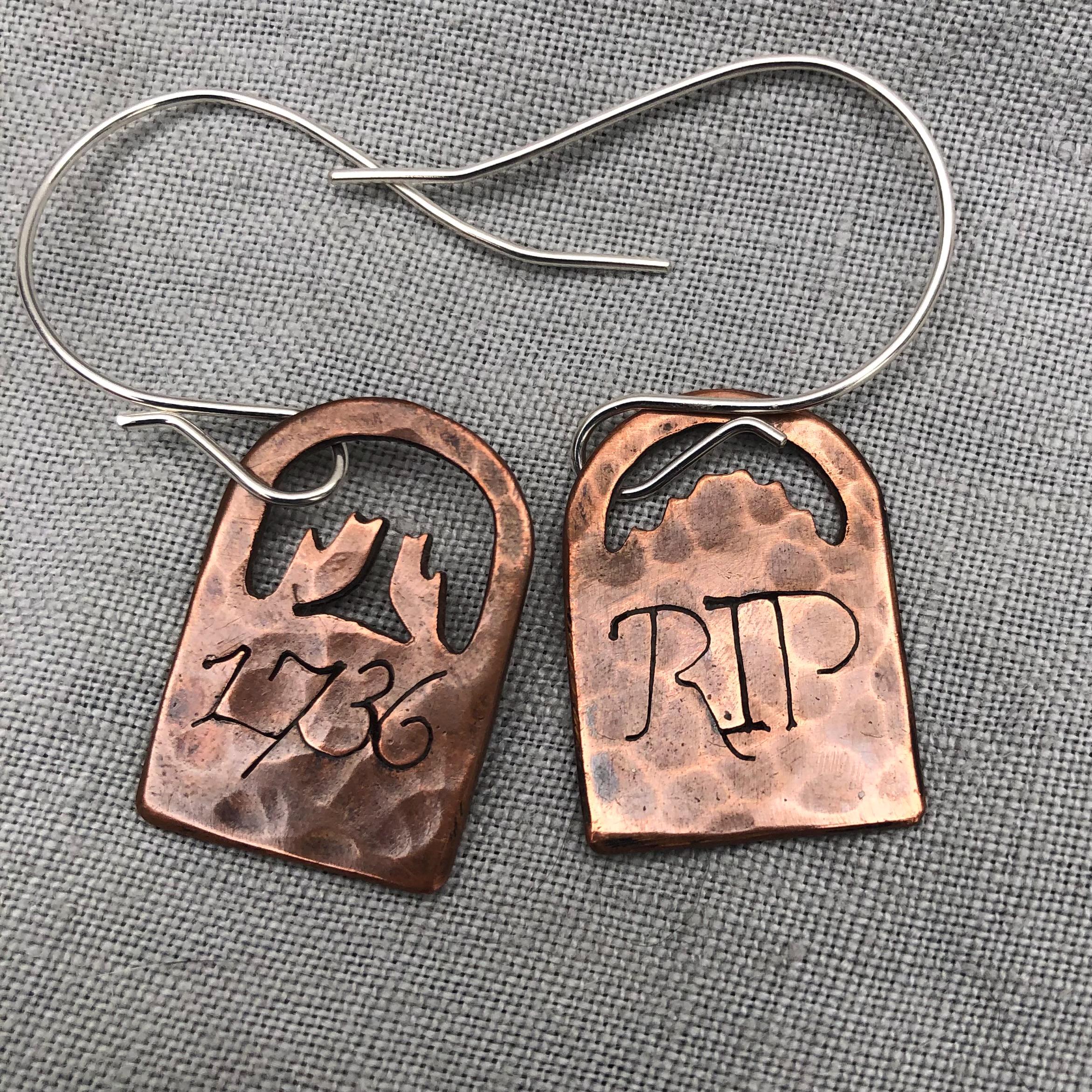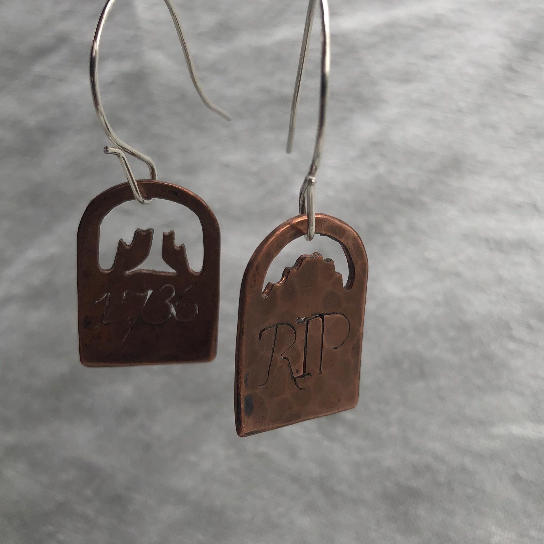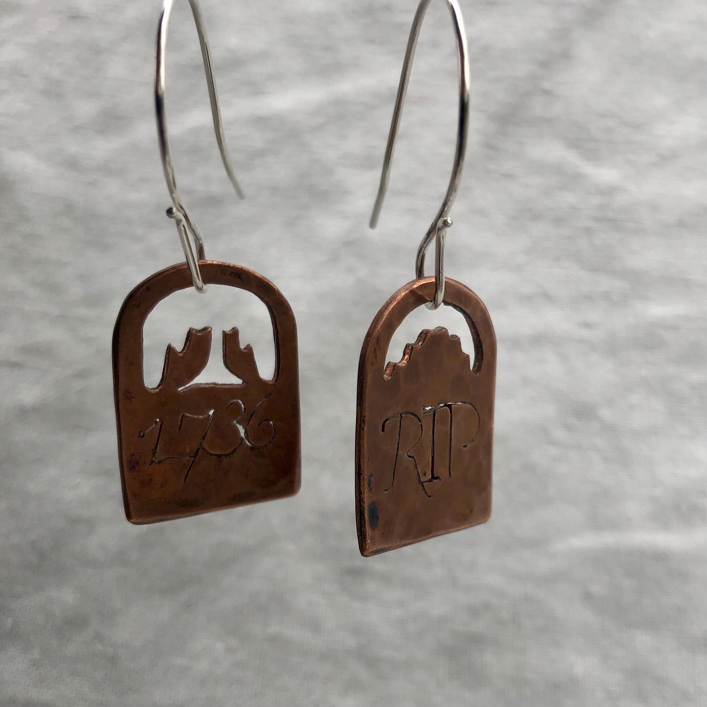 Entirely handmade by me in my Connecticut studio. These tombstones feature faded inscriptions (hand cut with a jeweler's saw): "RIP" on one, "1736" on the other. Above the inscriptions are stylized weeping willows, as found on 18th and 19th century tombstones in New England. (These are also hand cut with a jeweler's saw.) Who is buried here? No one knows.