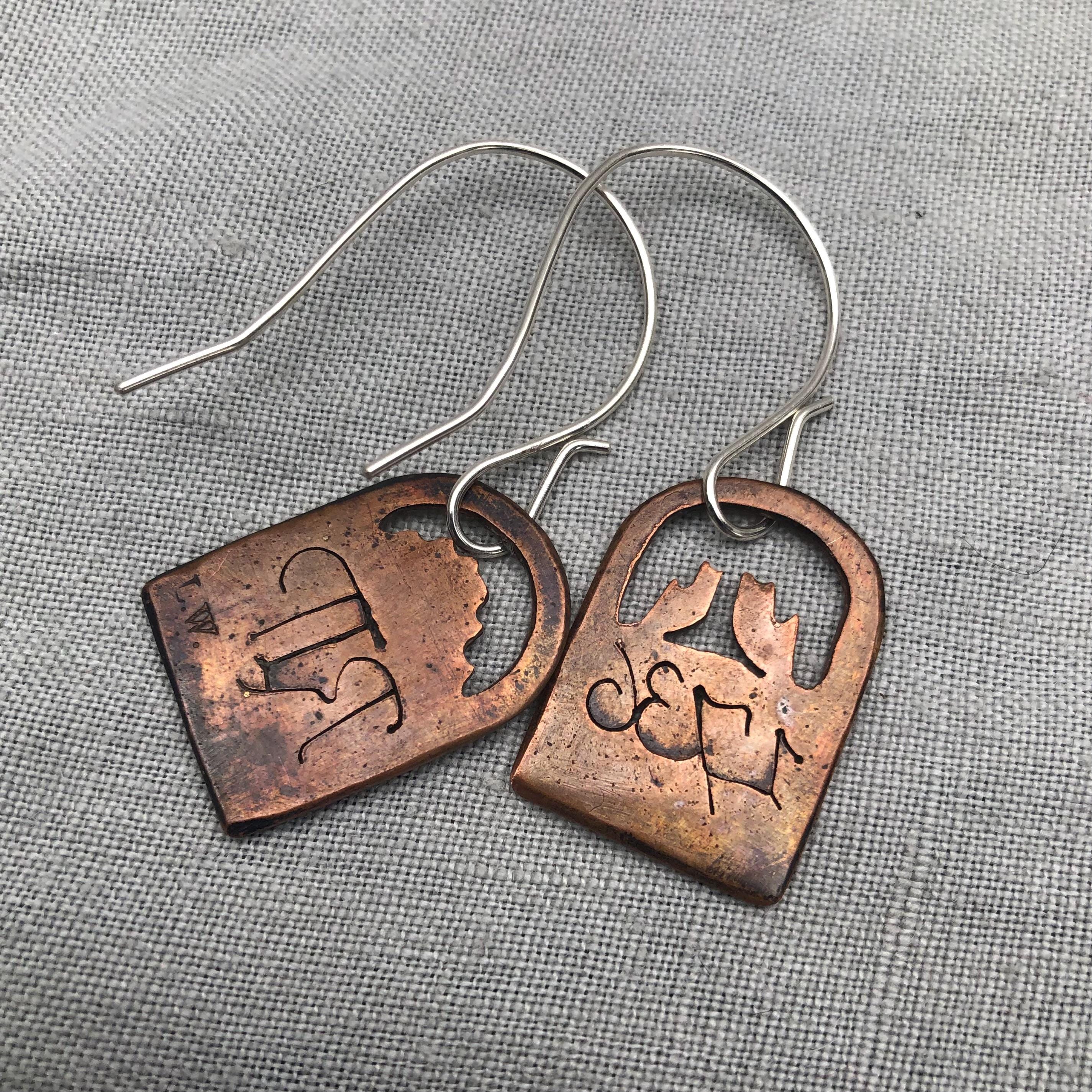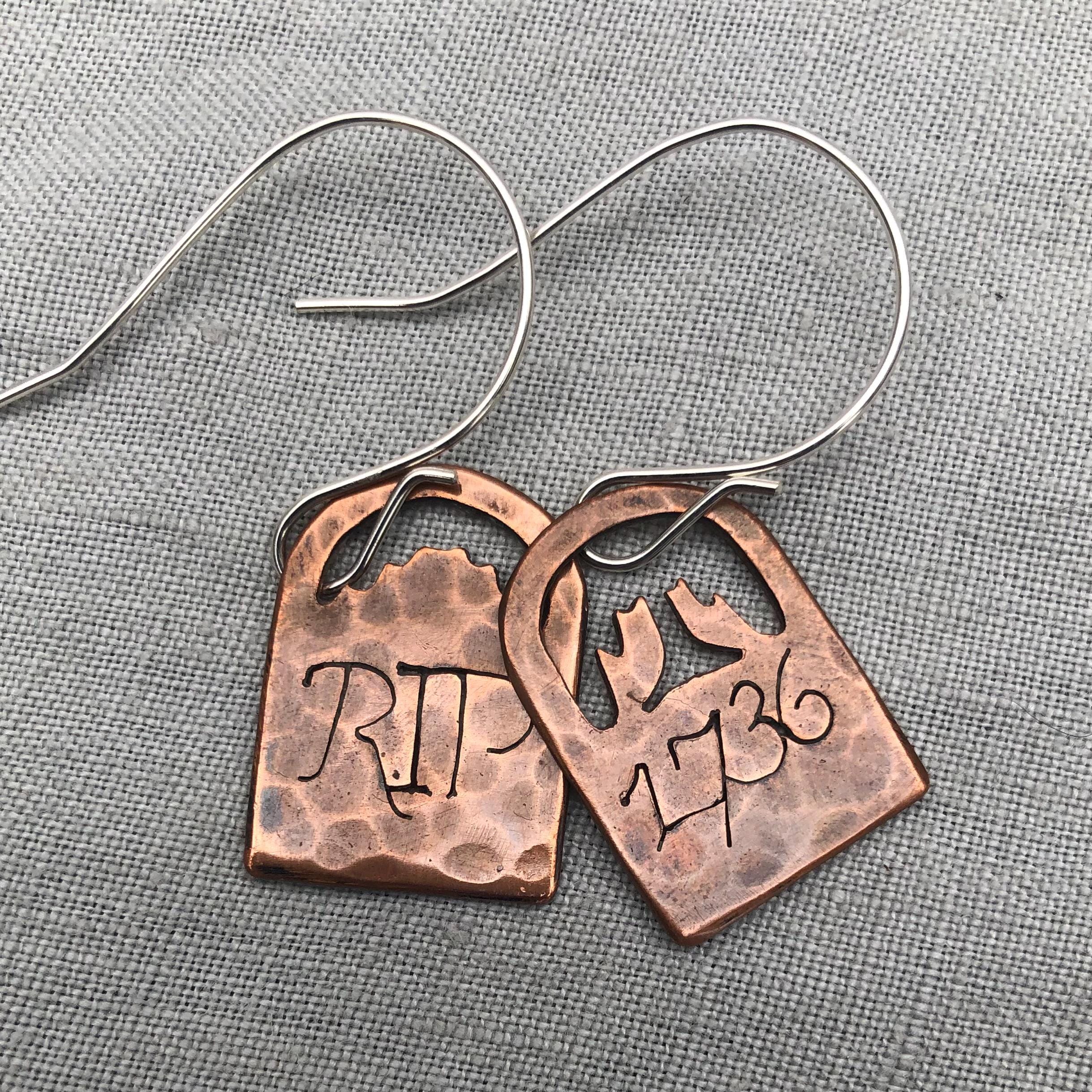 Hammered copper with a natural patina, sealed with a museum-quality sealant. Hypoallergenic and 100% recycled argentium sterling silver ear wires. Perfect for the spooky season or for anyone for whom Halloween is not just one day a year.