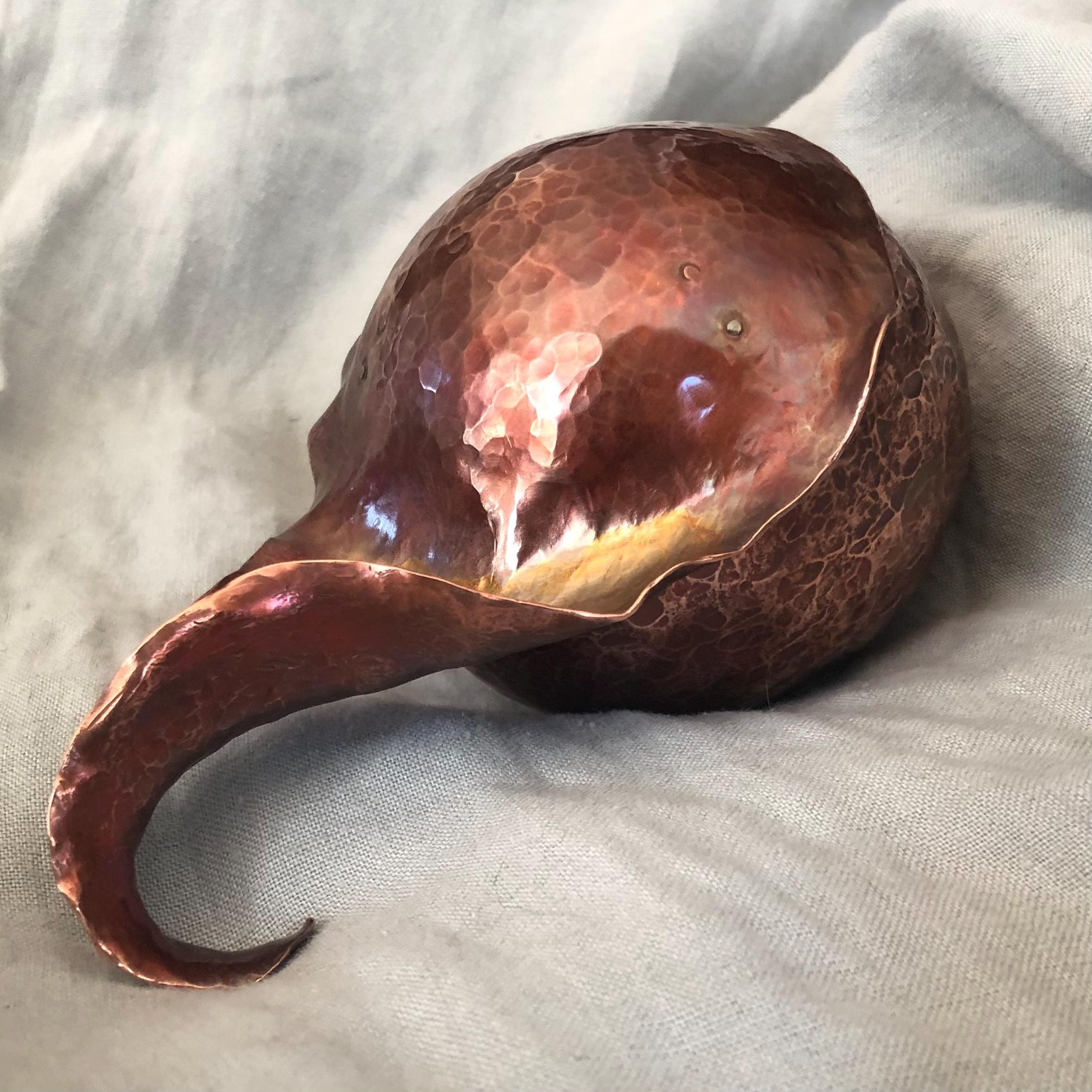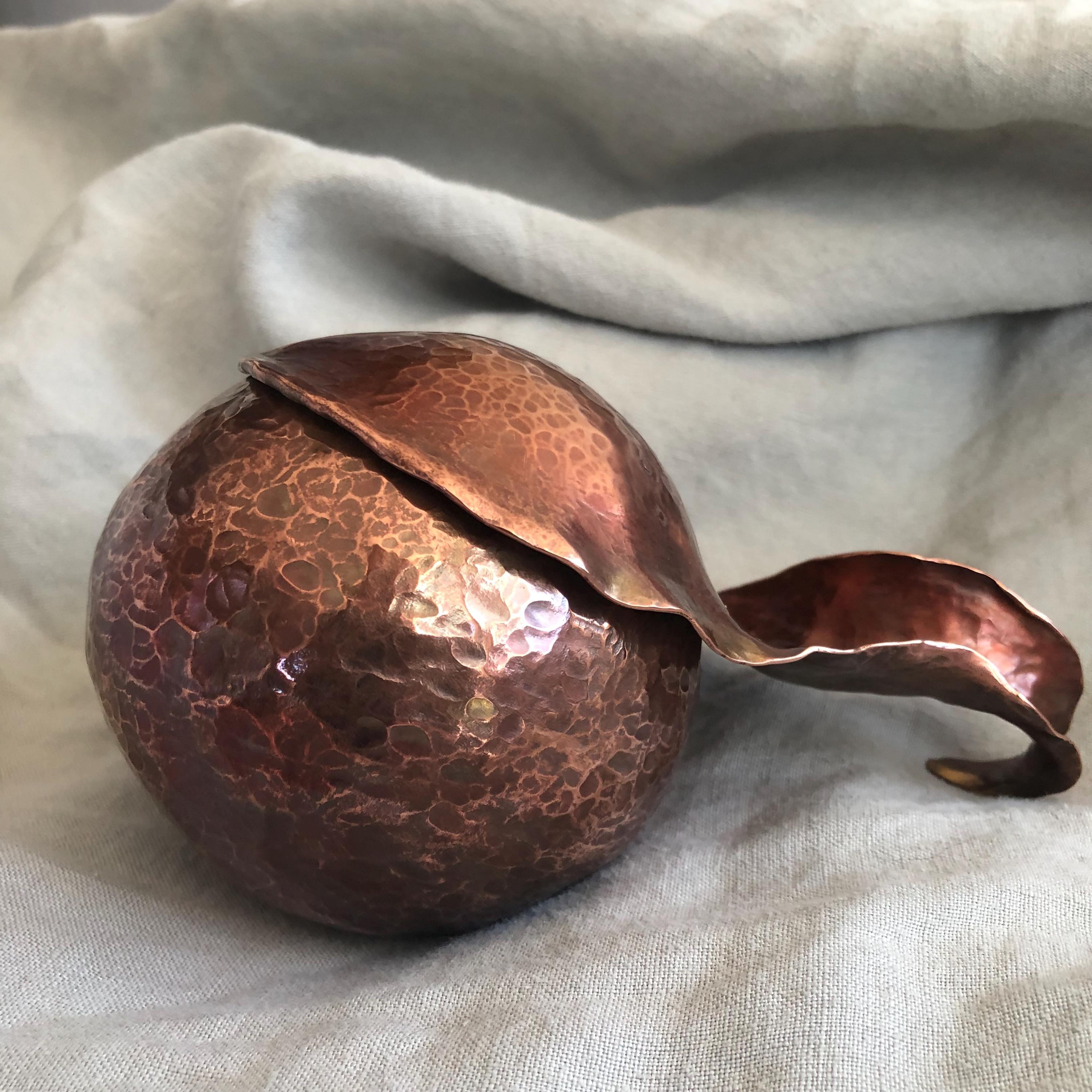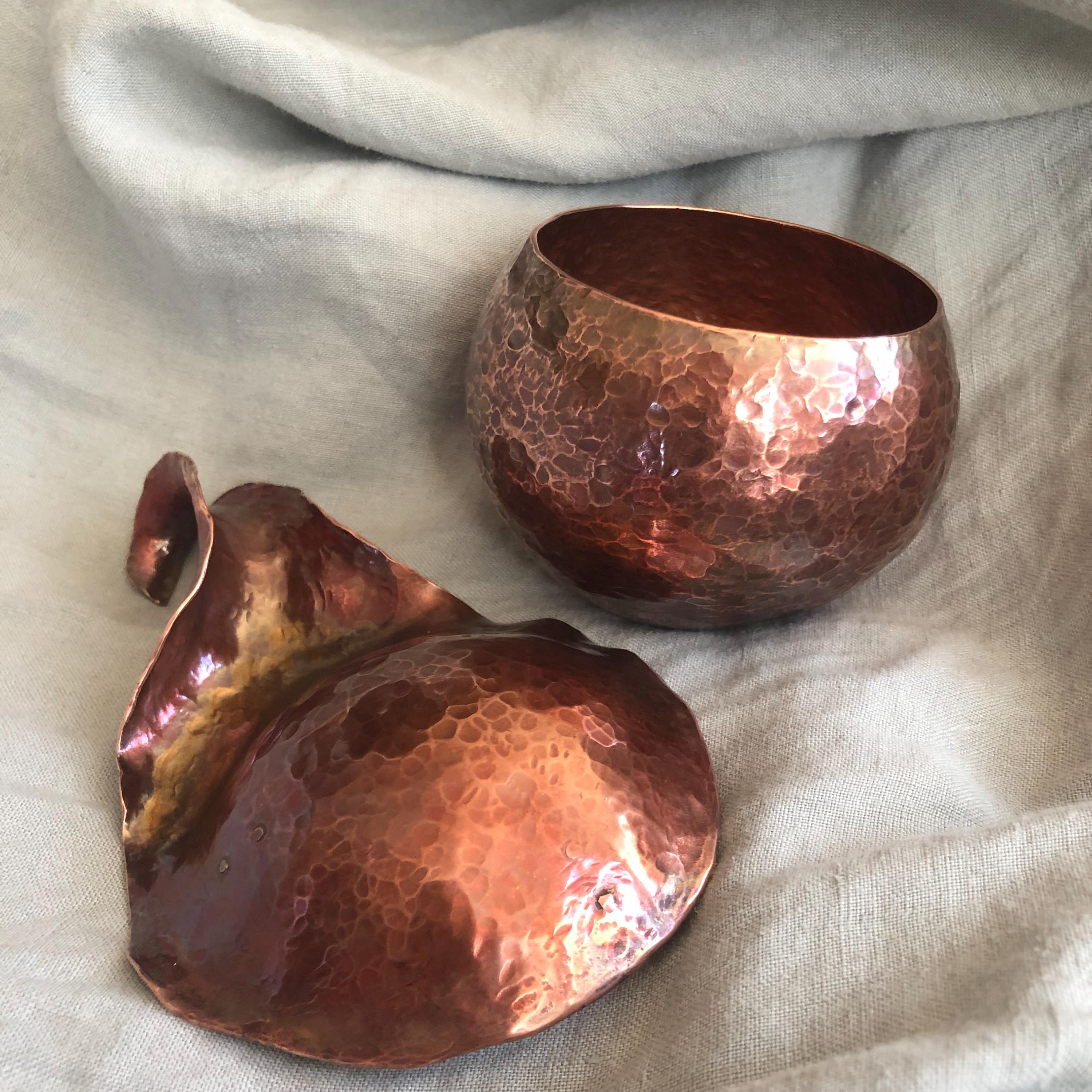 Nearly spherical, this jar was hammer-raised by hand using ancient metalsmithing techniques. Made entirely by me in my Connecticut studio. The process begins with a flat sheet of copper. I hold the flat metal at an angle against a specialized anvil or raising stake and hammer it in concentric circles, stretching it gradually upward and inward. After each round of hammering, the metal is annealed and cleaned. This vessel required eleven rounds to achieve its final shape.