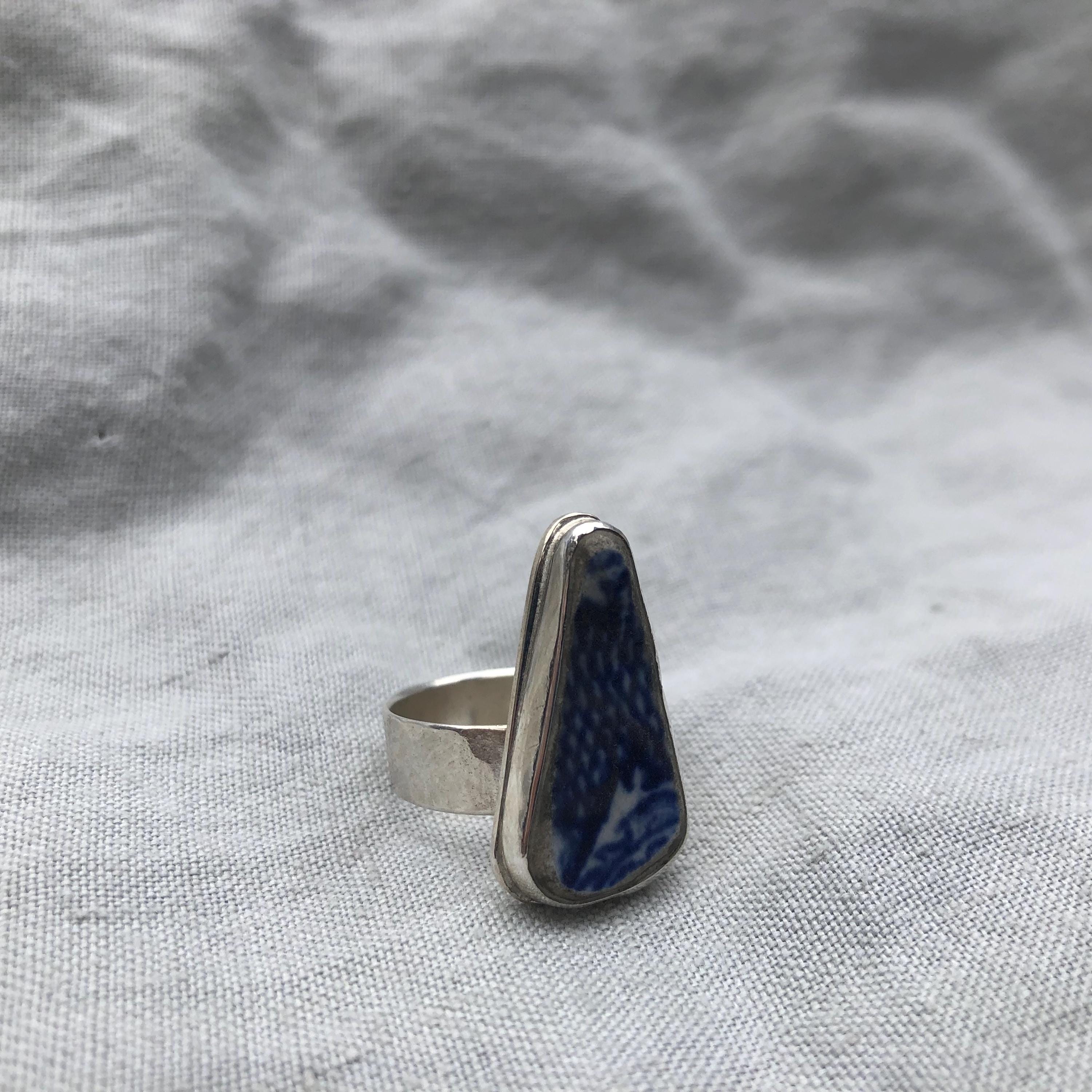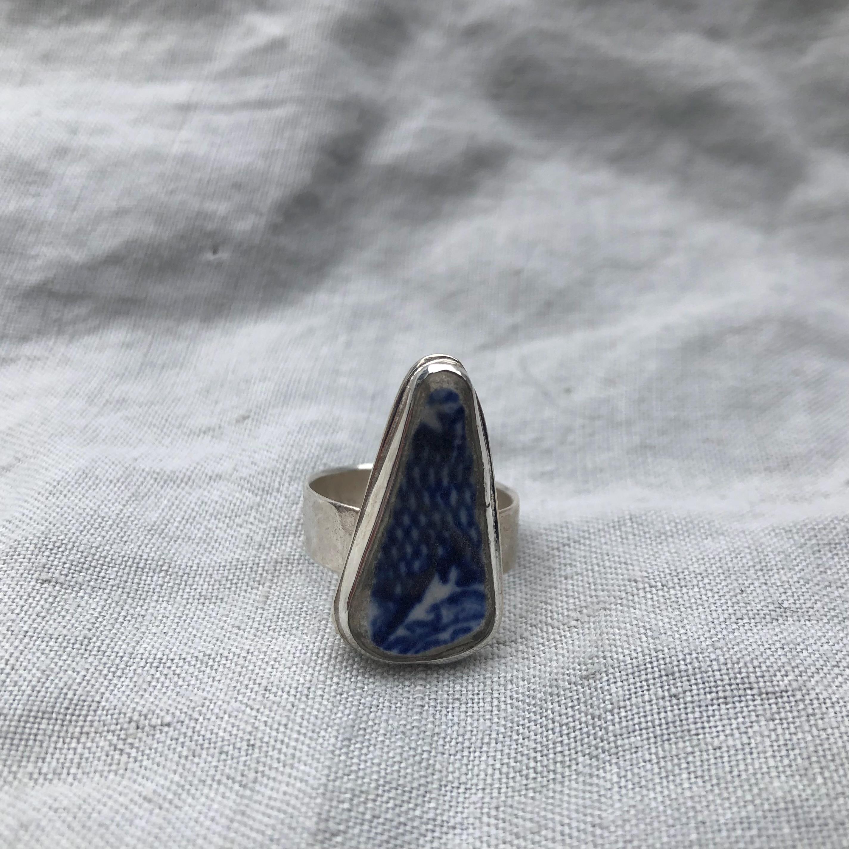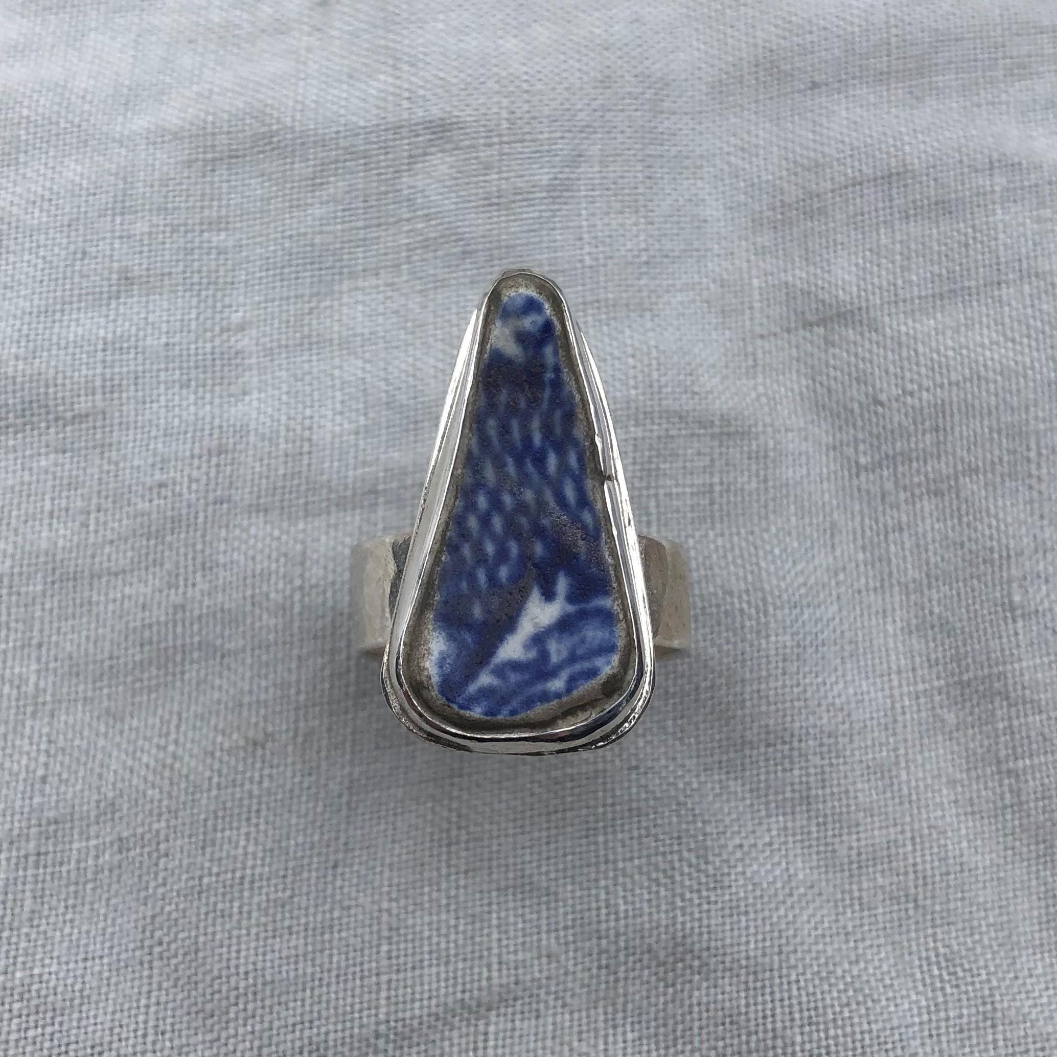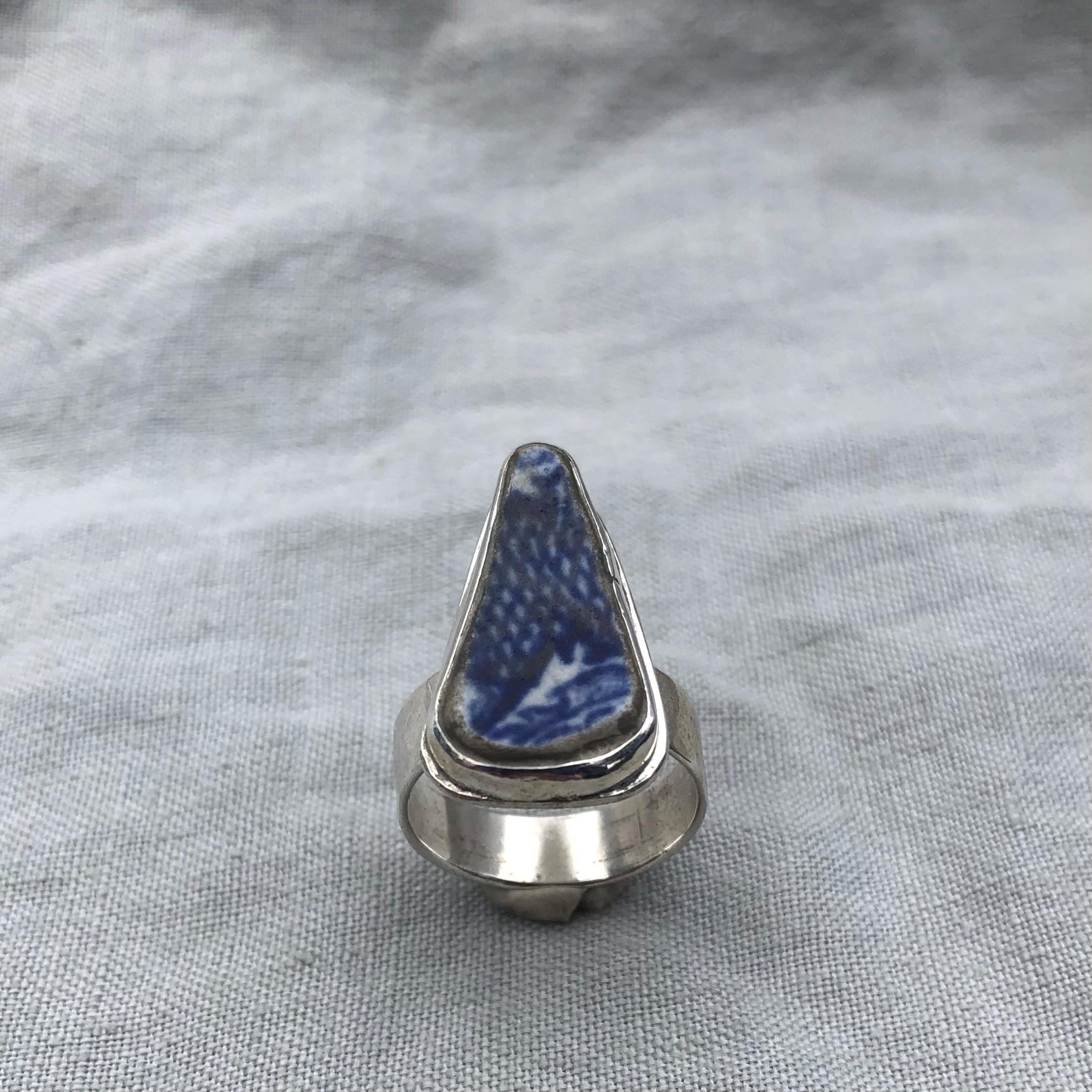 Blue and white sea pottery ring in argentium sterling silver // Wide band sea pottery ring // U.S. size 7 1/2