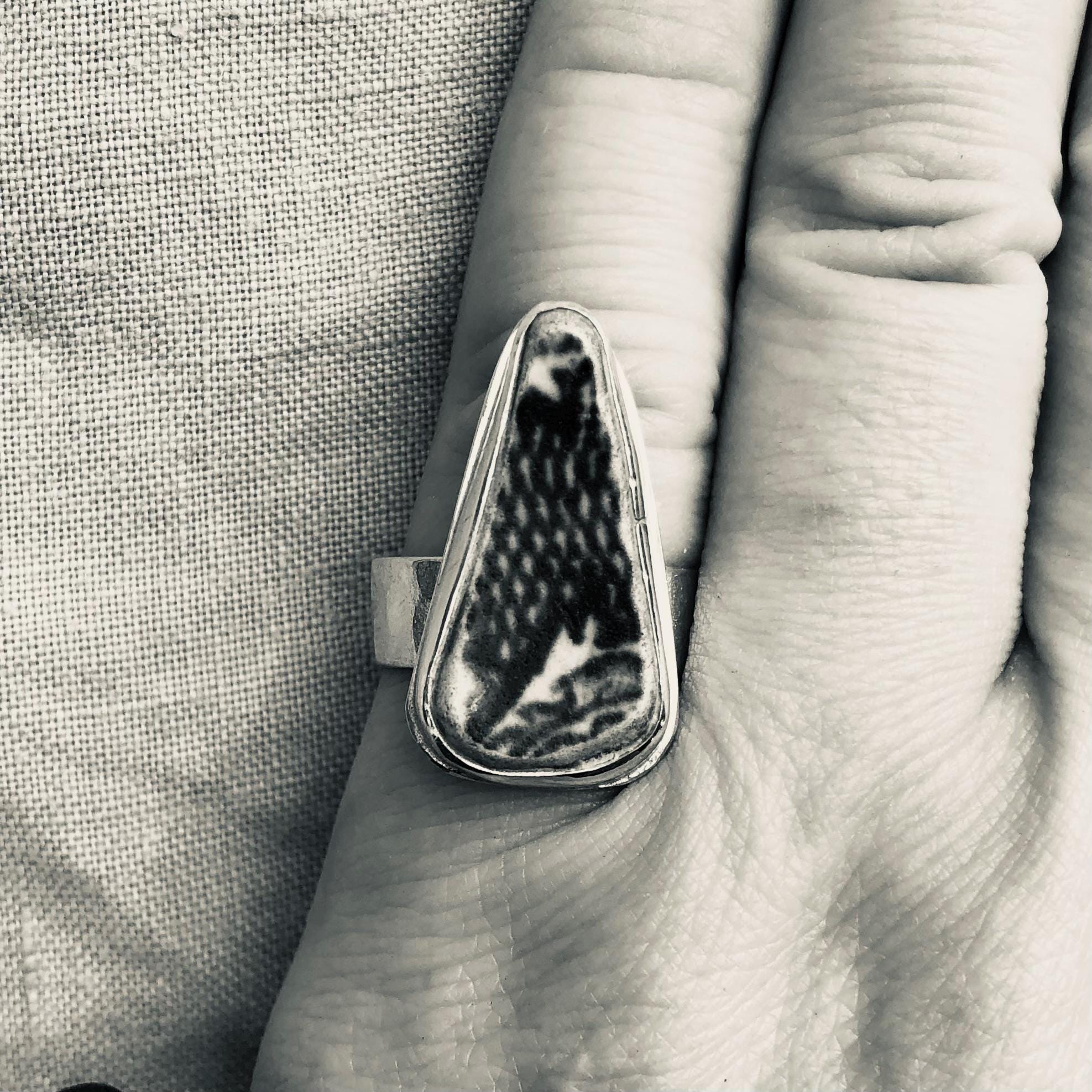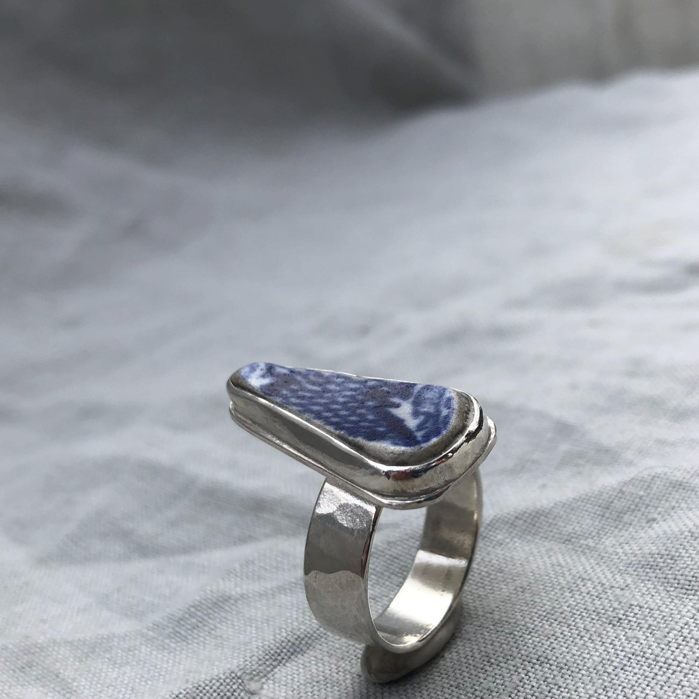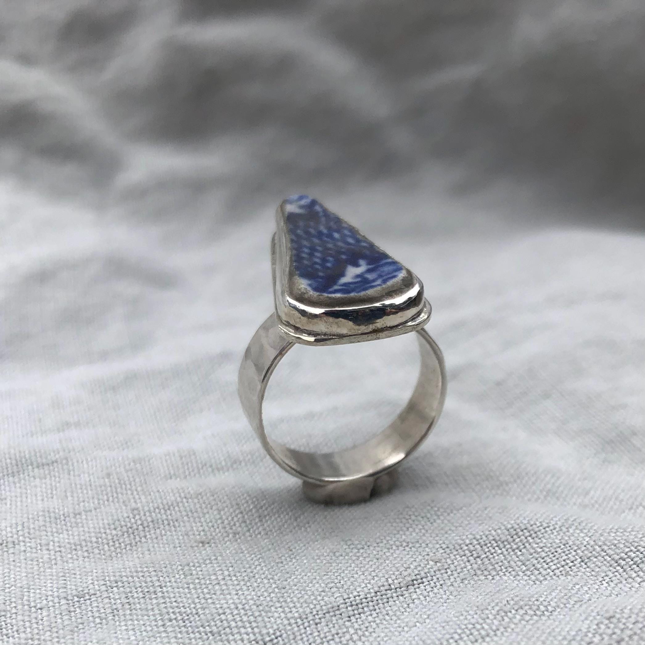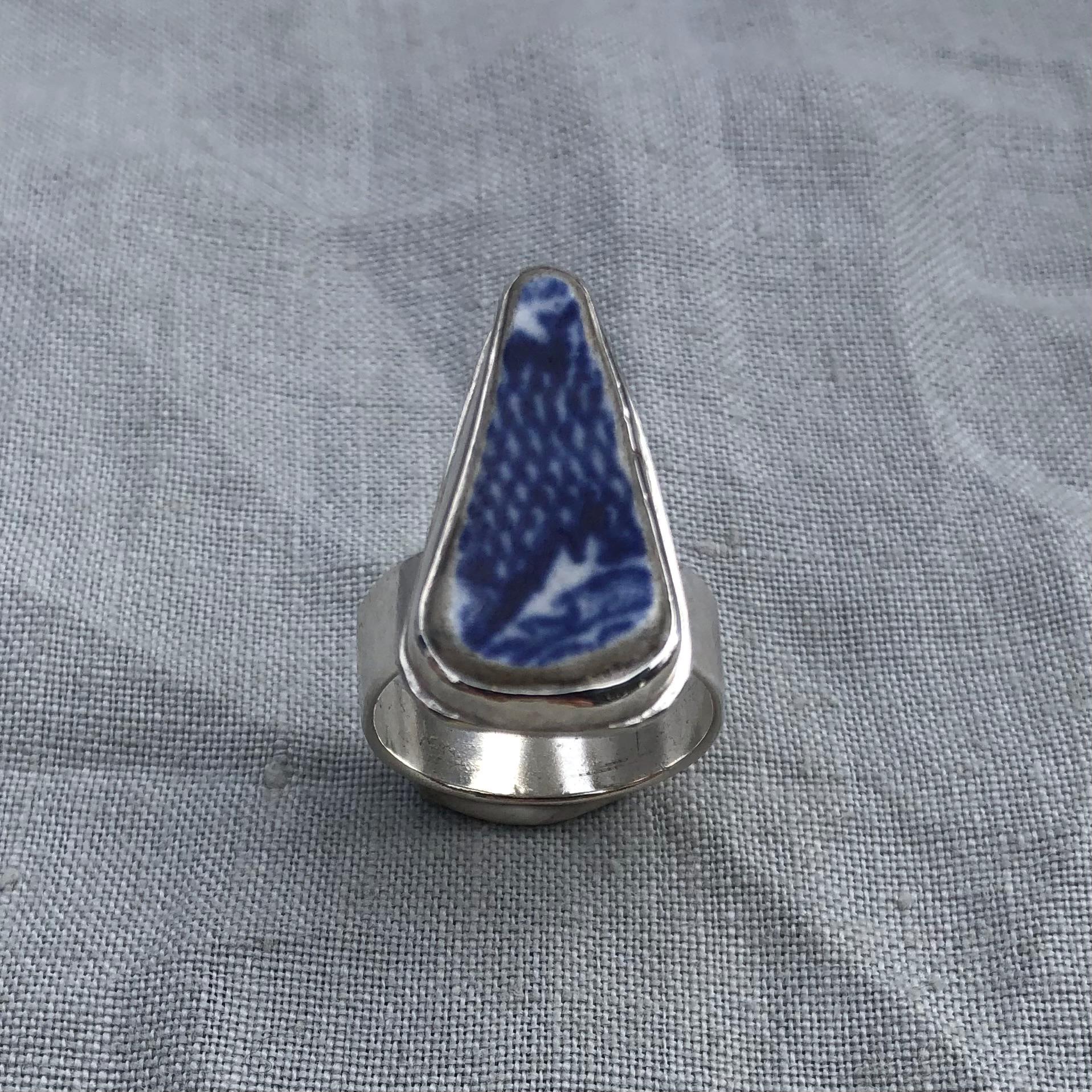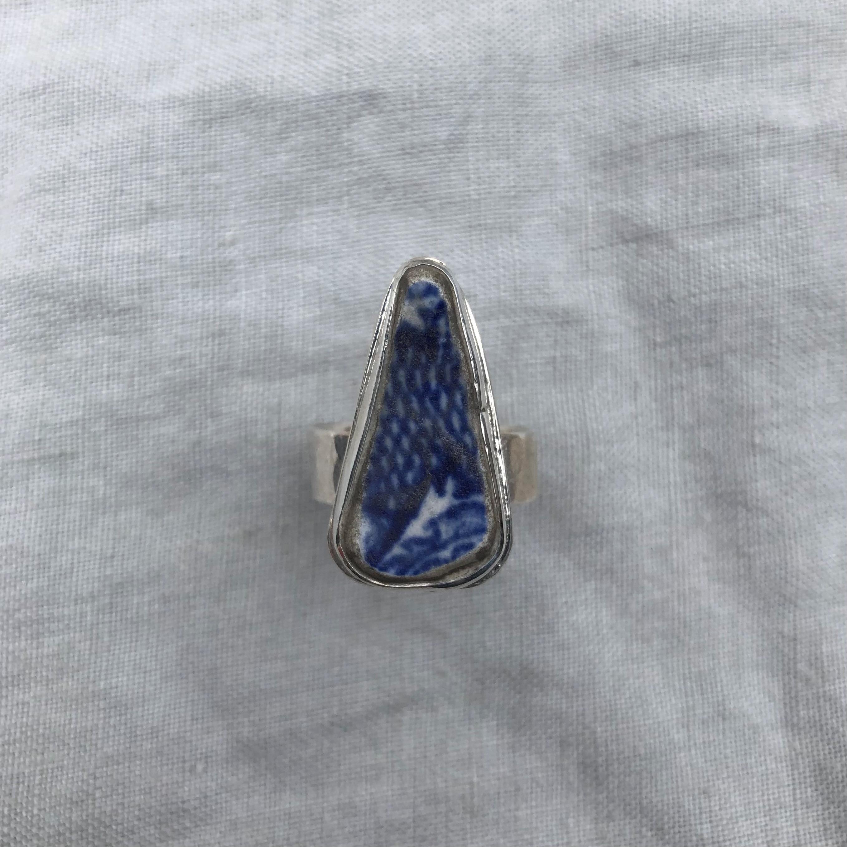 Blue and white sea pottery ring in argentium sterling silver // Wide band sea pottery ring // U.S. size 7 1/2