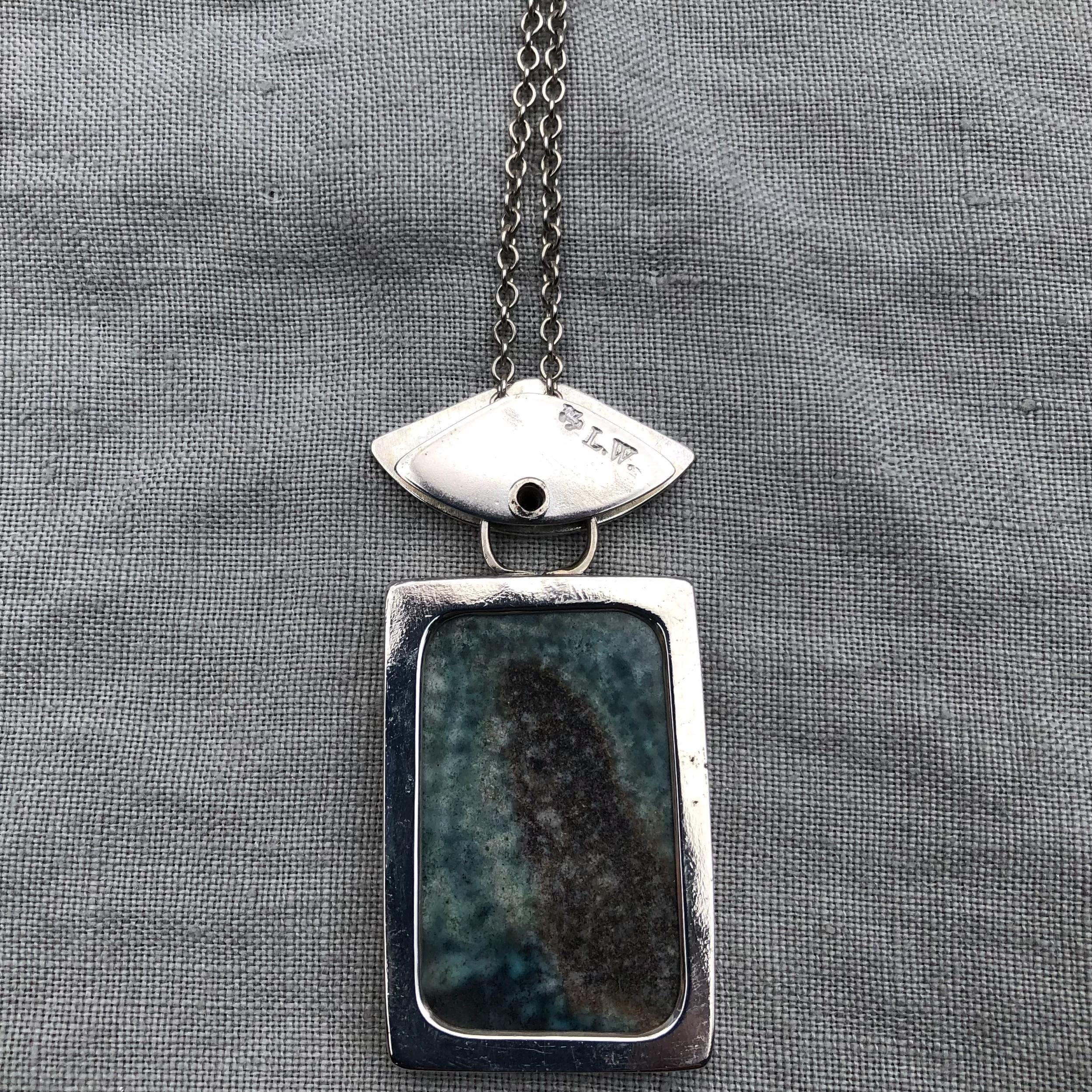 I don't know what you see in the natural opalized petrified wood cabochon featured in this pendant, but I see a humpback whale's flipper about to smack the surface of the ocean. Both sides of the pendant are open so you can see as much of the stone as possible. Entirely handmade by me in my Connecticut studio, the pendant is equal parts natural and geometric, which a touch of Asian influence in the innovative bail.