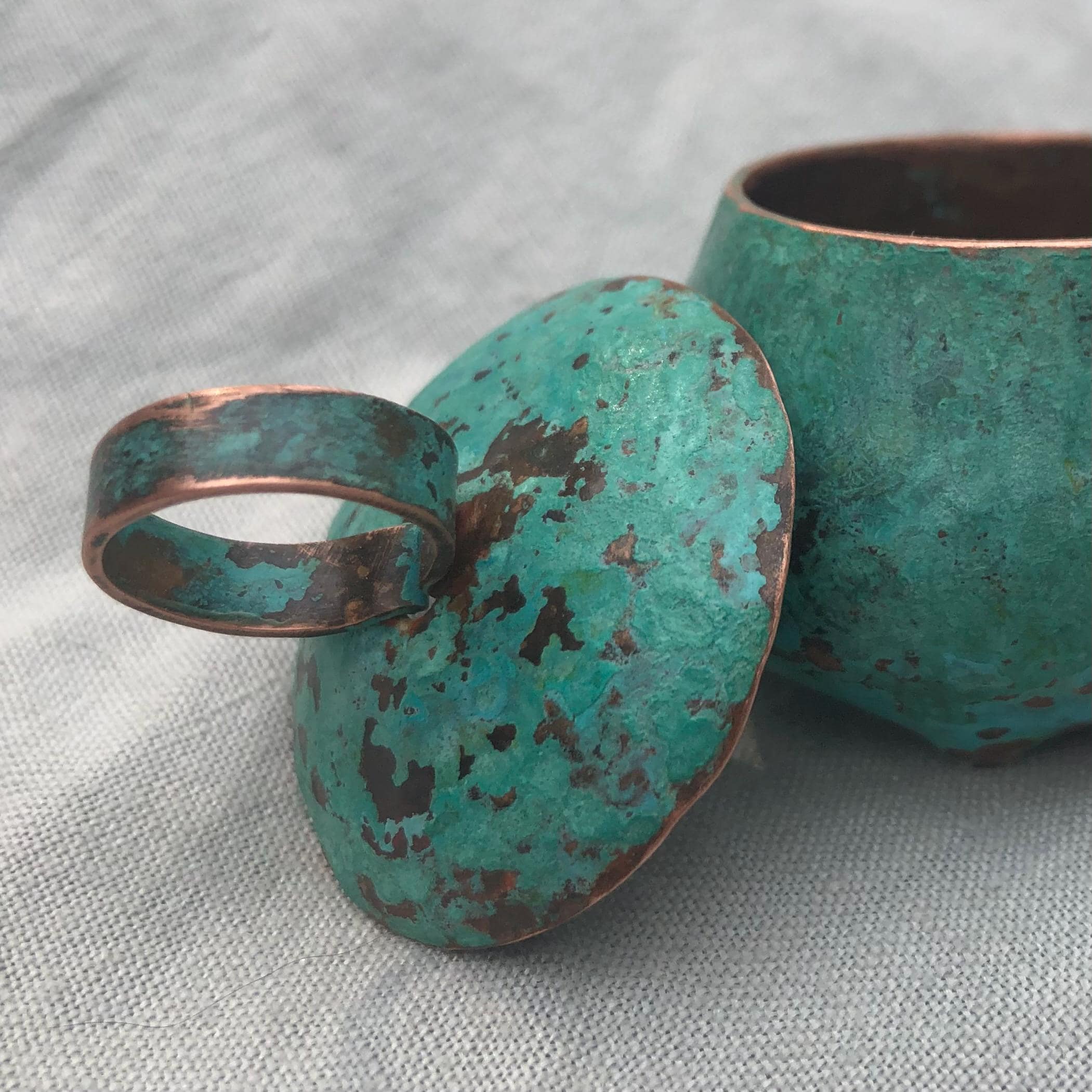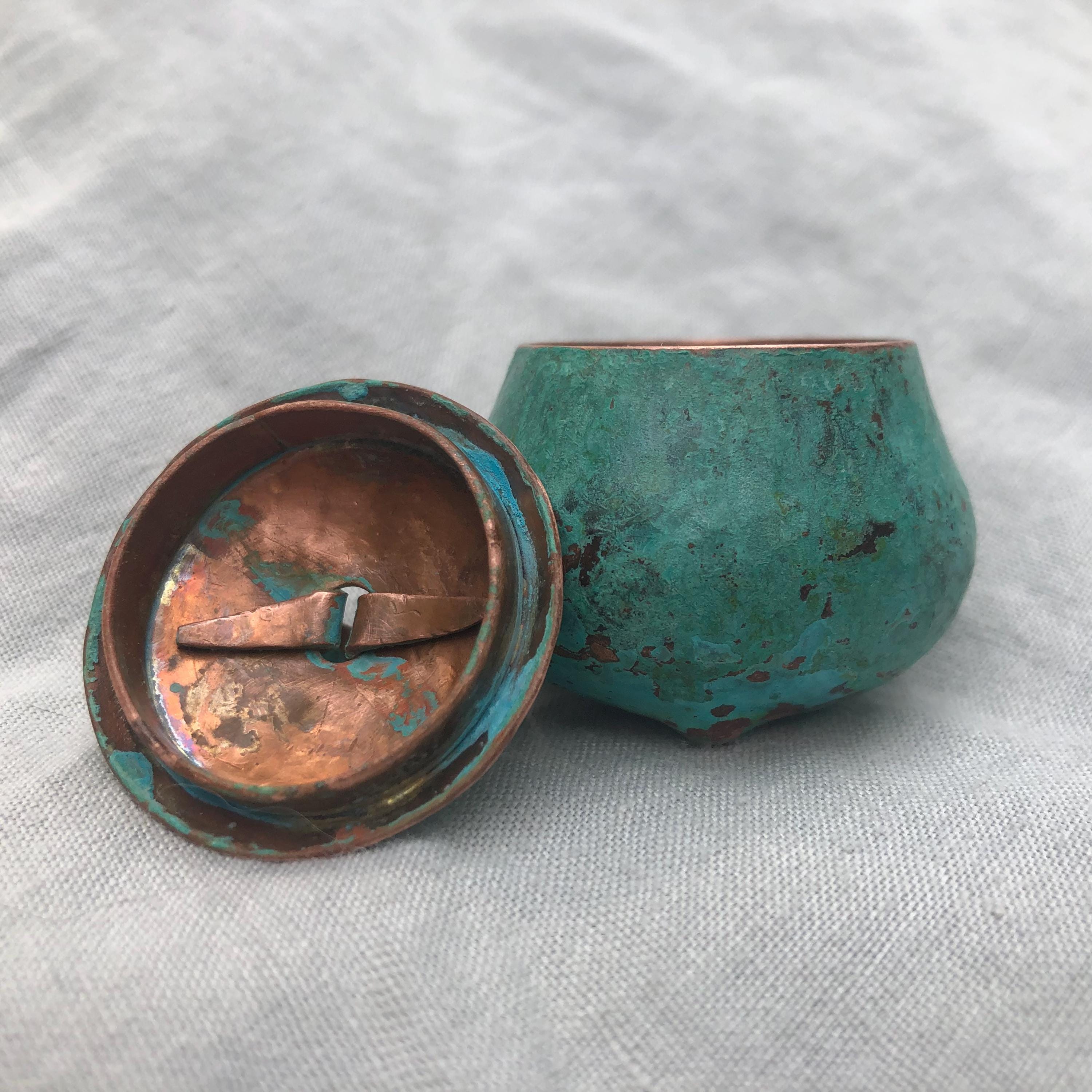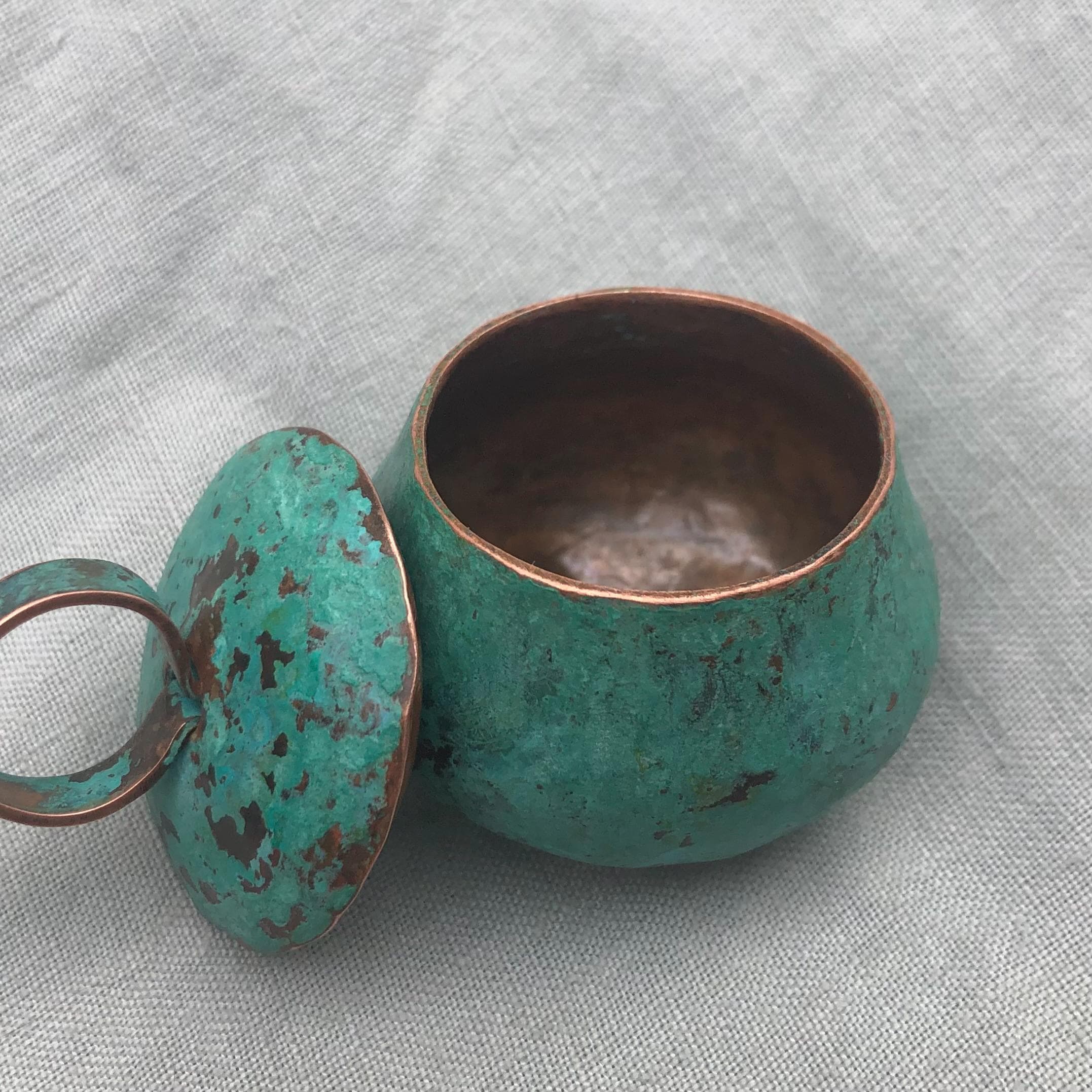 Small lidded jar with blue-green verdigris patina // Distressed verdigris copper jar