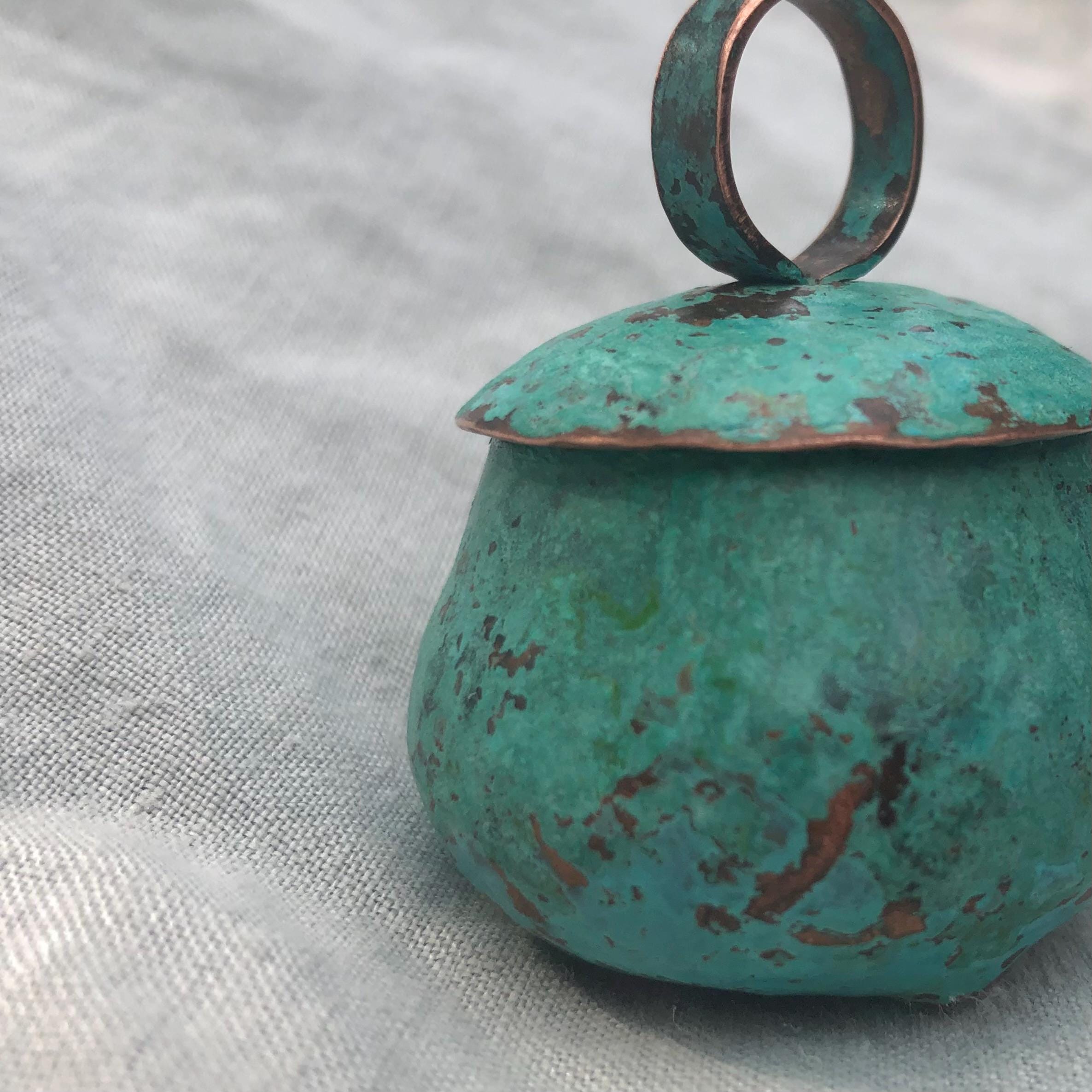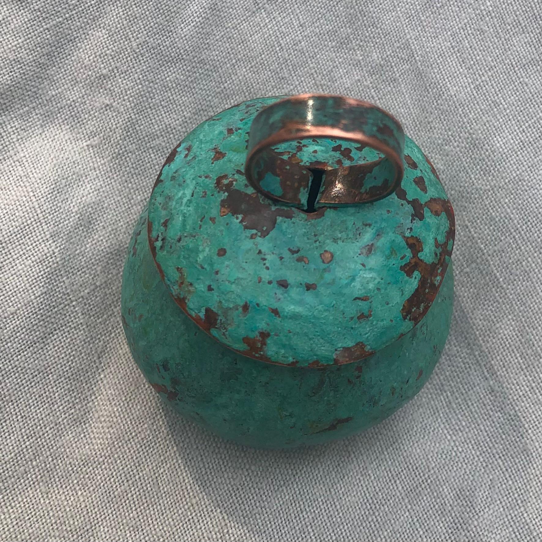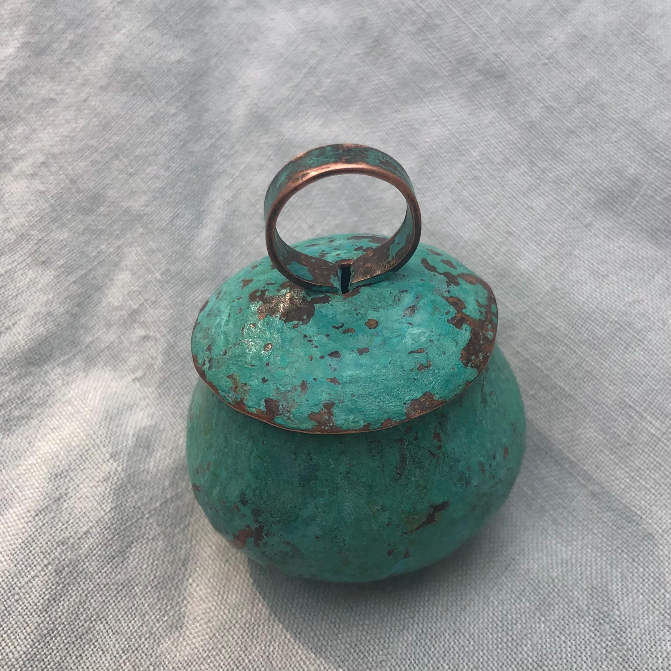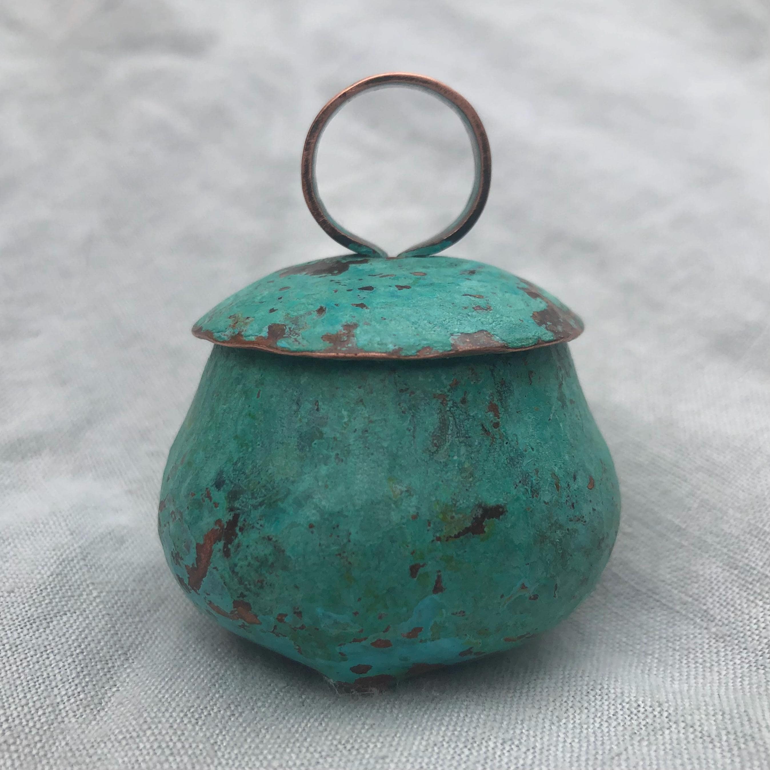 Small lidded jar with blue-green verdigris patina // Distressed verdigris copper jar