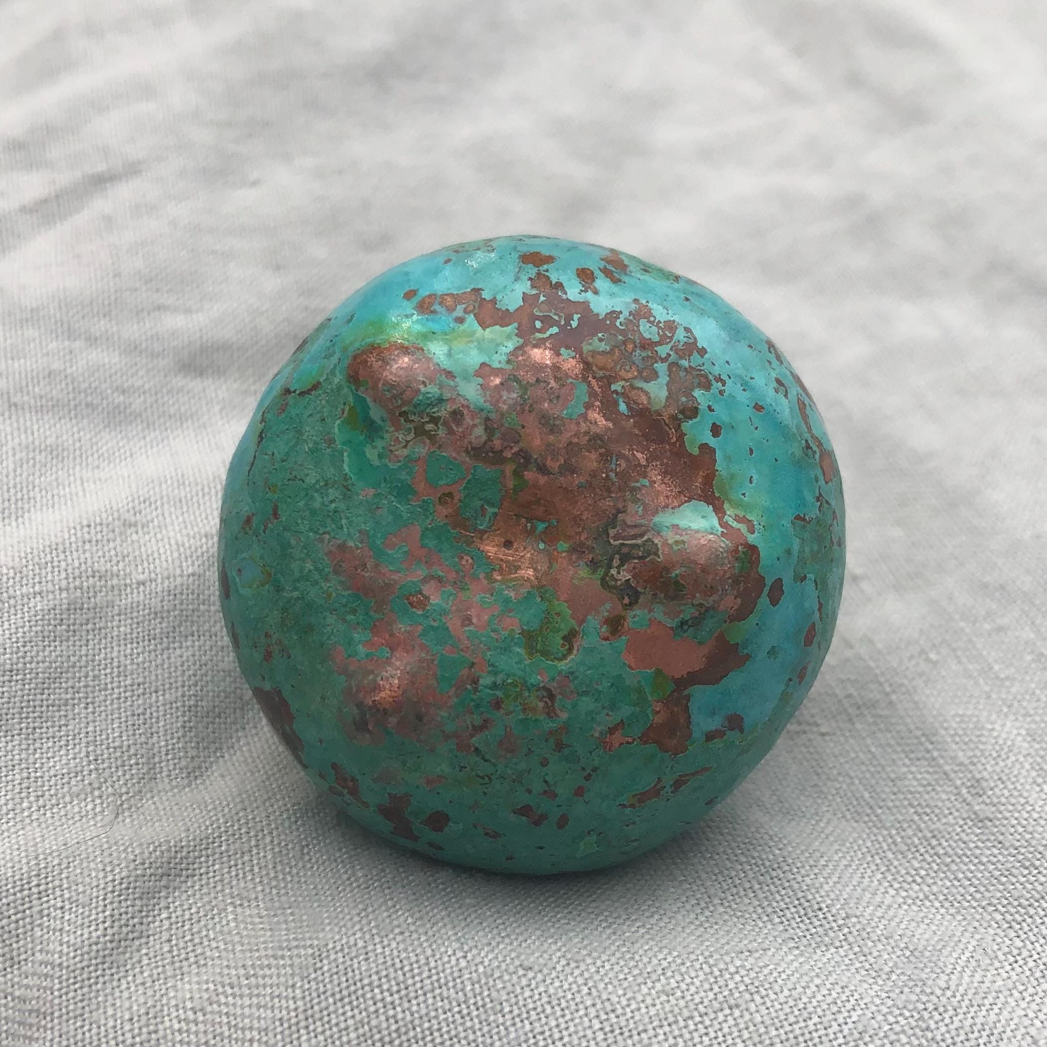 This little verdigris copper jar is only about two inches high. It fits in the palm of your hand. A perfect place for tiny secrets or to give a burst of color to a hidden corner. The distressed verdigris patina ranges from sea-green to aqua. The inside of the jar is a natural copper color. The whole piece is sealed with a museum-quality sealant and will not fade, chip, or peel. Three little feet on the bottom of the jar keep it stable (and adorable).
