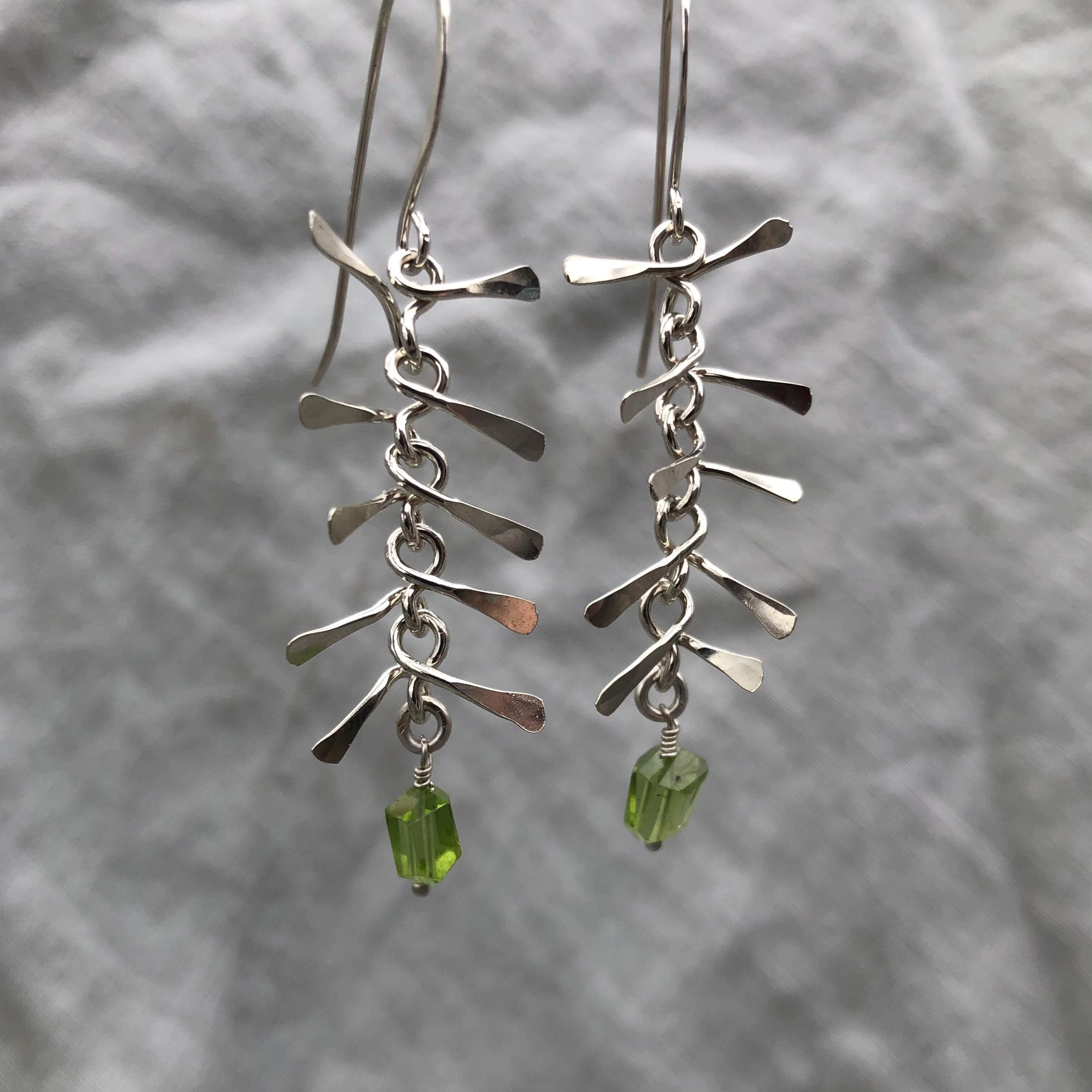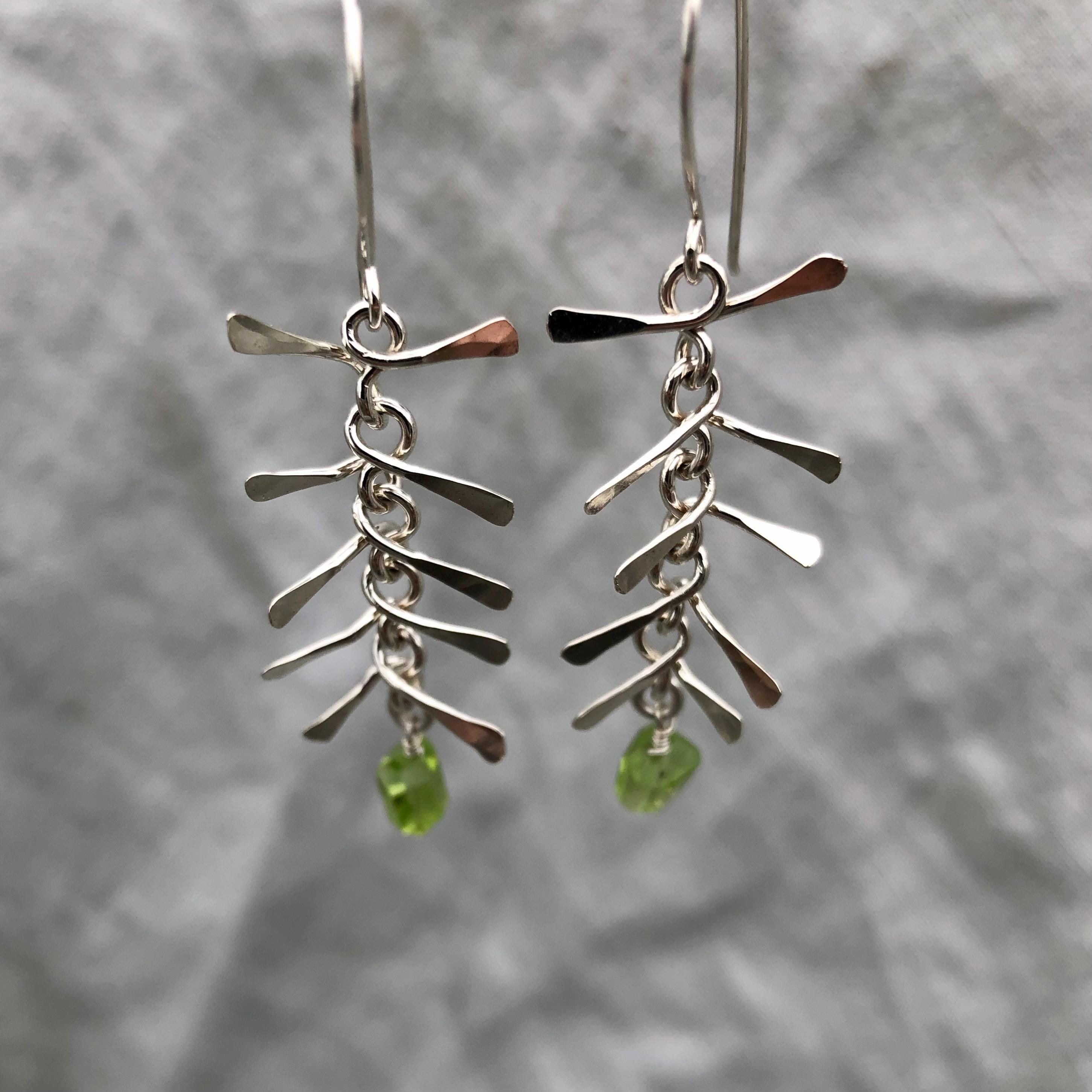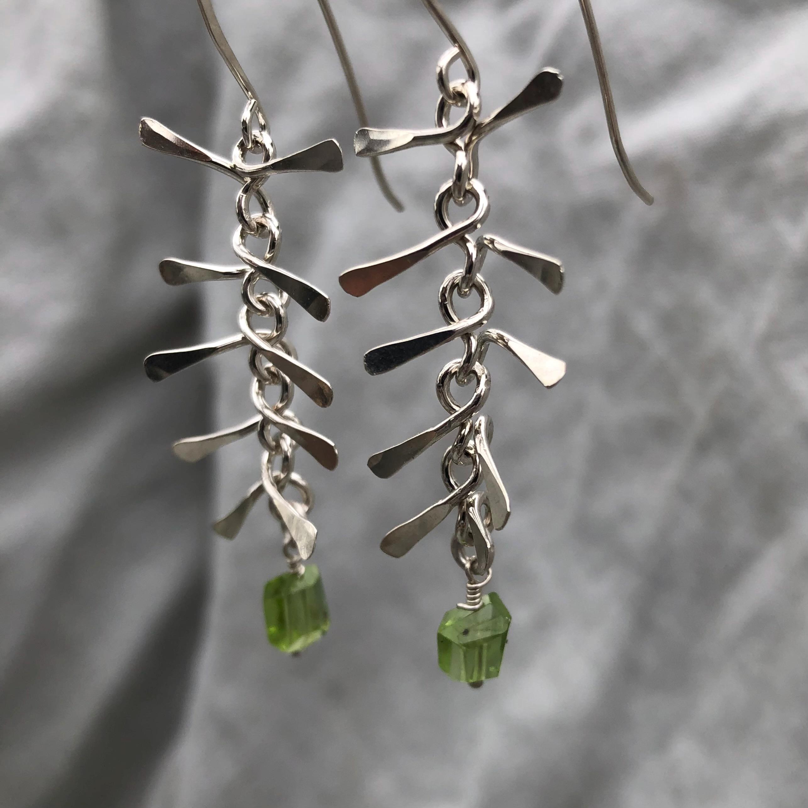 Ribcage earrings in argentium sterling silver with asymmetrical Arizona peridot // Kinetic sculptural earrings