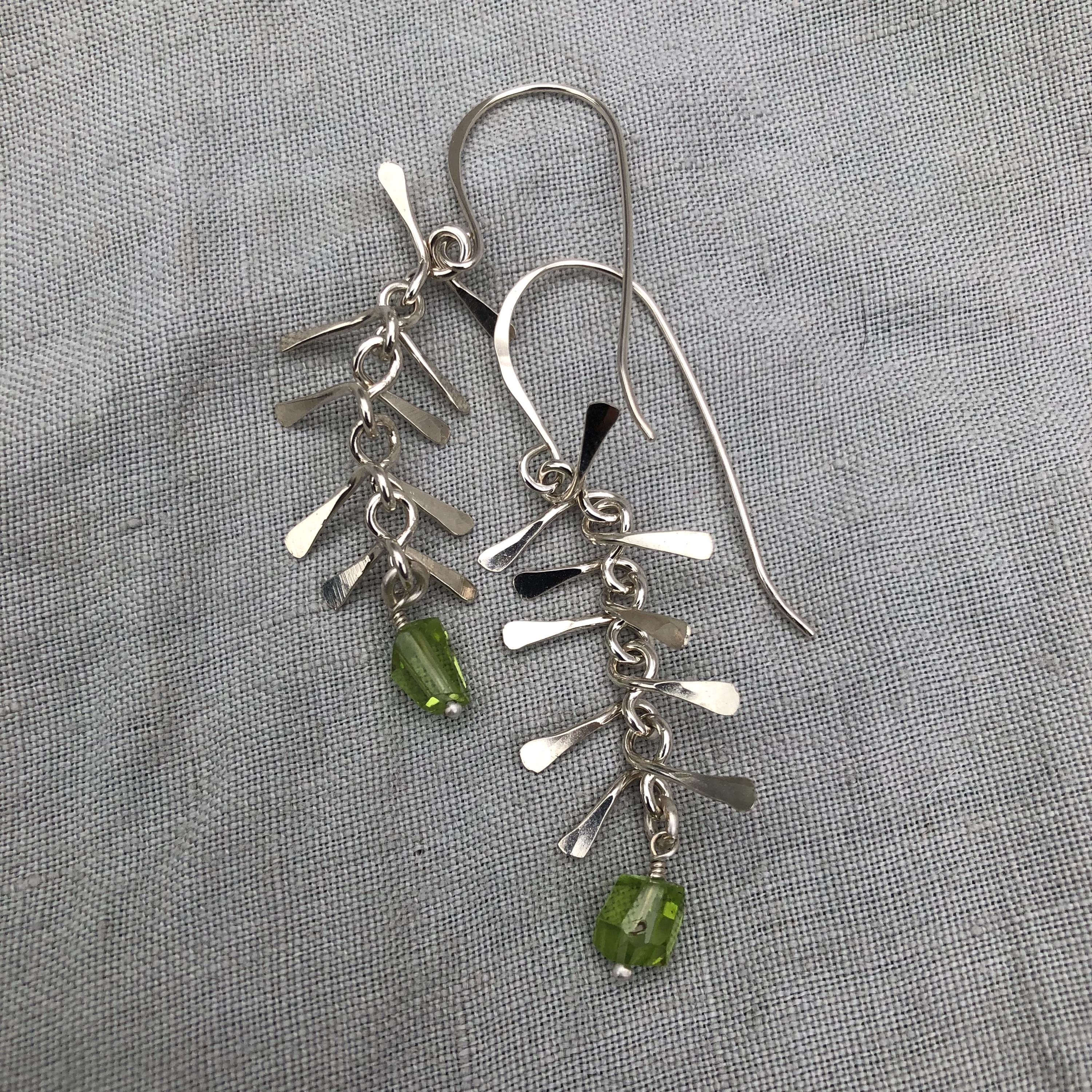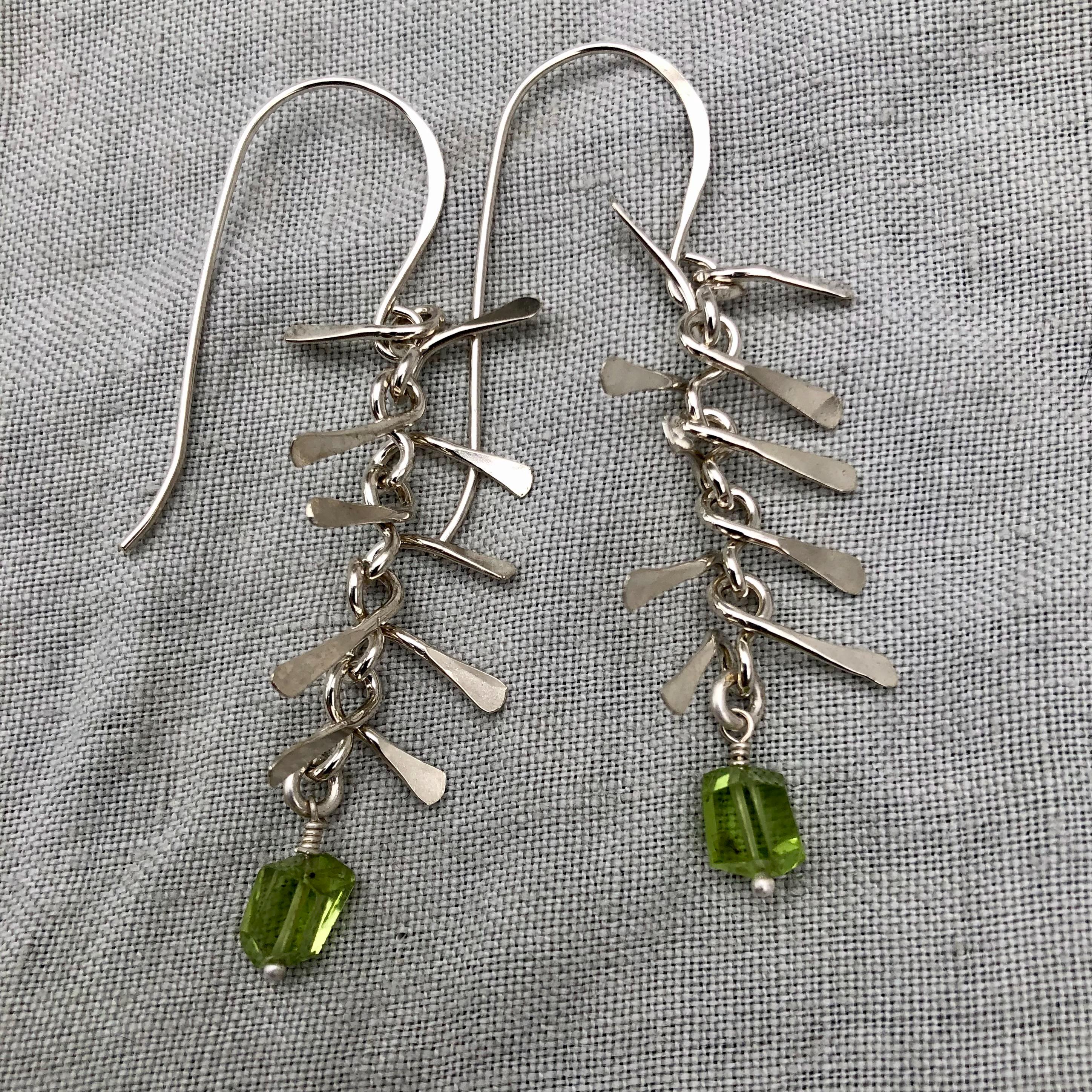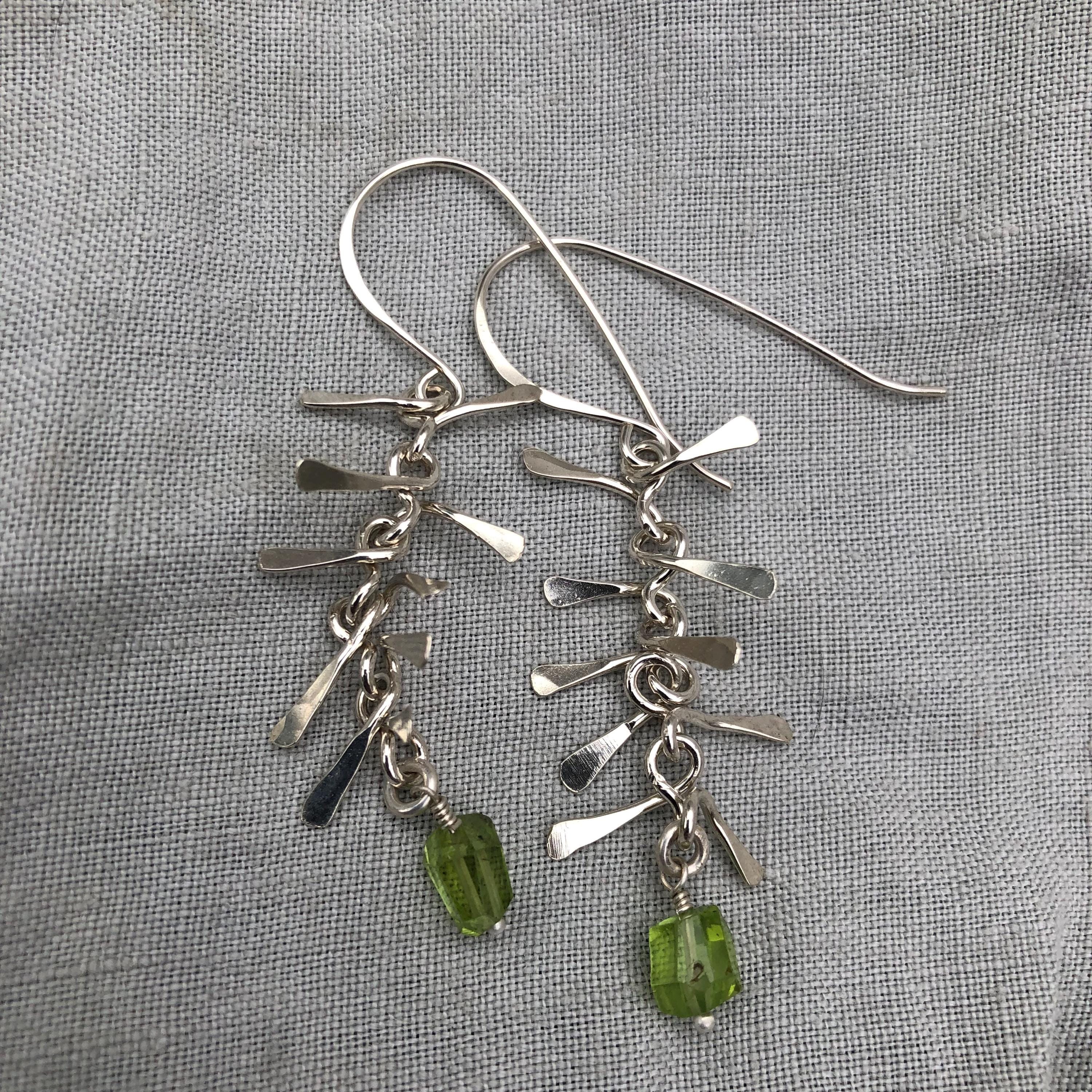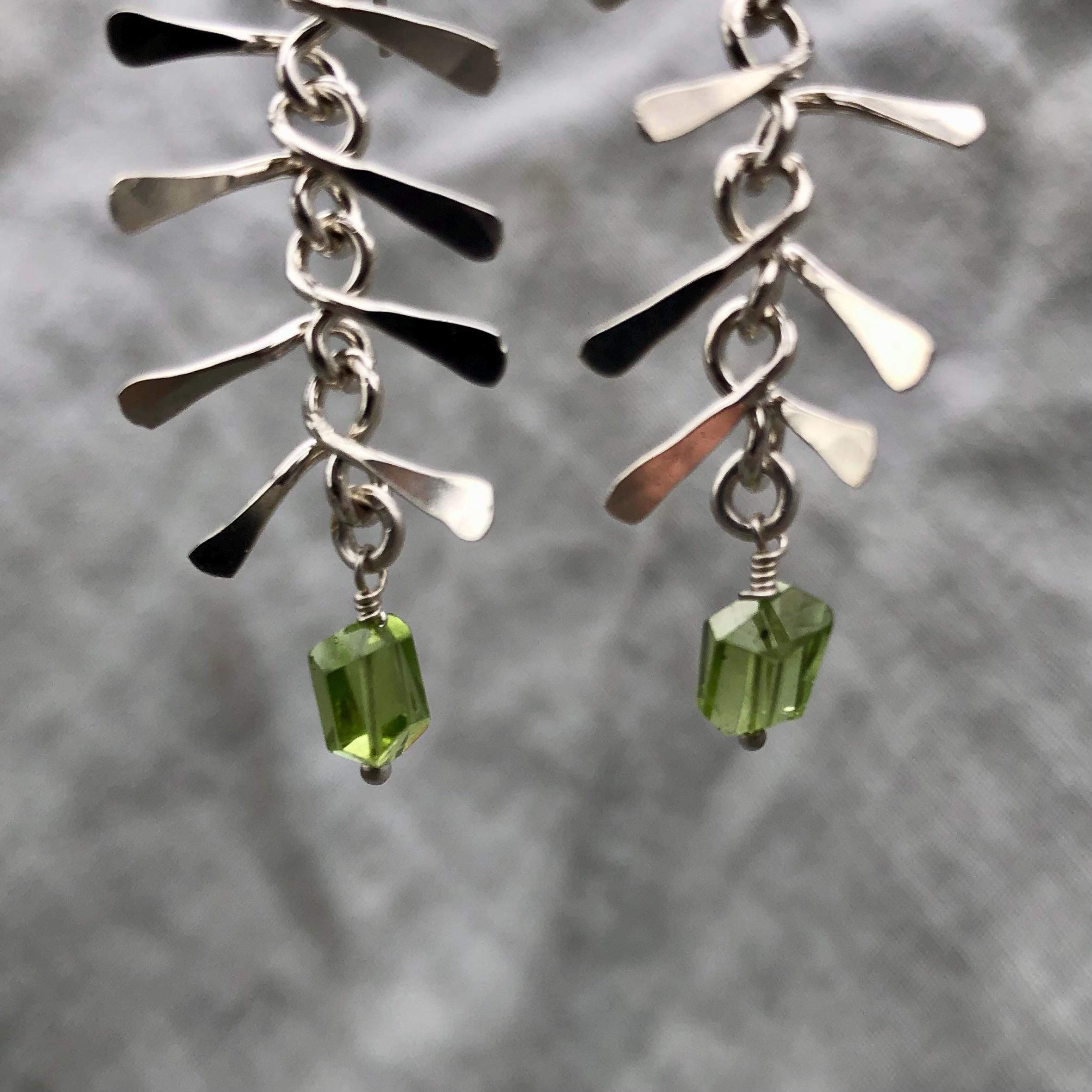 Ribcage earrings in argentium sterling silver with asymmetrical Arizona peridot // Kinetic sculptural earrings