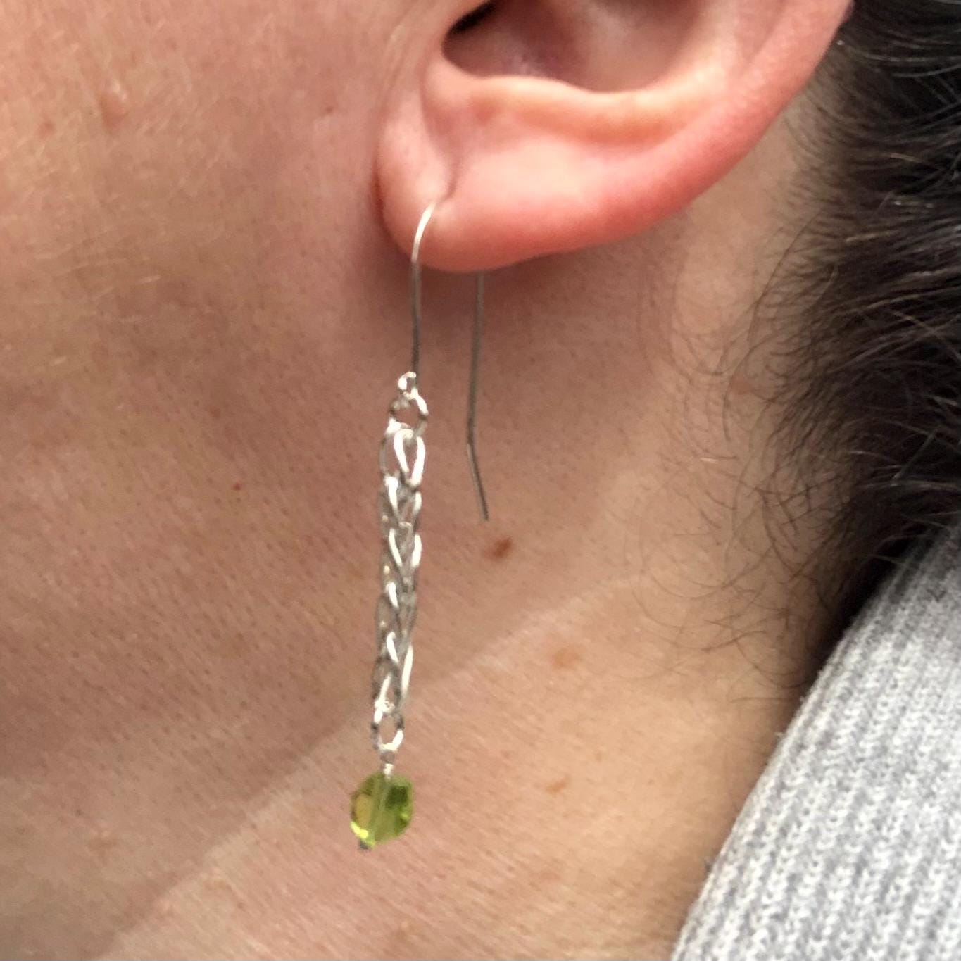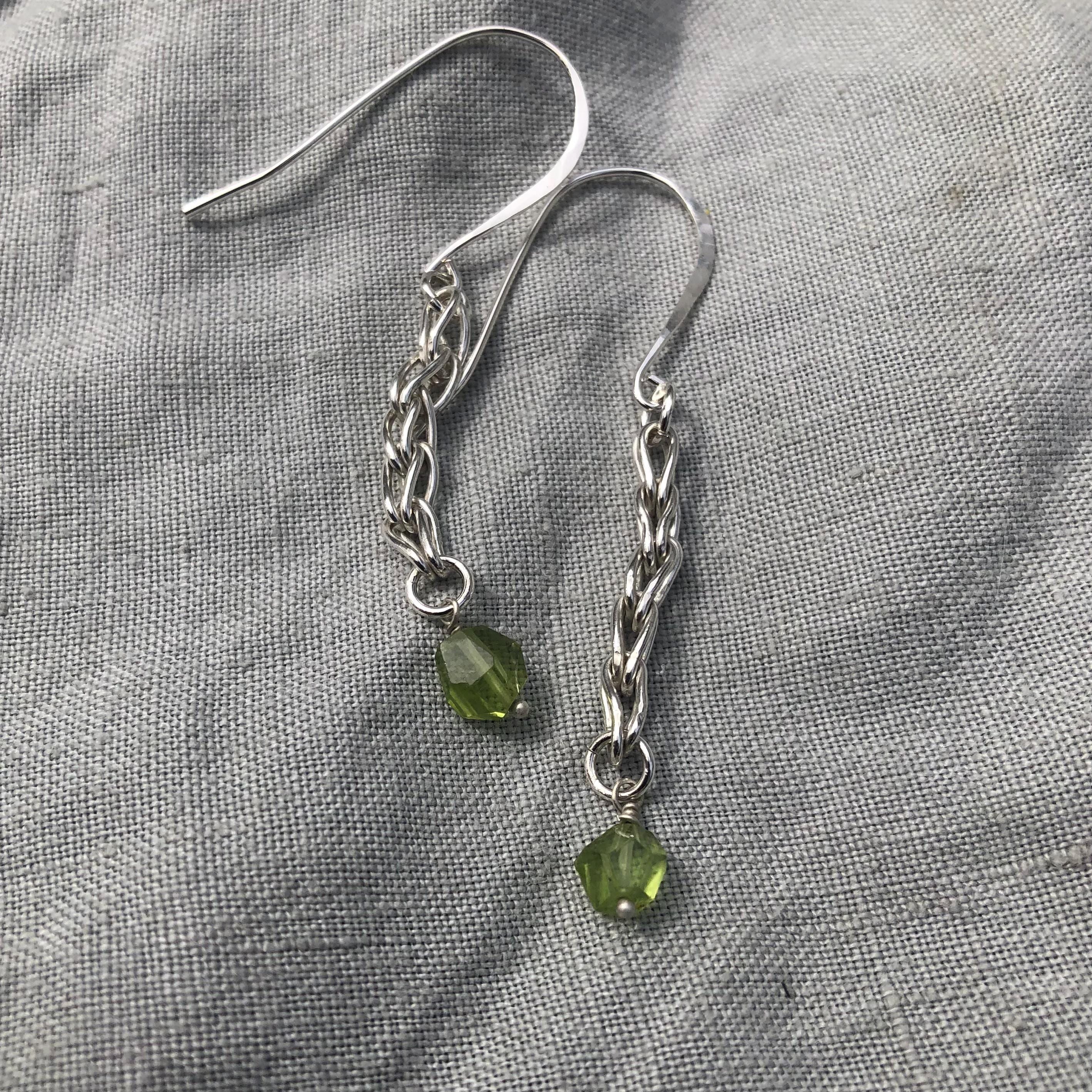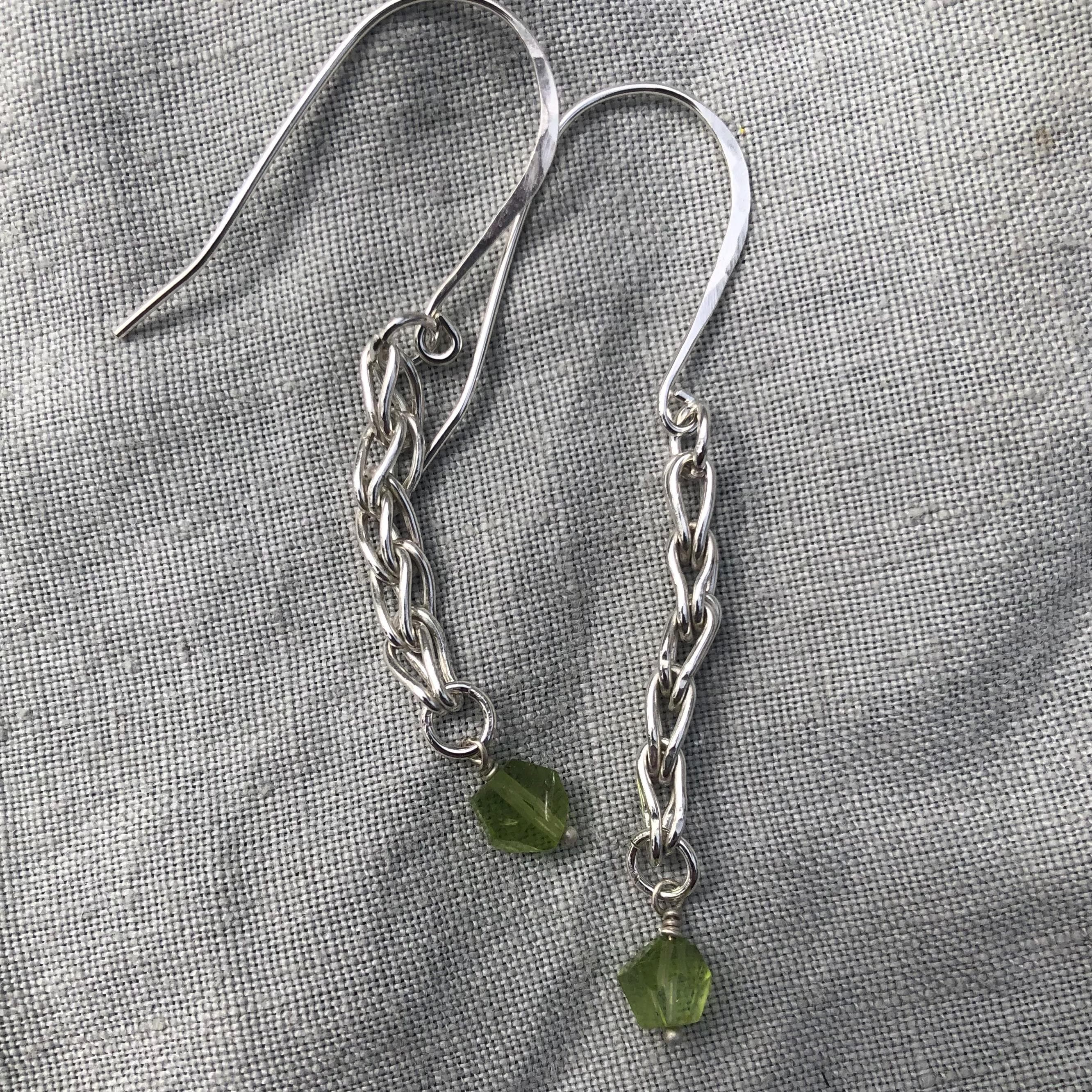 Loop-in-loop earrings in argentium sterling silver with geometric apple-green Arizona peridot