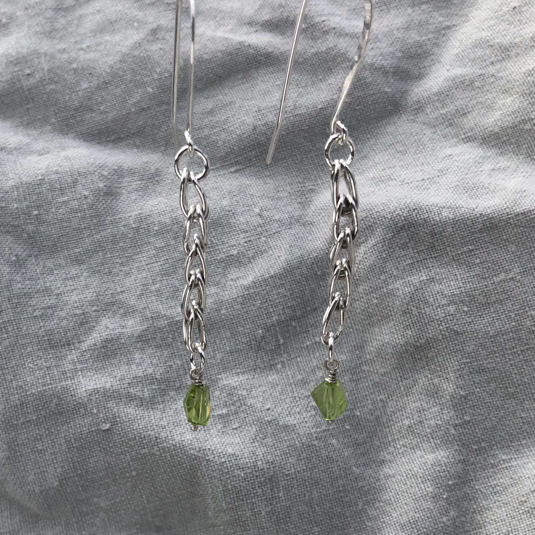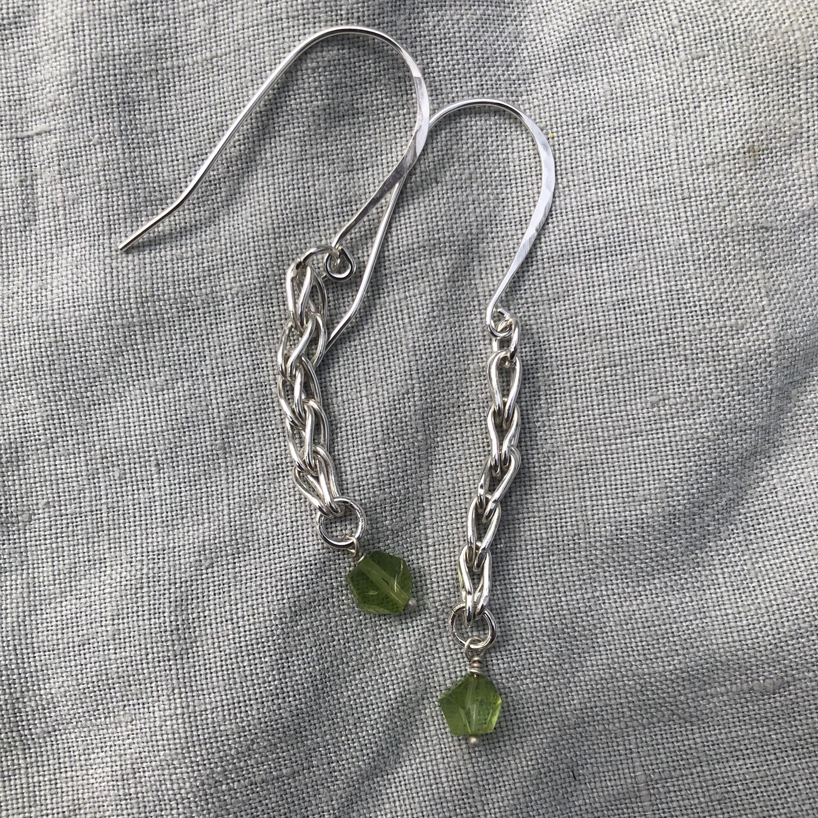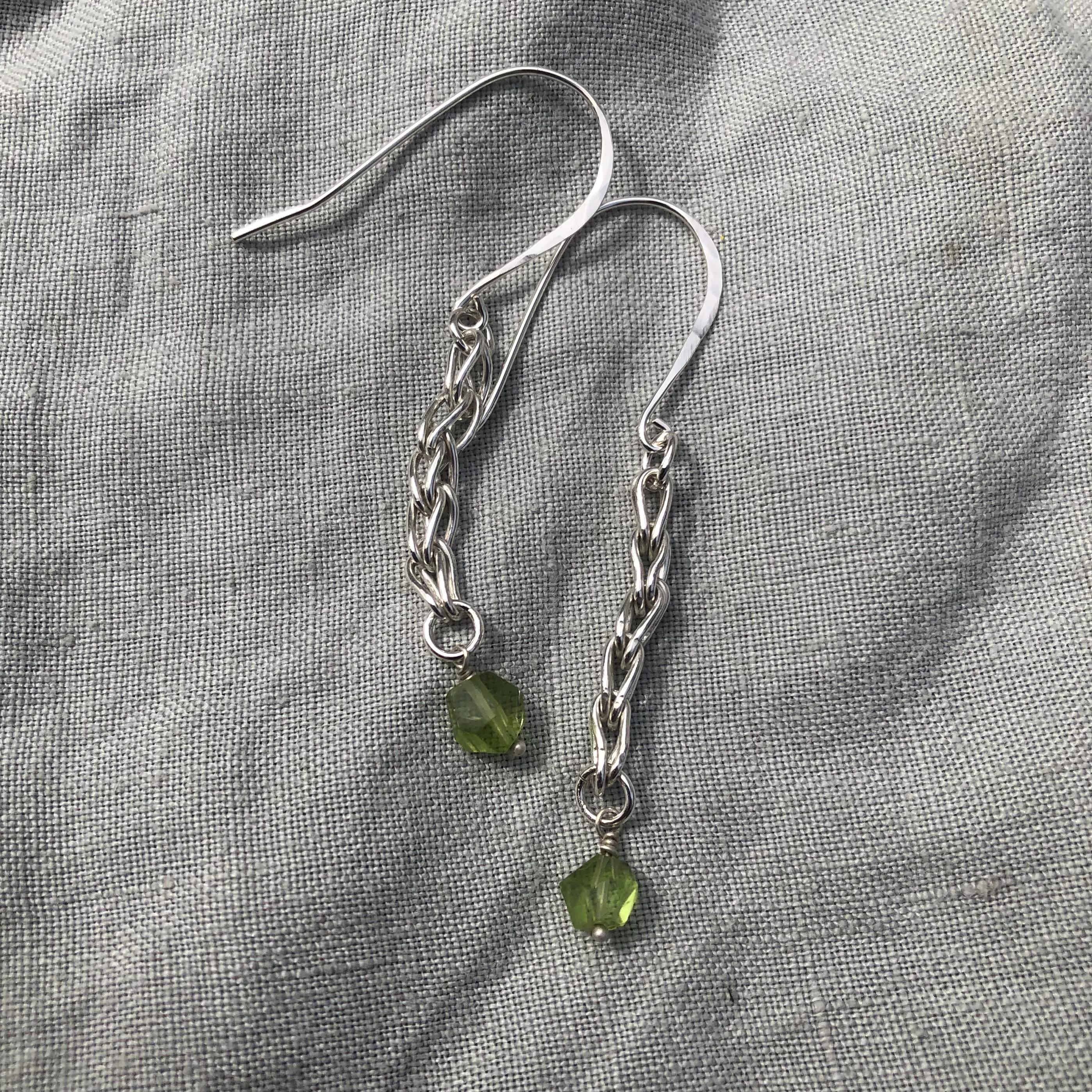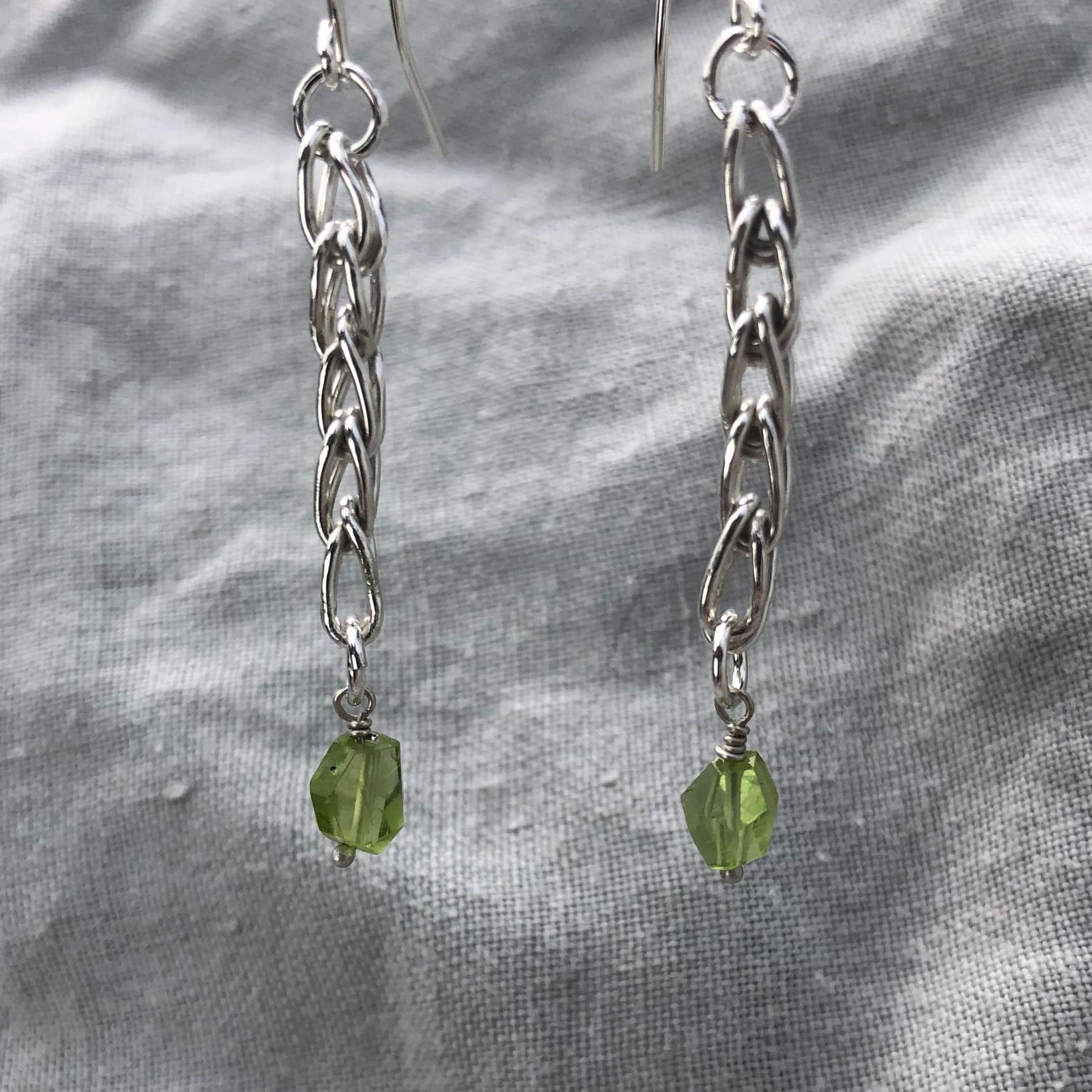 Designed and entirely handmade by me in my Clinton, Connecticut studio, featuring American-mined Arizona peridot in a geometric cut and a bright apple green color. The loop-in-loop chain is an ancient design (it goes back to the Etruscans) which creates sinuous movement, and each link was formed by me from argentium sterling wire. Lightweight and easy to wear. Organic geometry.