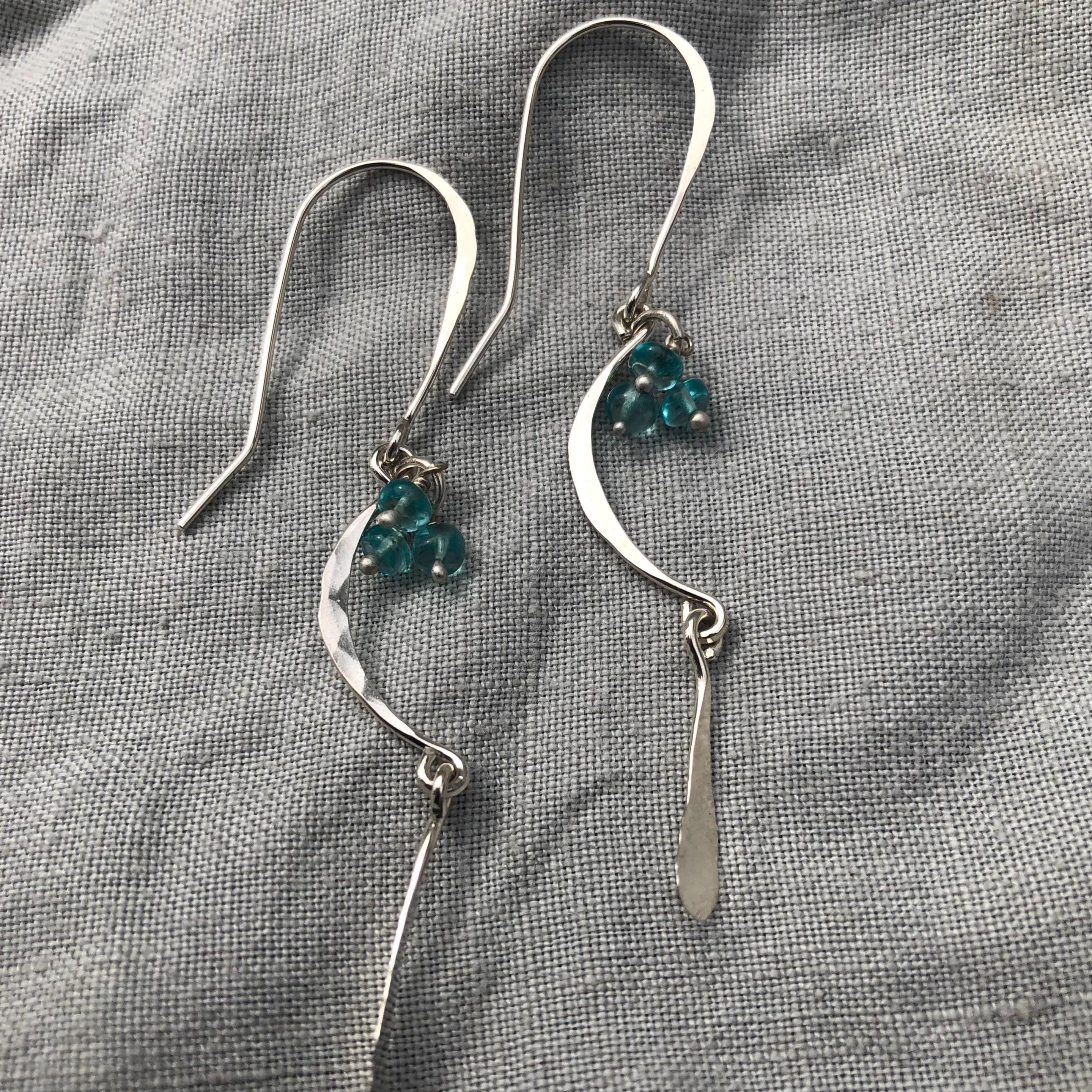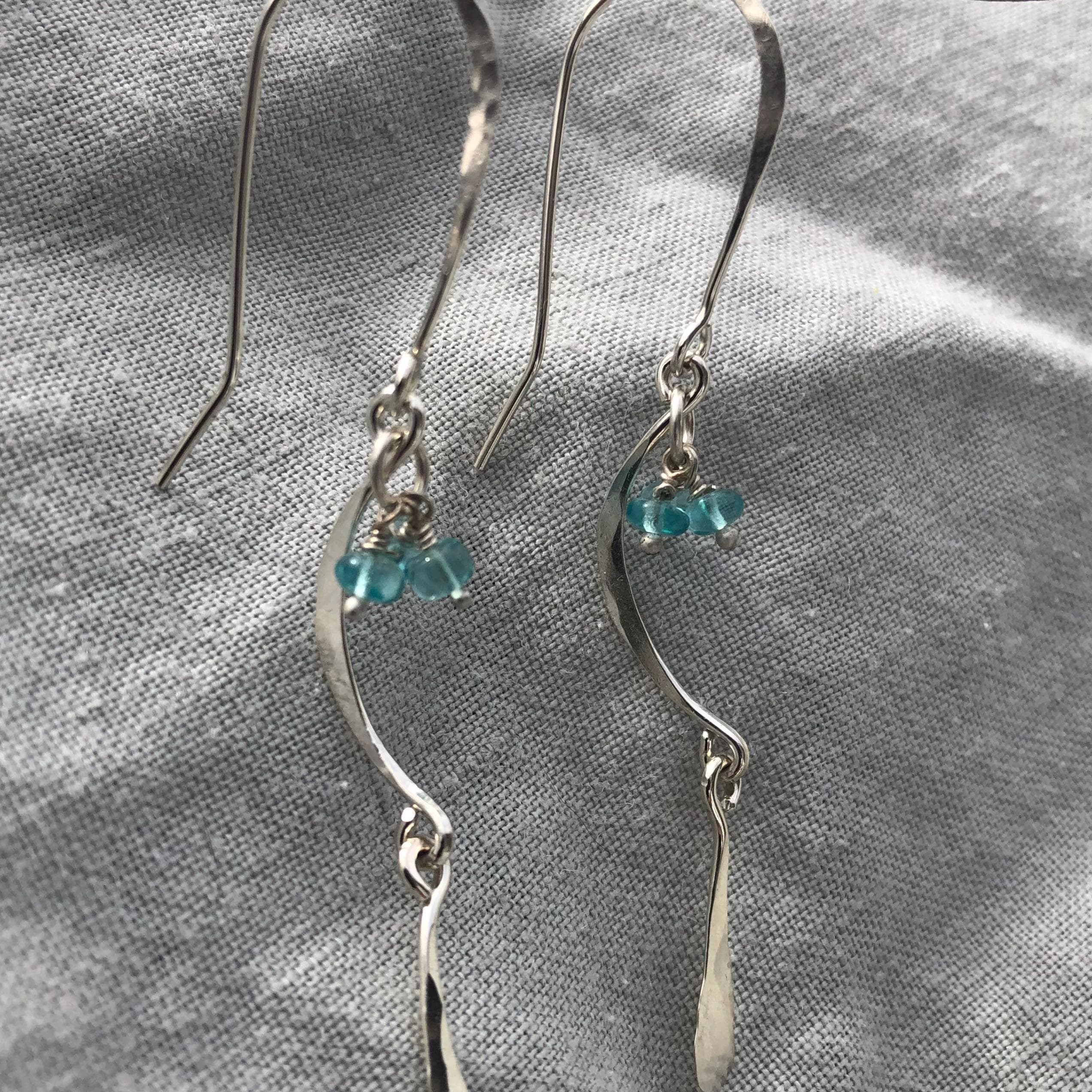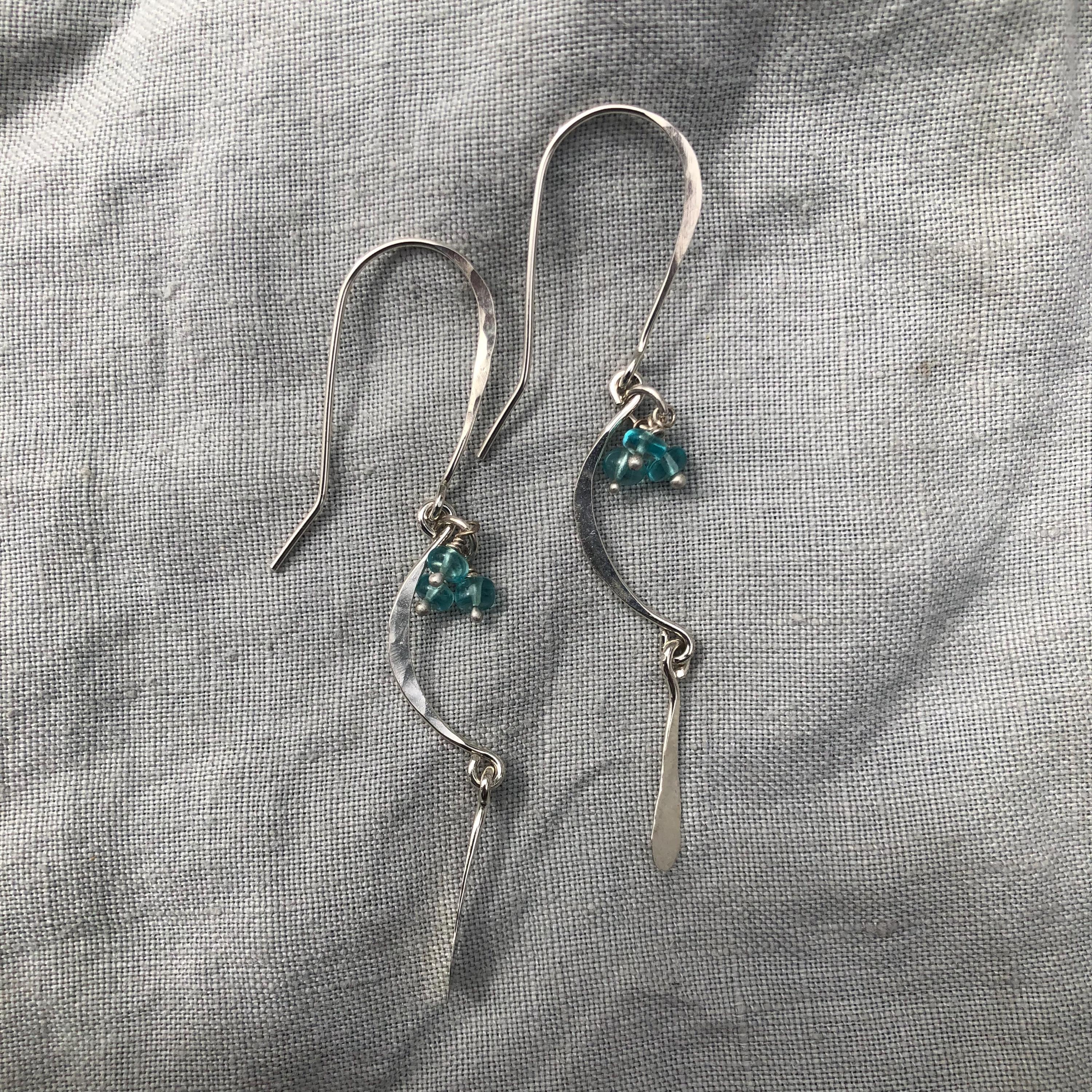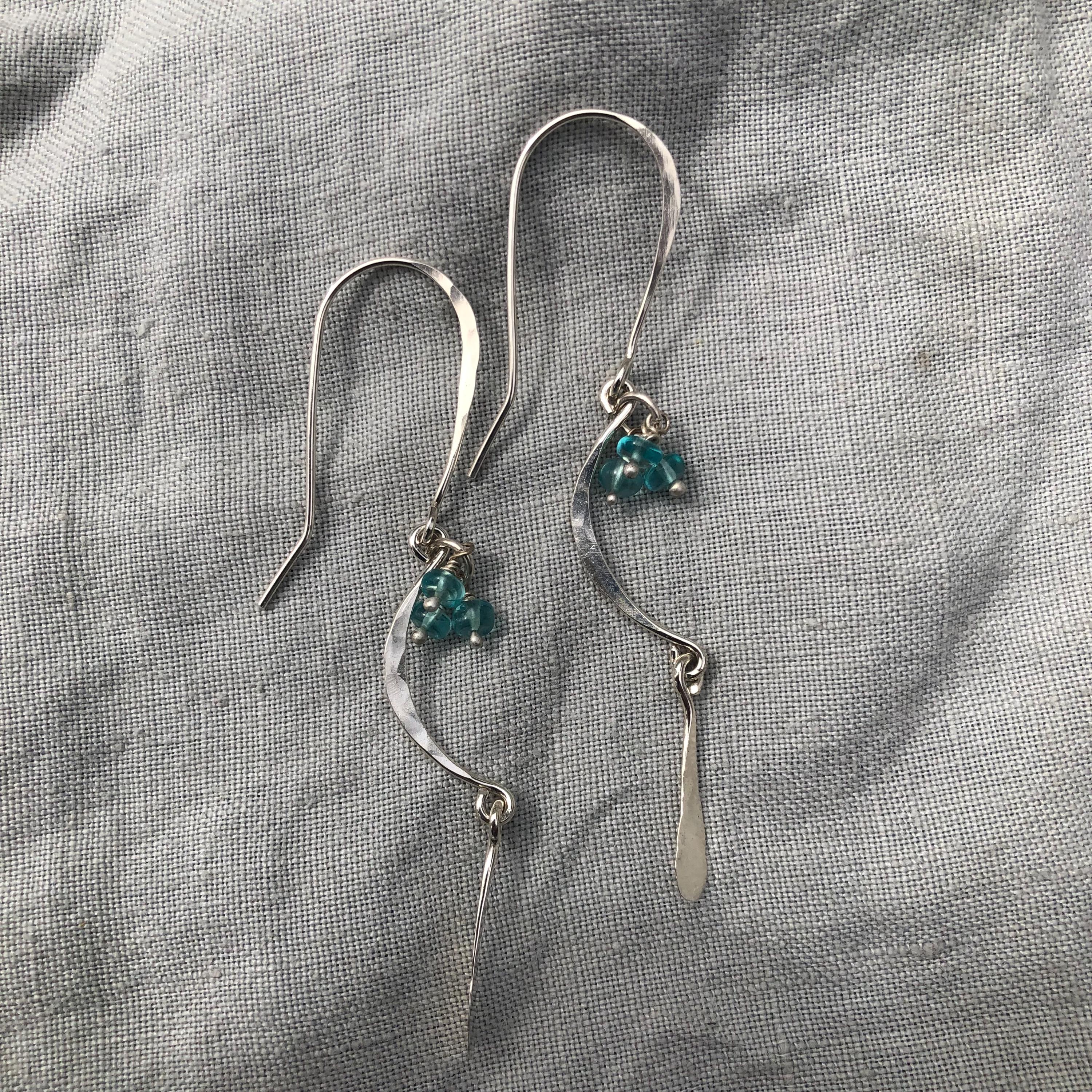 Bright blue apatite is one of my favorite stones for earrings. Blue with just a touch of green, it is cheery and wearable. These earrings are entirely handmade by me in my Clinton, CT studio. They are lightweight, with an organic geometry and sinuous movement.