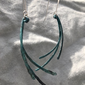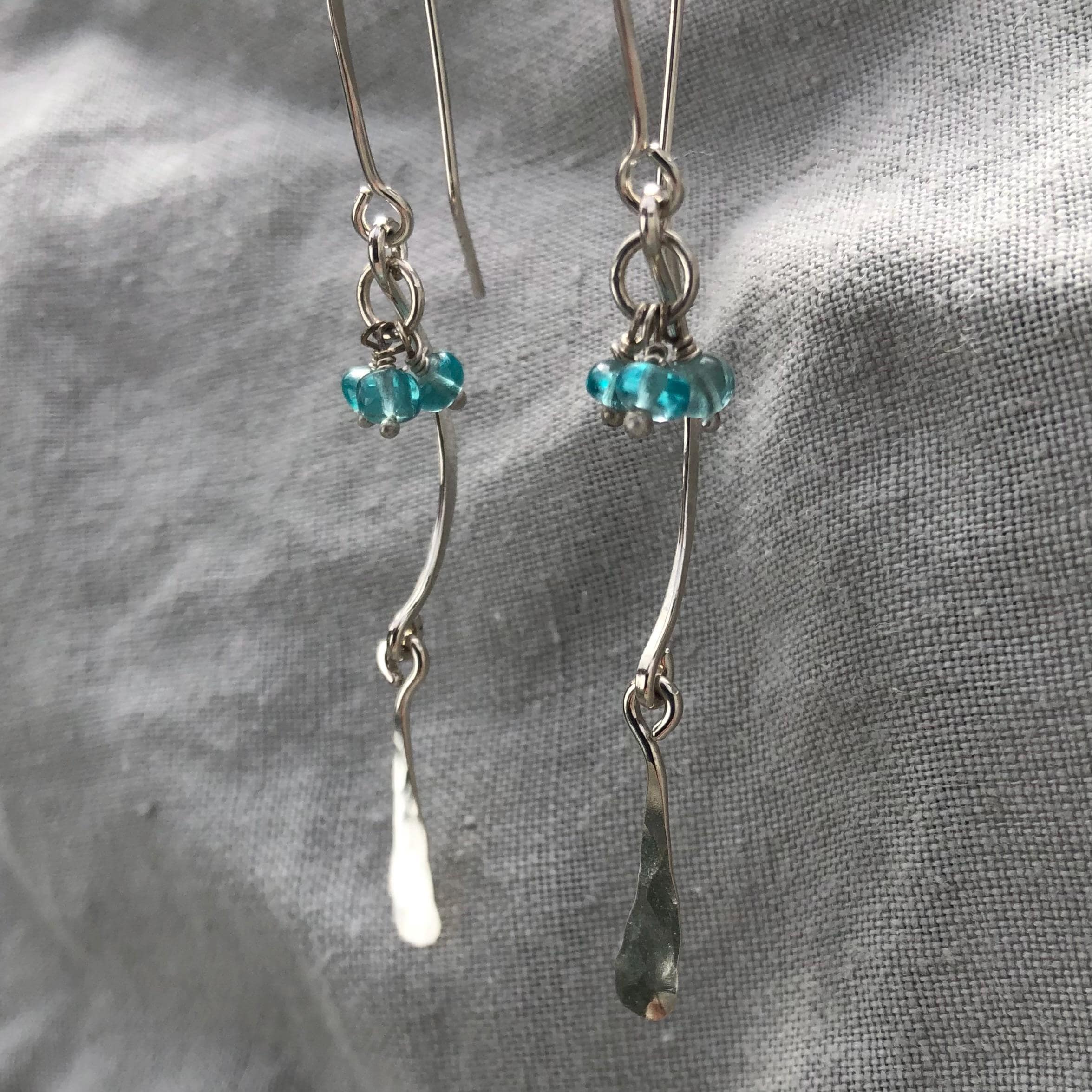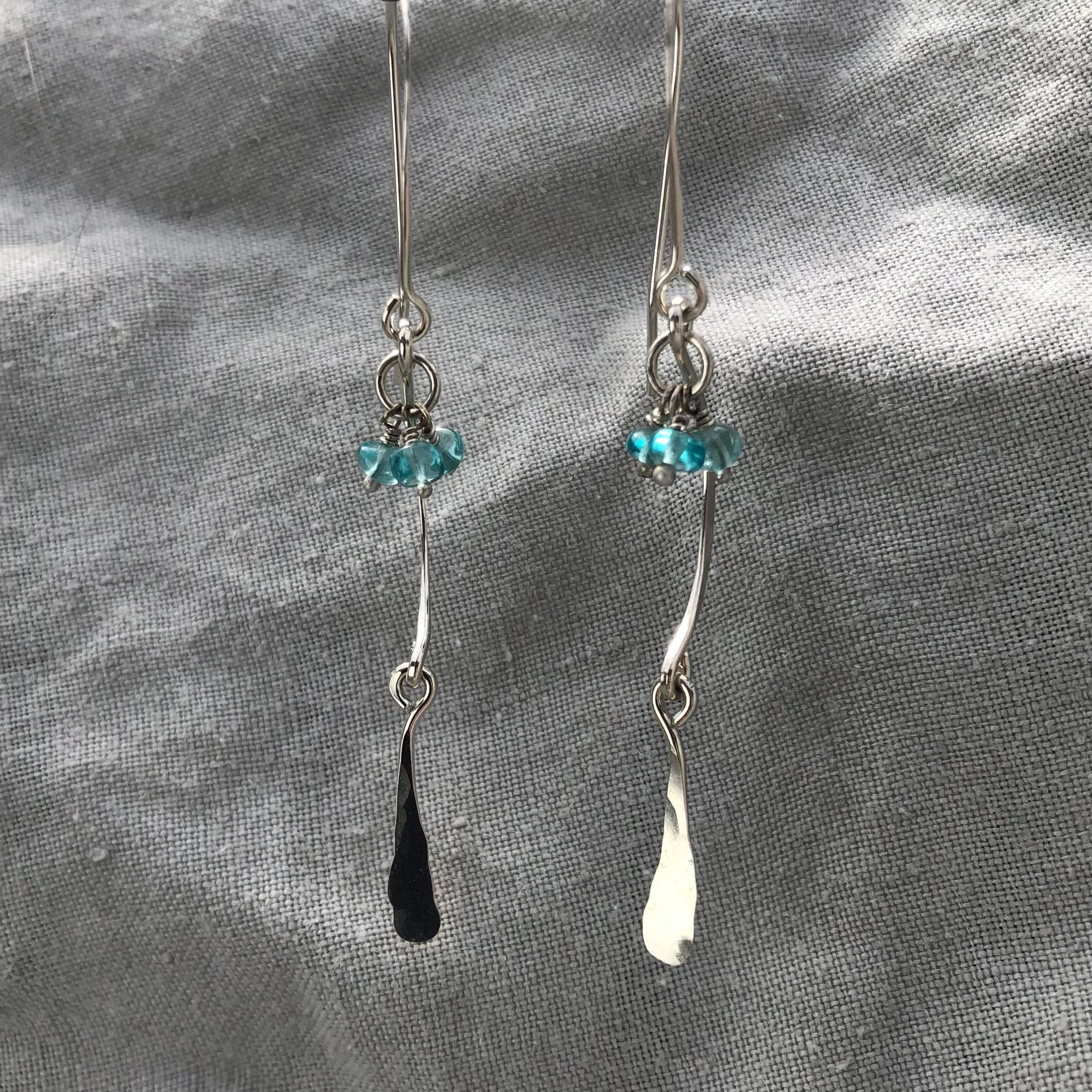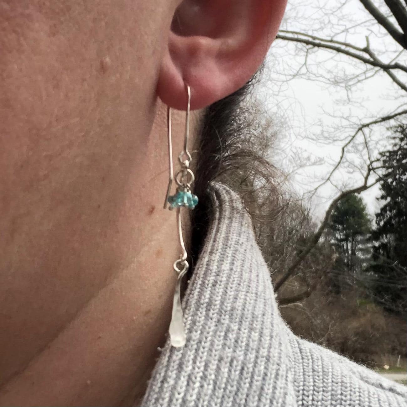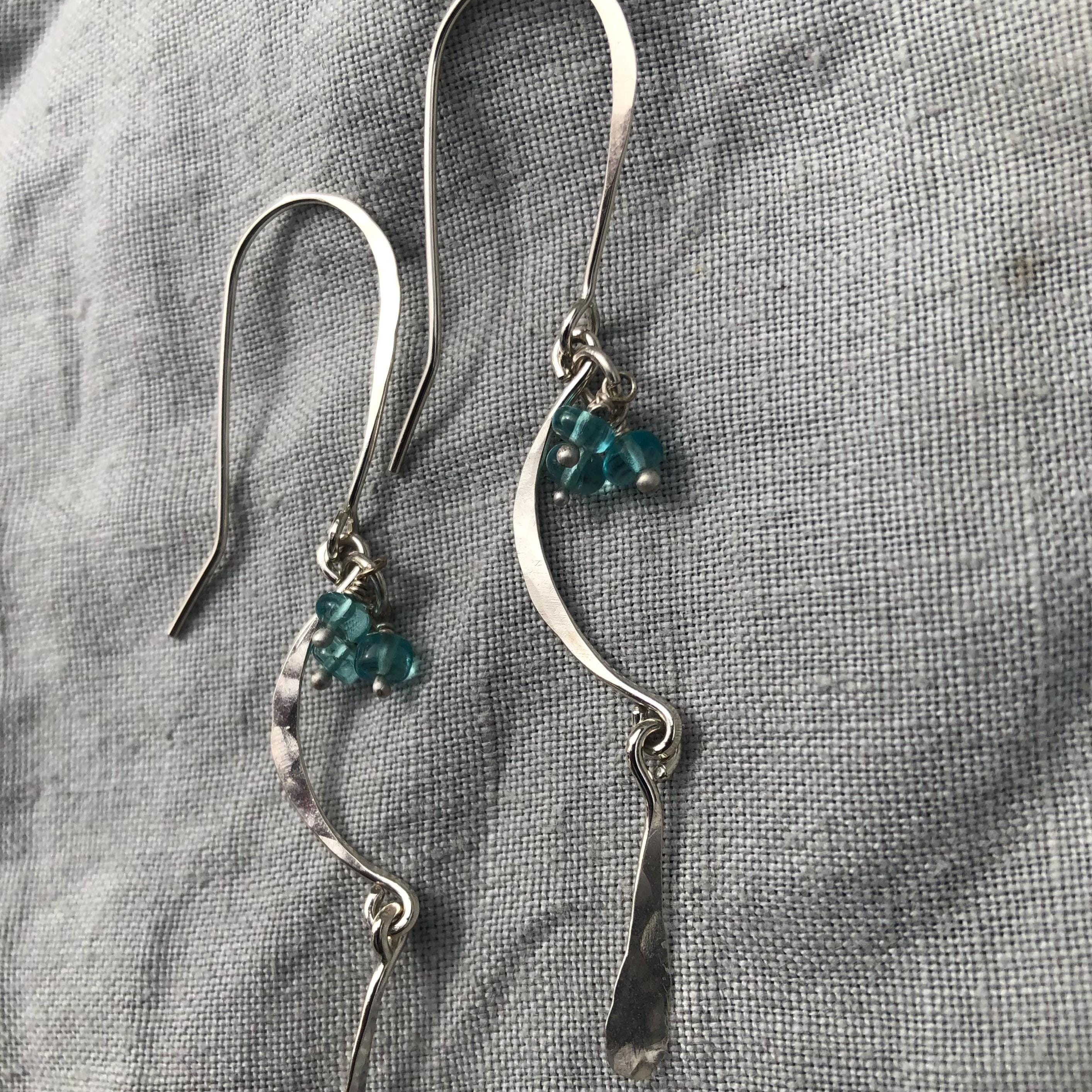 Bright blue apatite is one of my favorite stones for earrings. Blue with just a touch of green, it is cheery and wearable. These earrings are entirely handmade by me in my Clinton, CT studio. They are lightweight, with an organic geometry and sinuous movement.