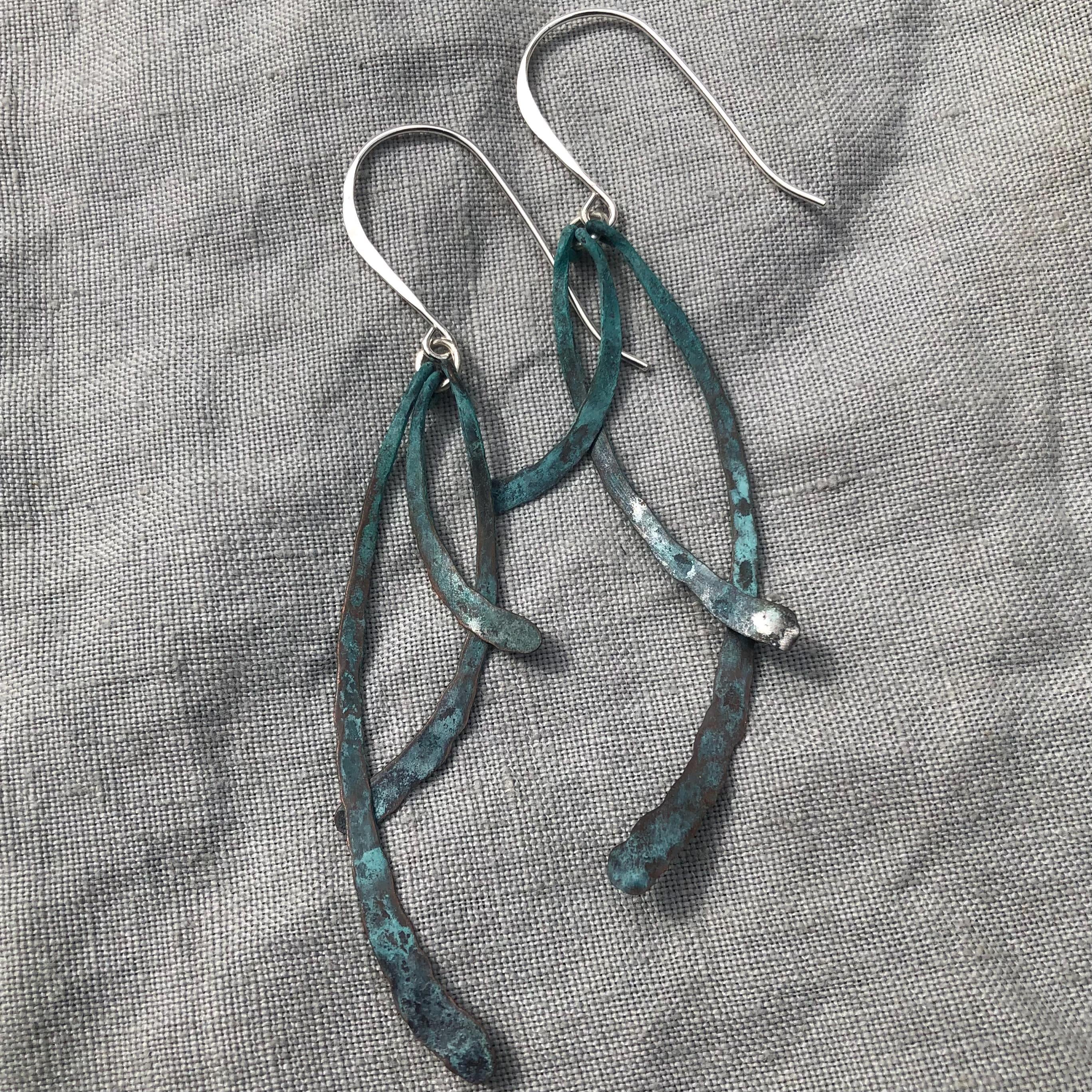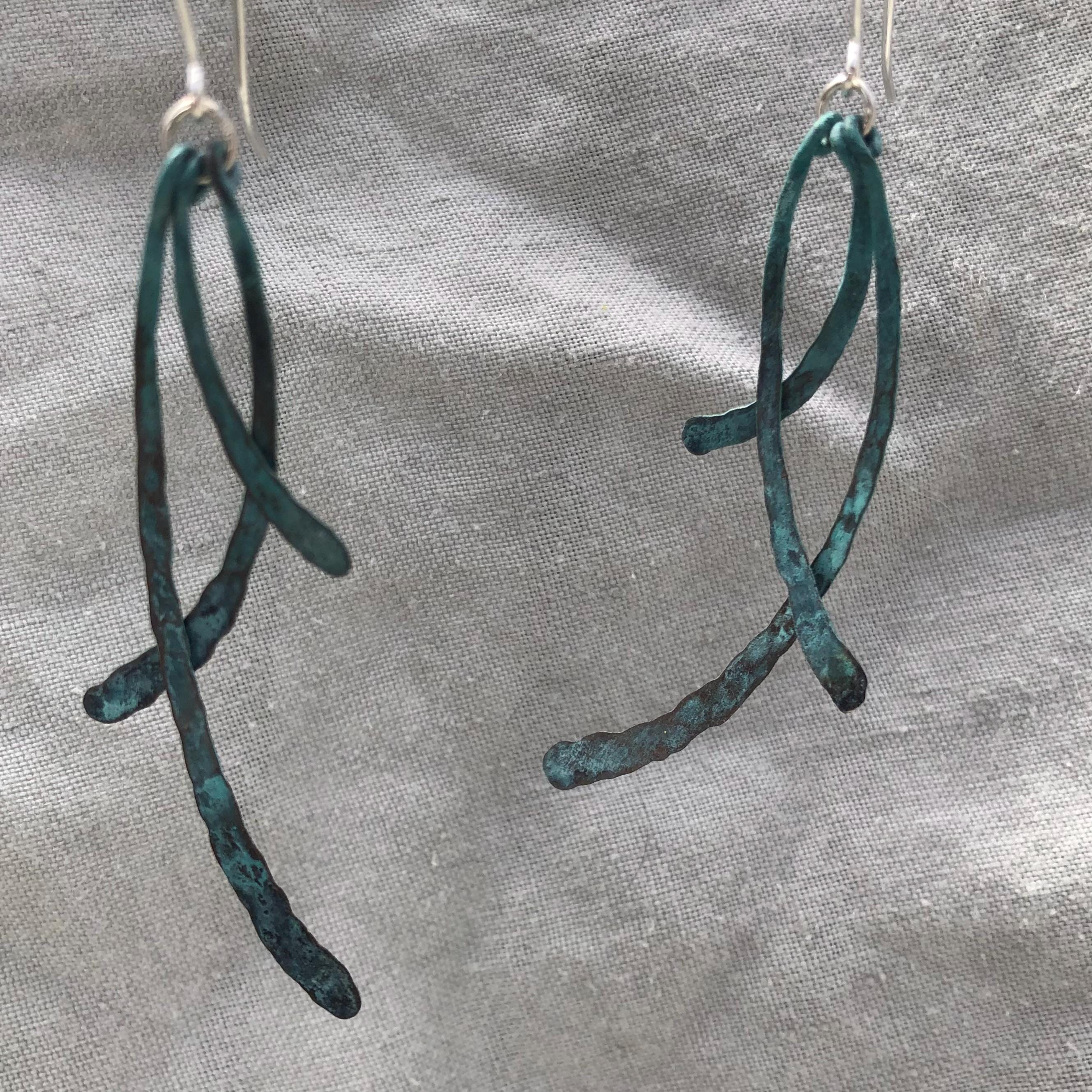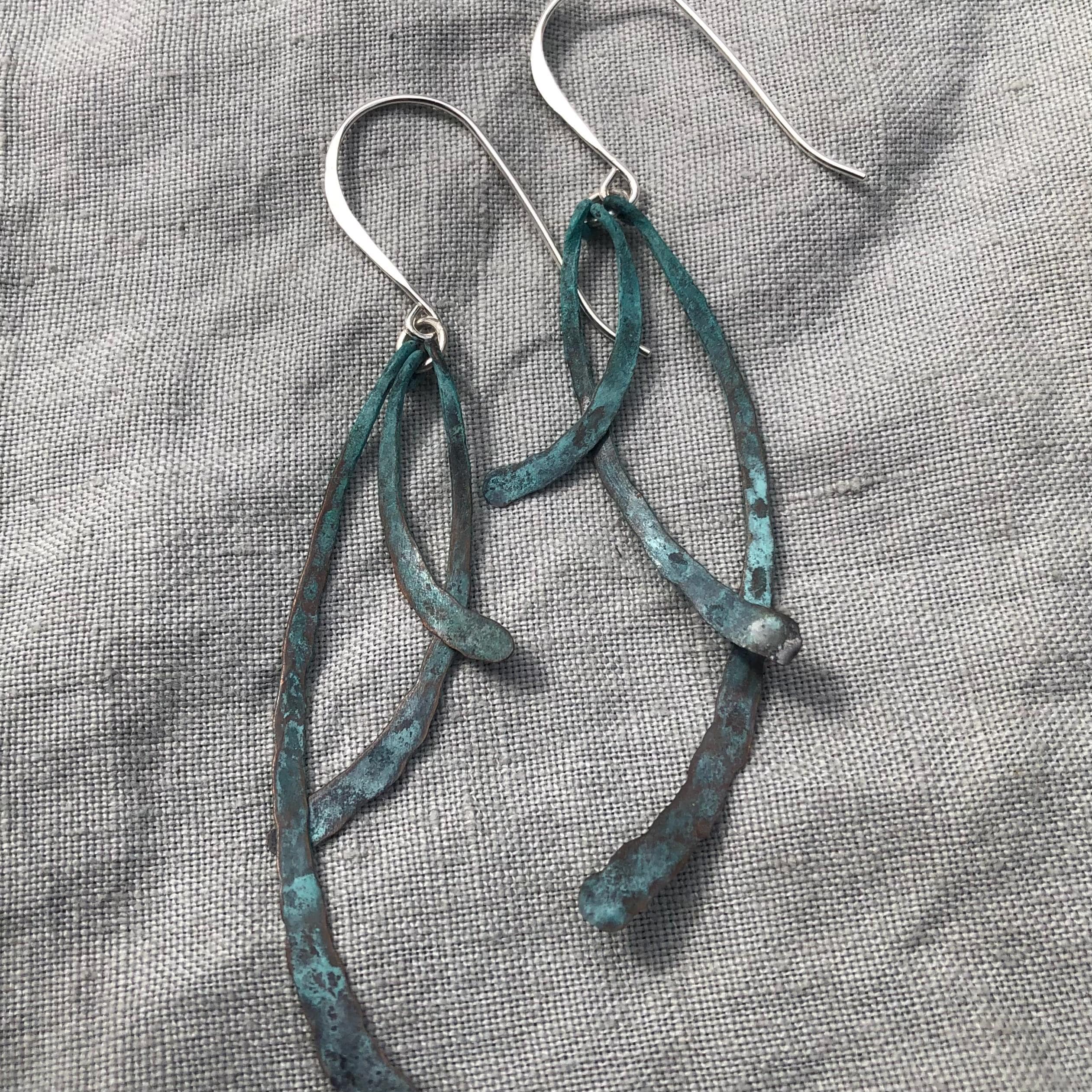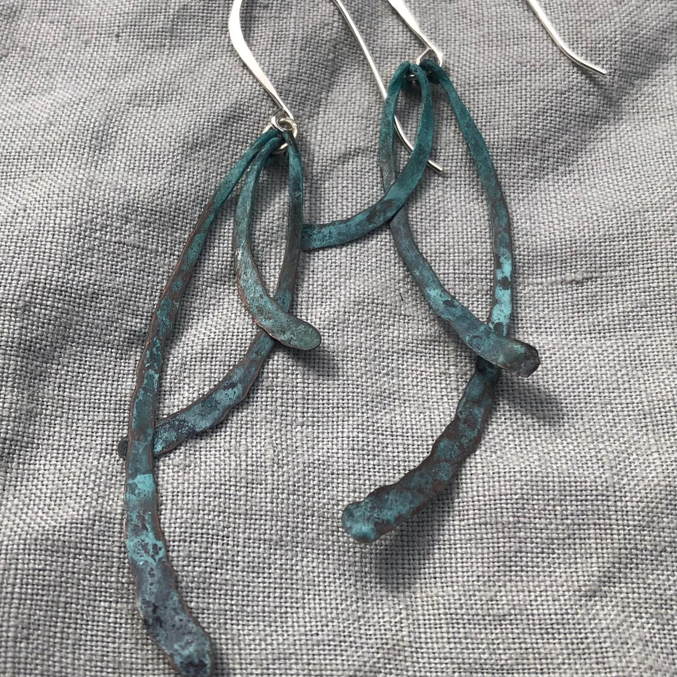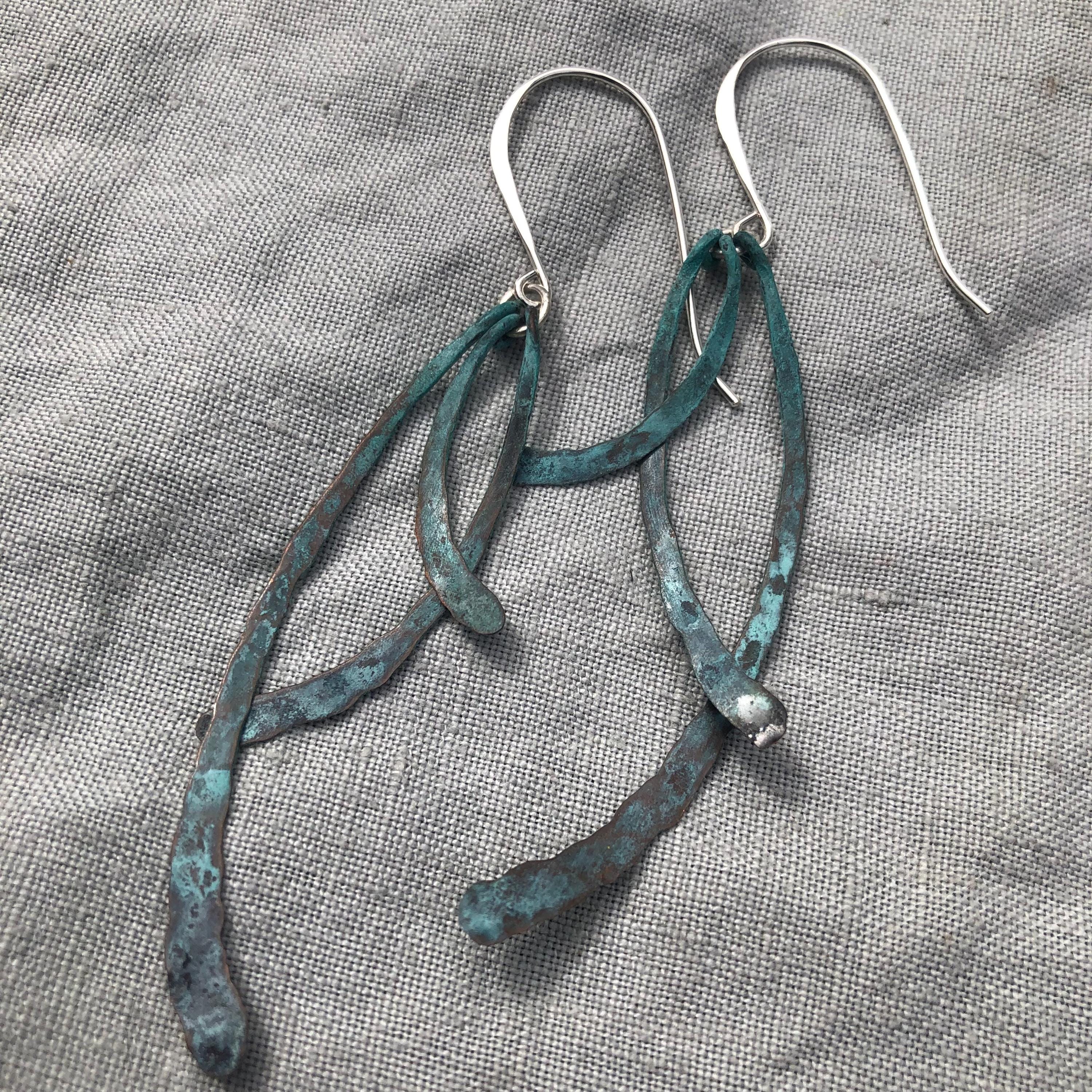 Hand-hammered copper moves in two directions in these unique earrings. Designed and entirely handmade by me in my Connecticut studio. The verdigris patina is permanent and sealed with a museum-quality sealant so it won't come off on your skin. The ear wires are hypoallergenic argentium sterling silver.