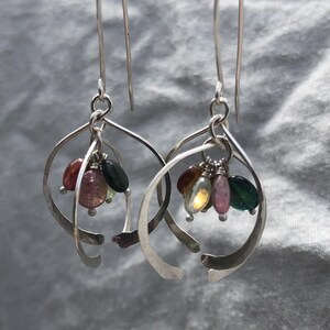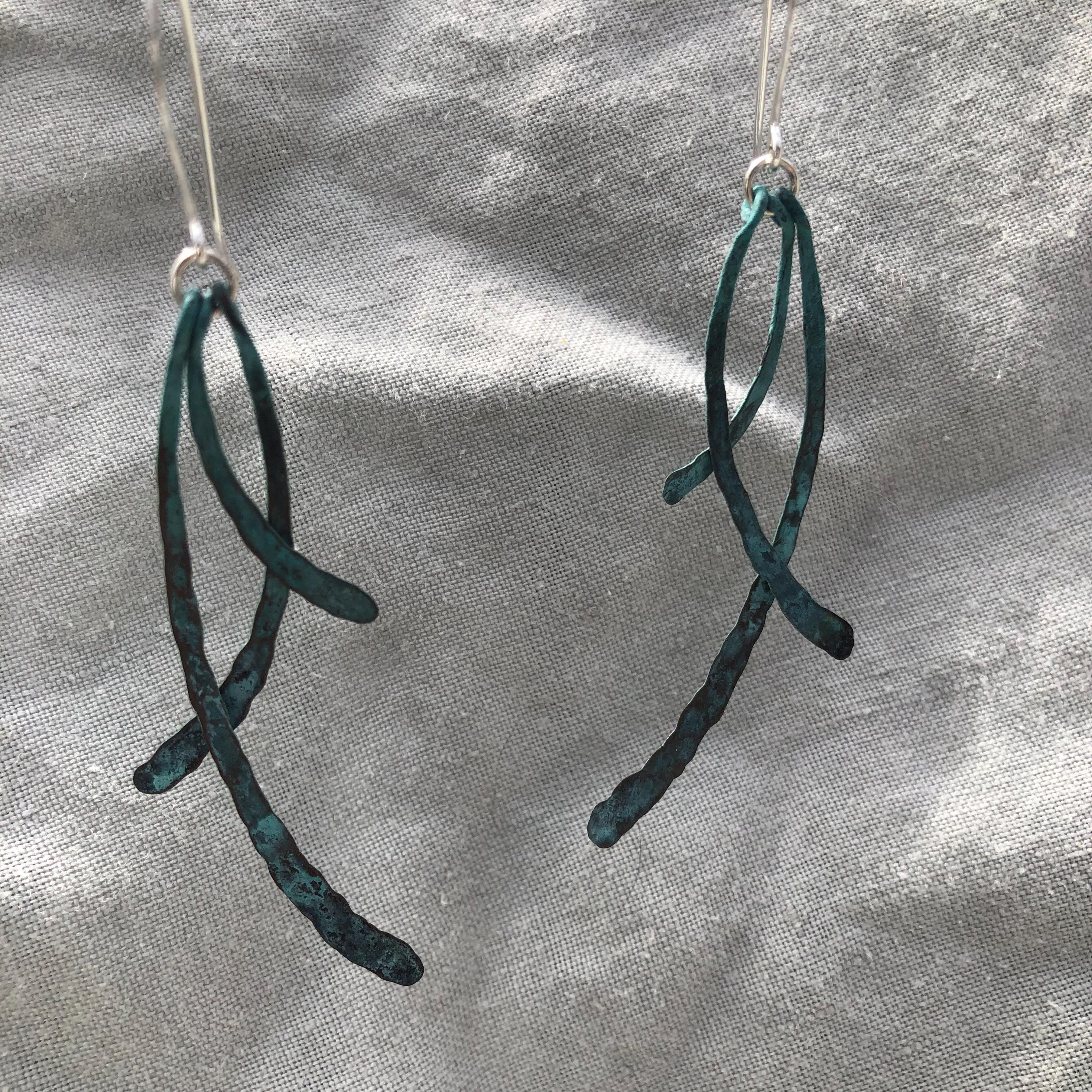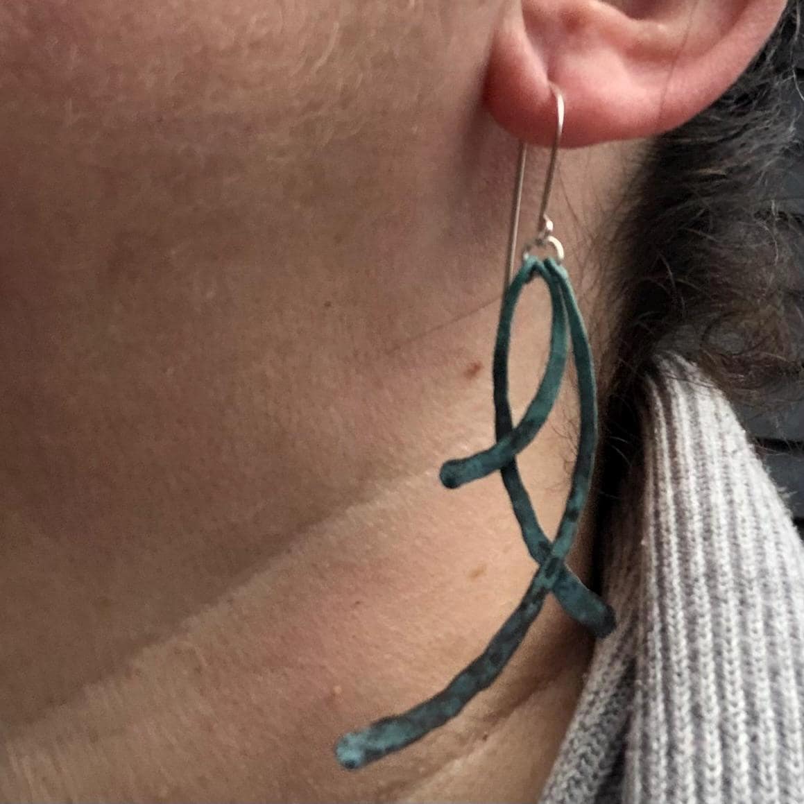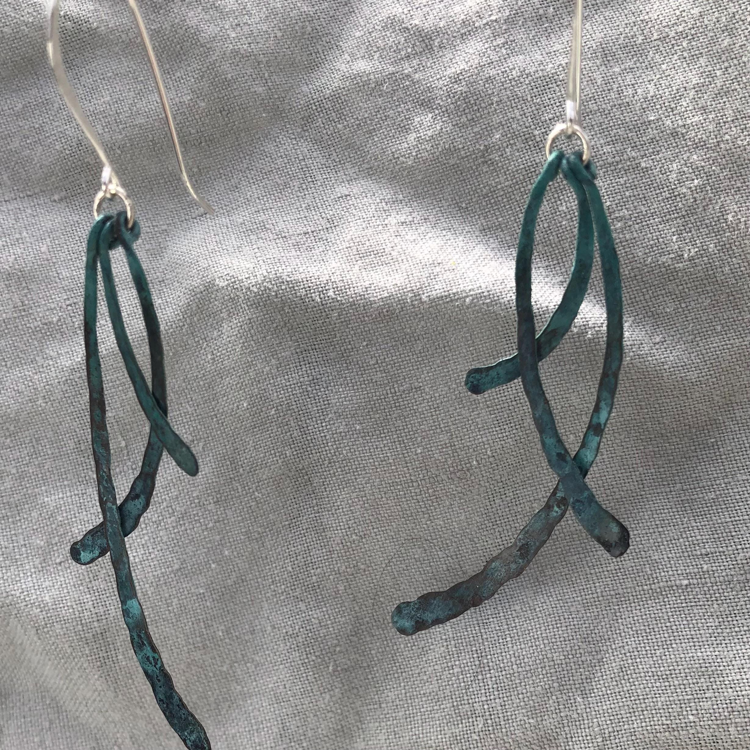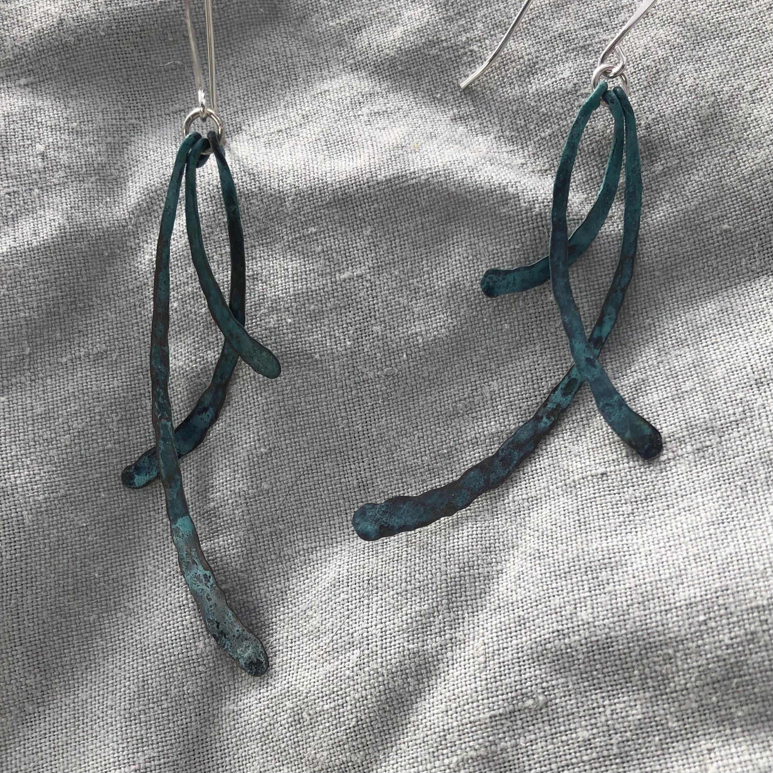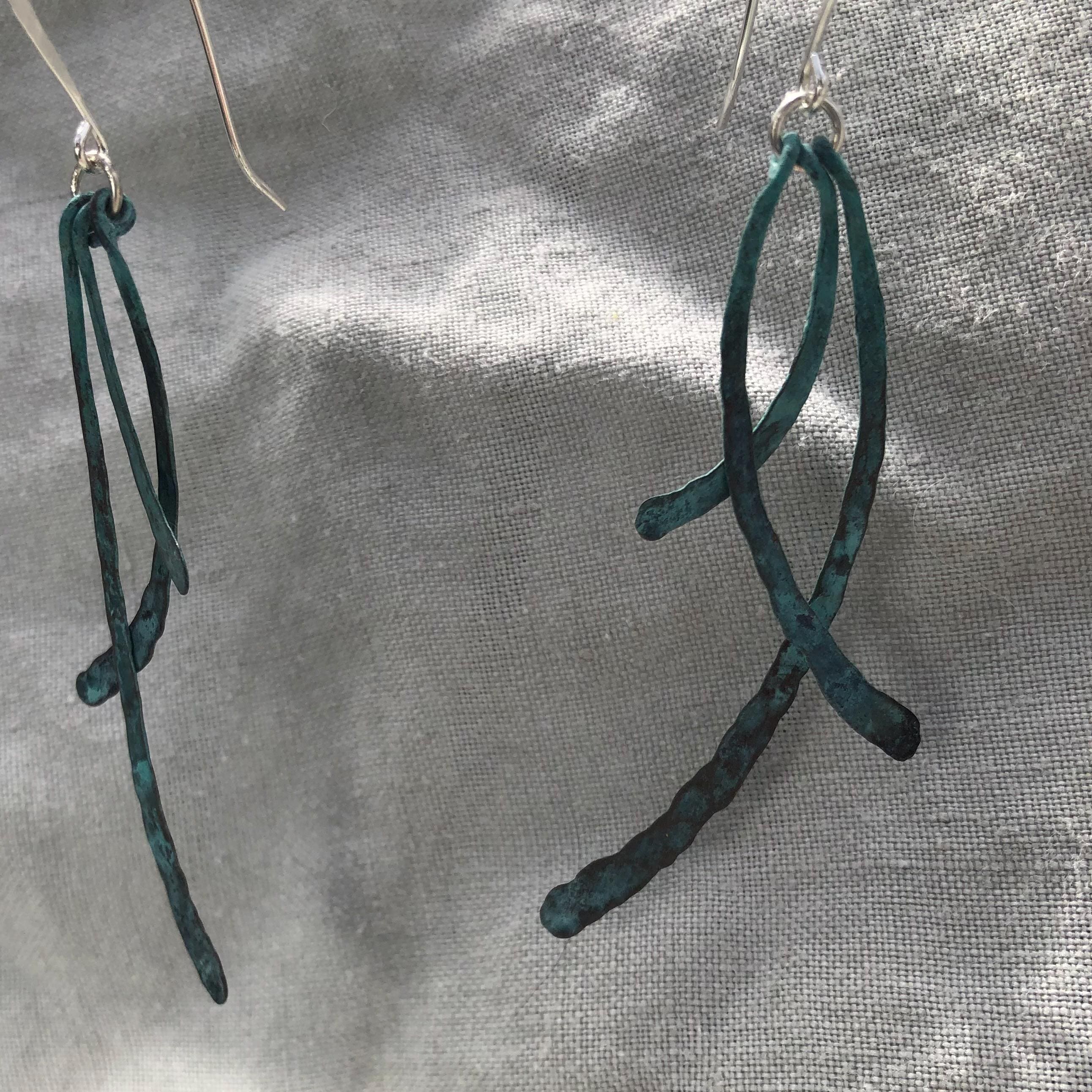 Hand-hammered copper moves in two directions in these unique earrings. Designed and entirely handmade by me in my Connecticut studio. The verdigris patina is permanent and sealed with a museum-quality sealant so it won't come off on your skin. The ear wires are hypoallergenic argentium sterling silver.